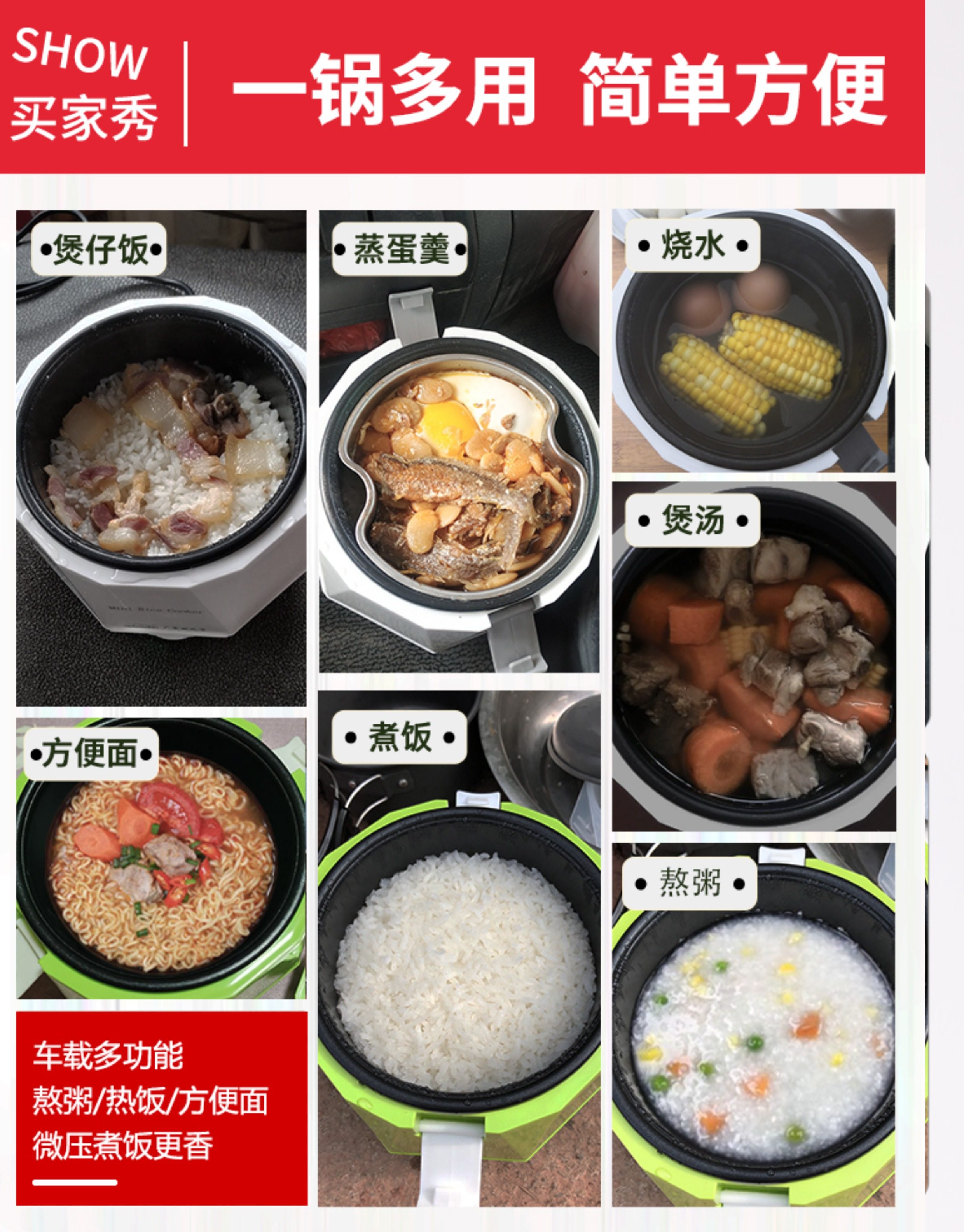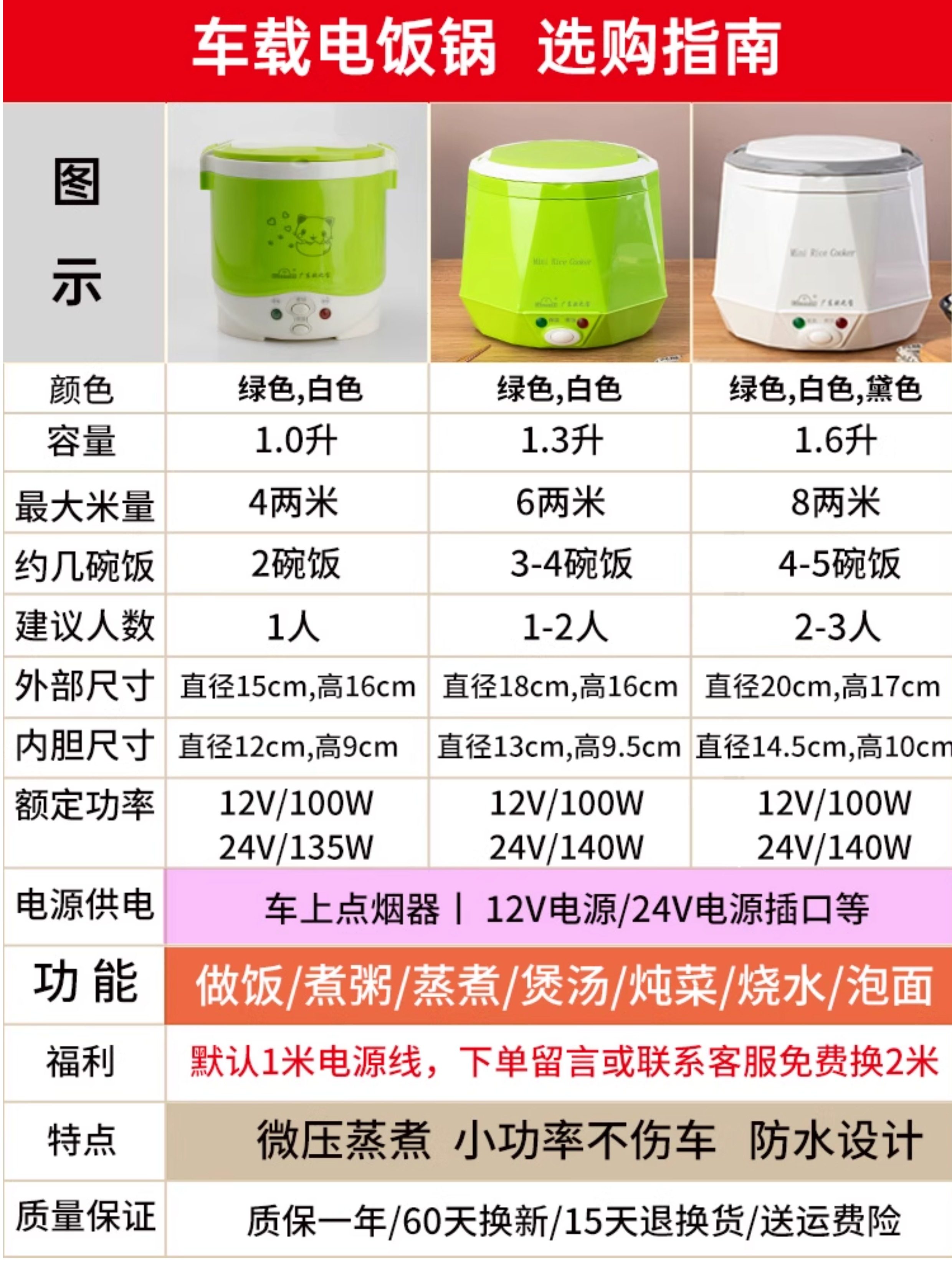 | Color Classification | 12V Small Car 1.3 Liters White [Can Cook 3 Bowls of Rice],12V Small Car 1.3 Liters Green [Can Cook 3 Bowls of Rice],12V Small Car 1.6 Liters White [Can Cook 4 Bowls of Rice],12V Small Car 1.6 Liters Dark Color [Can Cook 4 Bowls of Rice],12V Small Car 1.0 Liter Green [Can Cook 2 Bowls of Rice],12V/220V Dual-Purpose 1.6 Liters for Car and Home [Can Cook 4 Bowls of Rice],24V Truck 1.6 Liters Dark Color [Can Cook 4 Bowls of Rice],24V Truck 1.6 Liters White [Can Cook 4 Bowls of Rice],24V Truck 1.0L Green [Can Cook 2 Bowls of Rice],24V Truck 1.3 Liters White [Can Cook 3 Bowls of Rice],24V Truck 1.3 Liters Green [Can Cook 3 Bowls of Rice],24V Truck 1.6 Liters Green [Can Cook 4 Bowls of Rice],24V Truck 1.6L Dark Green [Can Cook 4 Bowls of Rice],24V Truck 2.0L Black [Can Cook 5 Bowls of Rice],24V Truck 3.0L Black [Can Cook 7 Bowls of Rice],24V/220V Dual-Purpose for Car and Home, 1.6 Liters [Can Cook 4 Bowls of Rice],24V/220V Dual-Purpose for Car and Home 2.0 Liters [Can Cook 5 Bowls of Rice],24V Truck 1.0L White [Can Cook 2 Bowls of Rice],24V Truck 1.2 Liters Green [Can Cook 2 Bowls of Rice],12V Small Car 1.0 Liter White [Can Cook 2 Bowls of Rice],12V Small Car 1.2 Liters Green [Can Cook 3 Bowls of Rice],12V/220V Dual-Purpose for Car and Home 2.0 Liters [Can Cook 5 Bowls of Rice],220V 1.5L Green★Original Vehicle Inverter Dedicated,- |