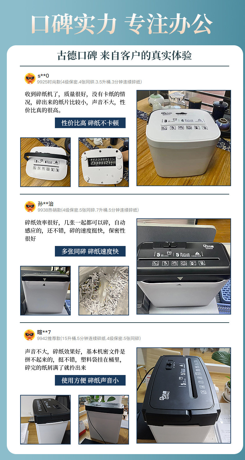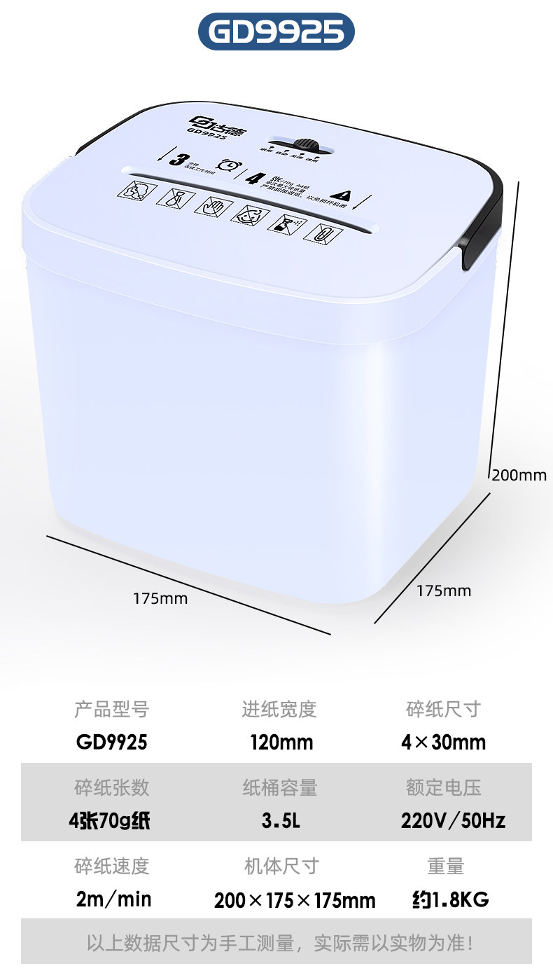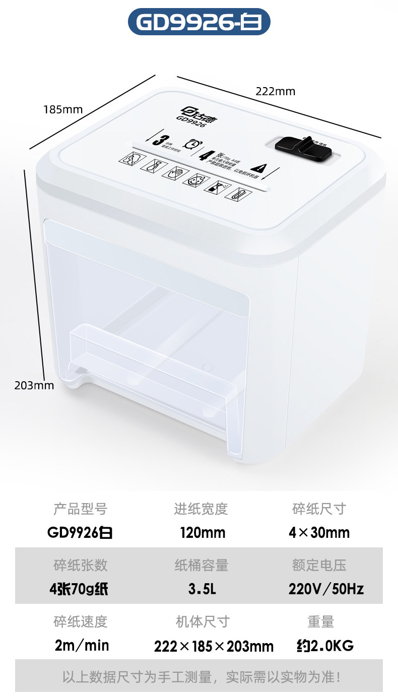 | Color Classification | 45% Choose❤9942 Recommended Model (Level 4 Confidentiality.5 Pieces of the Same Size.15 Liter Barrel.Continuous Shredding for 5 Minutes),9946 Intelligent Type (Level 4 Confidentiality.5 Pieces of the Same Size.12 Liter Barrel.Continuous Shredding for 5 Minutes),9938 Hot-Selling Model (Level 4 Confidentiality.5 Pieces of the Same Size.7 Liter Bucket.Continuous Shredding for 5 Minutes),9939 Upgraded Model (Level 4 Confidentiality.6 Pieces of the Same Size.11 Liter Barrel.Continuous Shredding for 5 Minutes),9925 Fashion Model (Level 4 Confidentiality.4 Pieces of the Same Size.3.5 Liter Bucket.Continuous Shredding for 3 Minutes),9926 Fashion Black (Level 4 Confidentiality.4 Pieces of the Same Size.3.5 Liter Bucket.Continuous Shredding for 3 Minutes),9926 Popular White (Level 4 Confidentiality.4 Pieces of the Same Size.3.5 Liter Bucket.Continuous Shredding for 3 Minutes),9952 High Performance (Level 5 Confidentiality.6 Pieces of the Same Size.18 Liter Barrel.40 Minutes of Continuous Shredding),The Higher the Confidentiality Level, the Smaller the Shredded Paper Size. Intelligent Model, Efficient Shredding. |