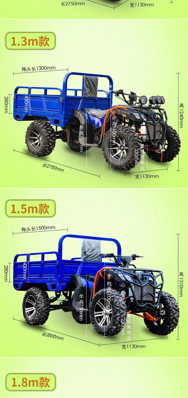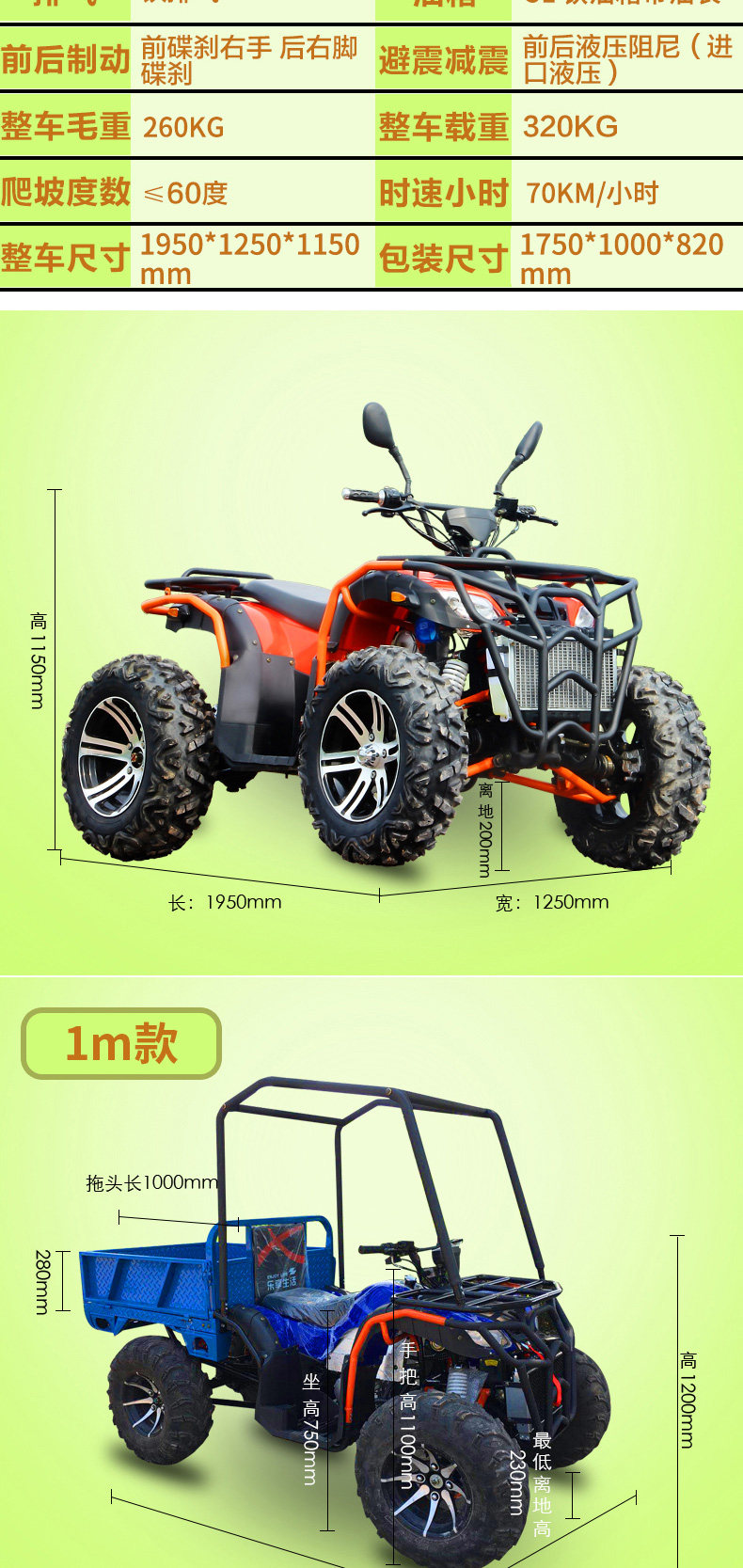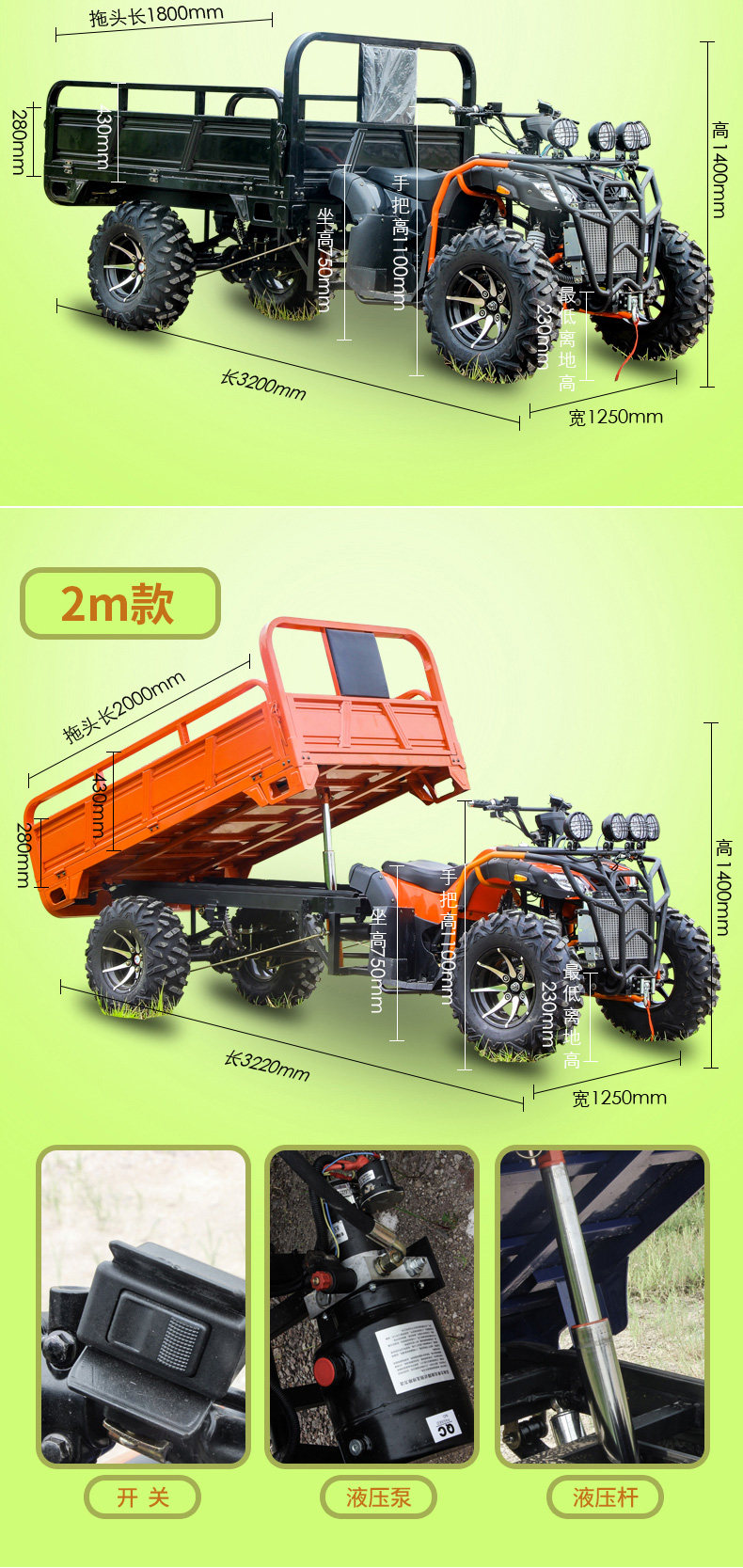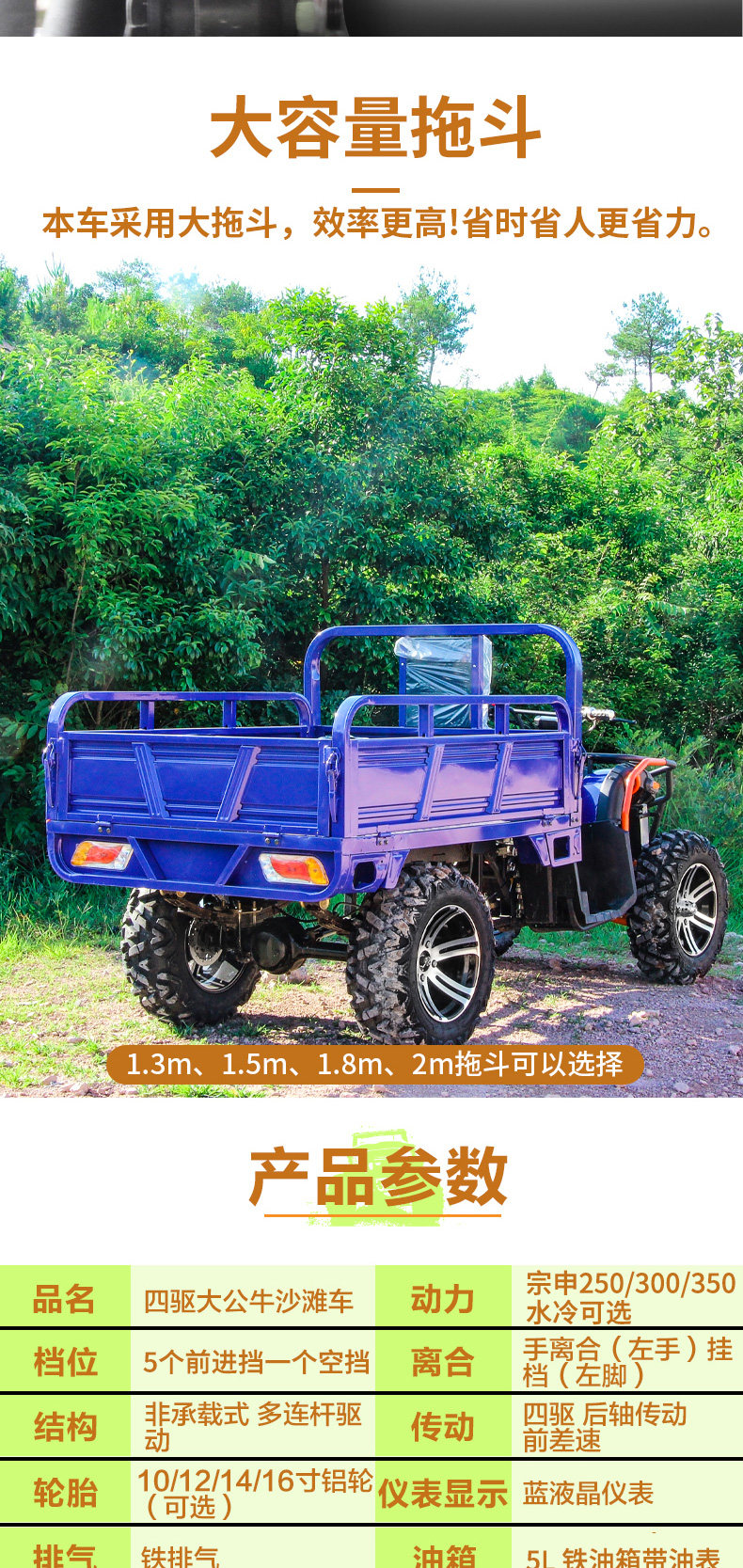 | Color Classification | One/Four-Wheel Drive/Zongshen 250 Water-Cooled/10inch/Disc Brake/Four Network Lights/Lcd Instrument/Shockproof Frame,Two/Four-Wheel Drive/Zongshen 250 Water-Cooled/ 12inch /Disc Brake/Four Network Lights/Lcd Instrument/Shock-Proof Frame,Three/Four-Wheel Drive/Zongshen 300 Water-Cooled/ 12inch /Disc Brake/Four Network Lights/Lcd Instrument/Shockproof Frame,Four/Four-Wheel Drive/Zongshen 350 Water-Cooled/ 12inch /Disc Brake/Four Network Lights/Lcd Instrument/Shockproof Frame,Five/Four-Wheel Drive/Zongshen 250 Water-Cooled/ 10inch / 1m Bucket/Four Network Lights/Lcd Instrument/Shockproof Frame,Six/Four-Wheel Drive/Zongshen 250 Water-Cooled/ 12inch / 1.5m Bucket/Four Network Lights/Lcd Instrument/Shockproof Frame,7/4-Wheel Drive/Zongshen 300 Water-Cooled/ 12inch / 1.5m Bucket/Four Network Lights/Lcd Instrument/Shockproof Frame,Eight/Four-Wheel Drive/Zongshen 300 Water-Cooled/ 12inch / 1.8m Buckets/Four Network Lights/Lcd Instrument/Hydraulic Dump,Nine/Four-Wheel Drive/Zongshen 300 Water-Cooled/ 12inch / 2m Buckets/Four Network Lights/Lcd Instrument/Hydraulic Dump,Prepayment, Balance Payment |