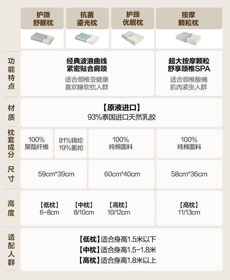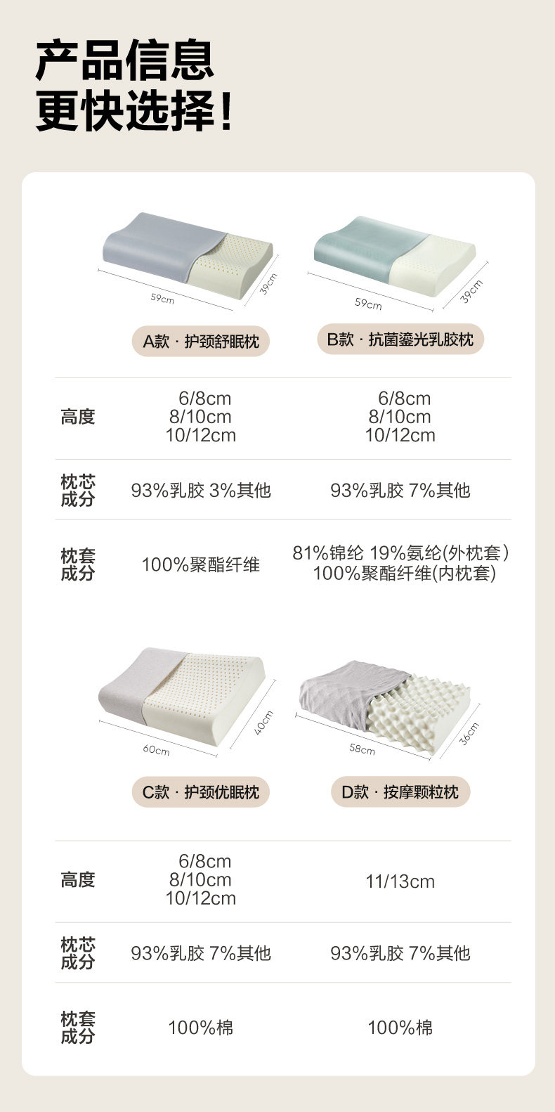 | Color Classification | Low Pillow/Single Pillow [Class a Antibacterial Pillowcase + 93% Latex Content] Wave Neck Support for Comfortable Sleep,Medium Pillow/Single Pillow [Class a Antibacterial Pillowcase + 93% Latex Content] Wave Neck Support Comfort Sleep Pillow,High Pillow/Single Pillow [Class a Antibacterial Pillowcase + 93% Latex Content] Wave-Shaped Neck Support for Comfortable Sleep,Low Pillow/Pair of Pillows [Class a Antibacterial Pillowcase + 93% Latex Content] Wave Neck Support Comfort Sleep Model,Medium Pillow/Pair of Pillows [Class a Antibacterial Pillowcase + 93% Latex Content] Wave Neck Support Comfort Sleep Model,High Pillow/Pair of Pillows [Class a Antibacterial Pillowcase + 93% Latex Content] Wave Neck Support Comfort Sleep Model,Low Pillow/Single Pillow [Cooling Class a Antibacterial Pillowcase + 93% Latex Content] Glazed Neck Support Comfort Sleep Edition,Medium Pillow/Single Pillow [Cooling Class a Antibacterial Pillowcase + 93% Latex Content] Glazed Neck Support Comfort Sleep Edition,High Pillow/Single Pillow [Cooling Class a Antibacterial Pillowcase + 93% Latex Content] Glazed Neck Support Comfort Sleep Edition,Low Pillow/Pair of Pillows [Cooling Class a Antibacterial Pillowcase + 93% Latex Content] Glazed Neck Support Comfort Sleep Style,Medium Pillow/Pair of Pillows [Cooling Class a Antibacterial Pillowcase + 93% Latex Content] Glazed Neck Support Comfort Sleep Style,High Pillow/Pair of Pillows [Cooling Class a Antibacterial Pillowcase + 93% Latex Content] Glazed Neck Support Comfort Sleep Style,Low Pillow/Single Pillow [100% Cotton Pillowcase + 93% Latex Content] Wave-Shaped Neck Support for Superior Sleep,Medium Pillow/Single Pillow [100% Cotton Pillowcase + 93% Latex Content] Wave-Shaped Neck Support for Superior Sleep,High Pillow/Single Pillow [100% Cotton Pillowcase + 93% Latex Content] Wave-Shaped Neck Support for Superior Sleep,Low Pillow/Pair of Pillows [100% Cotton Pillowcase + 93% Latex Content] Wave-Shaped Neck Support for Superior Sleep,Medium Pillow/Pair of Pillows [100% Cotton Pillowcase + 93% Latex Content] Wave-Shaped Neck Support for Superior Sleep,High Pillow/Pair of Pillows [100% Cotton Pillowcase + 93% Latex Content] Wave Neck Support Premium Sleep Edition,High Pillow/Single Pillow [100% Cotton Pillowcase + 93% Latex Content] Massage Neck Support Pro Model |