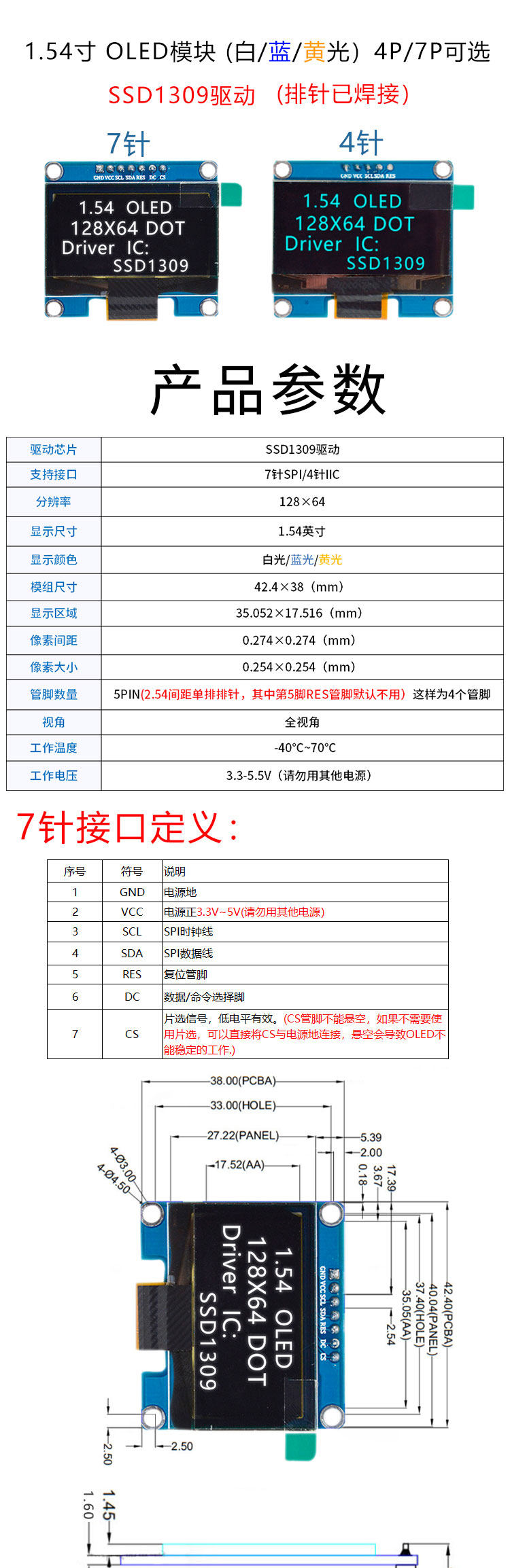 | Color Classification | 1.54inch 4-Pin Oled Display Ssd1309 White Light (1 Piece),1.54inch 4-Pin Oled Display Ssd1309 Yellow Light (1 Piece),1.54inch 4-Pin Oled Display Ssd1309 Blu-Ray (1 Piece),1.54inch 7-Pin Oled Display Ssd1309 White Light (1 Piece),1.54inch 7-Pin Oled Display Ssd1309 Yellow Light (1 Piece),1.54inch 7-Pin Oled Display Ssd1309 Blu-Ray (1 Piece),2.42inch Oled 7-Pin Display Module White (1 Piece),2.42inch Oled 7-Pin Display Module Blue (1 Piece),2.42inch Oled 7-Pin Display Module Yellow (1 Piece),2.42inch Oled 7-Pin Display Module Green (1 Piece) |