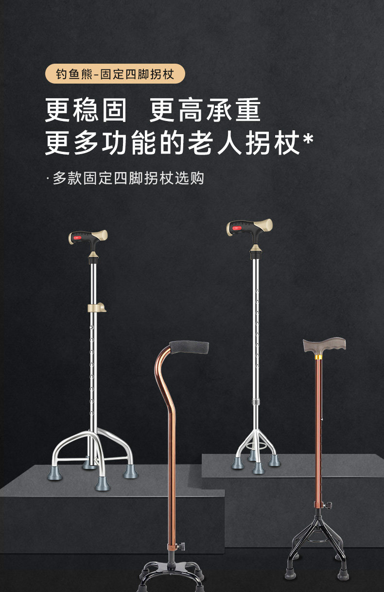 Fishing Bear Elderly Crutches Multifunctional Lightweight Walking Stick for Elderly with Large Hands, Four-Legged Anti-Slip Telescopic Four-Legged Walking Cane