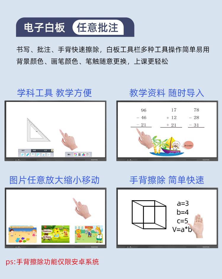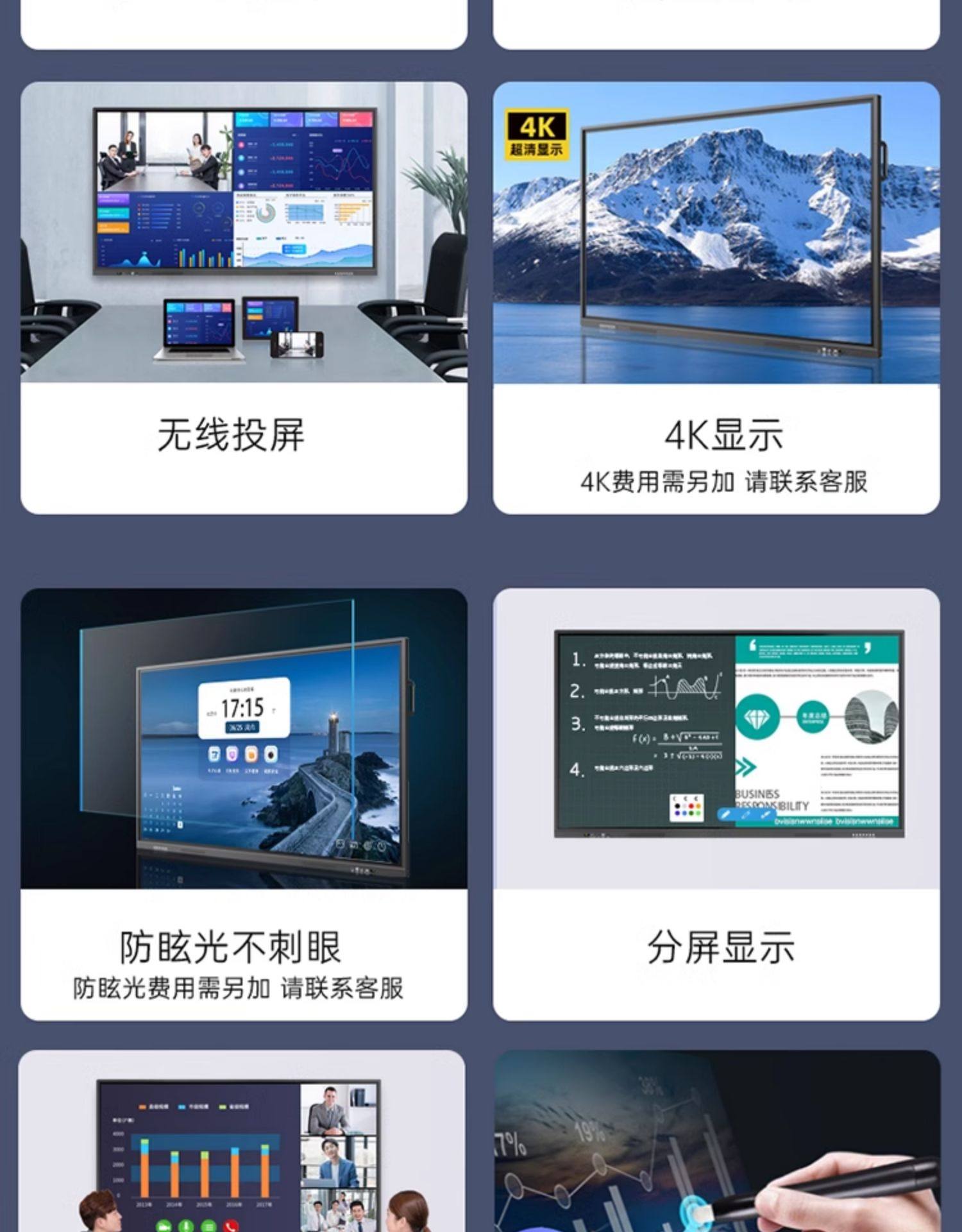 | Color Classification | Reject False Marks. We 55inch = Industry 65Led/Lcd/75Led, Etc,22inch High-End Win7 I5/8G/256G Comes with Teaching Resources,32inch High Configuration [I5/8G/256G] Comes with Teaching Resources,43inch High Configuration [I5/8G/256G] Comes with Teaching Resources,50inch High Configuration [I5/8G/256G] Comes with Teaching Resources,55inch High Configuration [I5/8G/256G] + Teaching Resources,55inch High Configuration [I5/8G/256G] Comes with Mobile Stand + Teaching Resources + Touch Pen,65inch High Configuration [I5/8G/256G] Comes with Mobile Stand + Teaching Resources + Touch Pen,75inch High Configuration [I5/8G/256G] Comes with Mobile Stand + Teaching Resources + Touch Pen,85inch High Configuration [I5/8G/256G] Comes with Mobile Stand + Teaching Resources + Touch Pen,55inch Promotion [I5/8G/256G] + Teaching Resources + Touch Pen + Retractable Pen,55inch Promotional Model [I5/8G/256G] Comes with Mobile Stand + Teaching Resources + 2 Touch Pens,65inch Promotional Model [I5/8G/256G] Comes with Mobile Stand + Teaching Resources + 2 Touch Pens,75inch Promotional Model [I5/8G/256G] Comes with Mobile Stand + Teaching Resources + 2 Touch Pens,85inch Promotional Model [I5/8G/256G] Comes with Mobile Stand + Teaching Resources + 2 Touch Pens,Top-Of-The-Line Configuration: [I7/8Gb/256Gb] Includes Mobile Stand + Instructional Resources + Stylus,Top-Of-The-Line Configuration: [I7/8Gb/256Gb] Includes Mobile Stand + Instructional Resources + Stylus,Top-Of-The-Line Configuration: [I7/8Gb/256Gb] Includes Mobile Stand + Instructional Resources + Stylus,85inch [I7/8G/256G] Comes with Mobile Stand + Teaching Resources + Touch Pen,55inch Dual System [I5 Fourth Generation 8+256G/4+32G] Comes with Mobile Stand,65inch Dual System [I5 Fourth Generation 8+256G/4+32G] Comes with Mobile Stand,75inch Dual System [I5 Fourth Generation 8+256G/4+32G] Comes with Mobile Stand,85inch Dual System [I5 Fourth Generation 8+256G/4+32G] Comes with Mobile Stand,98inch Dual System [I5 Fourth Generation 8+256G/4+32G] Comes with Mobile Stand,Android + Free Premium Mobile Stand,55inch Dual System [I7 Fourth Generation 8+256G/4+32G] 4800W Camera,55inch Dual System [I5 Fourth Generation 8+256G/4+32G] Comes with Mobile Stand + Touch Pen,65inch Dual System [I5 Fourth Generation 8+256G/4+32G] Comes with Mobile Stand + Touch Pen,75inch Dual System [I5 Fourth Generation 8+256G/4+32G] Comes with Mobile Stand + Touch Pen,85inch Dual System [I5 Fourth Generation 8+256G/4+32G]] Comes with Mobile Stand + Touch Pen,98inch Dual System [I5 Fourth Generation 8+256G/4+32G] Comes with Mobile Stand + Touch Pen,Upgraded Version 32inch Computer System [I5/8Th Generation/16G/256G] + Free Mobile Stand + Anti-Glare,Upgraded Version 43inch Computer System [I5/8Th Generation/16G/256G] + Free Mobile Stand + Anti-Glare,Upgraded Version 55inch Computer System [I5/8Th Generation/16G/256G] + Free Mobile Stand + Anti-Glare,Upgraded Version 65inch Computer System [I5/8Th Generation/16G/256G] + Free Mobile Stand + Anti-Glare,Upgraded Version 55inch [Dual System] [I5/8Th Generation/16G/256G+4G/32G]] + Free Mobile Stand + Anti-Glare,Upgraded Version 65inch [Dual System] [I5/8Th Generation/16G/256G+4G/32G] + Free Mobile Stand + Anti-Glare,Upgraded Version 75inch [Dual System] [I5/8Th Generation/16G/256G+4G/32G] + Free Mobile Stand + Anti-Glare,Upgraded Version 85inch [Dual System] [I5/8Th Generation/16G/256G+4G/32G] + Free Mobile Stand + Anti-Glare,Upgraded Version 98inch [Dual System] [I5/8Th Generation/16G/256G+4G/32G] + Free Mobile Stand + Anti-Glare,Push-Pull Blackboard + 55inch [Dual System] [I5/4Th Generation/8G/256G+4G/32G],Push-Pull Blackboard + 65inch [Dual System] [I5/4Th Generation/8G/256G+4G/32G],Push-Pull Blackboard + 75inch [Dual System] [I5/4Th Generation/8G/256G+4G/32G],Push-Pull Blackboard + 85inch [Dual System] [I5/4Th Generation/8G/256G+4G/32G],Push-Pull Blackboard + 98inch [Dual System] [I5/4Th Generation/8G/256G+4G/32G] |