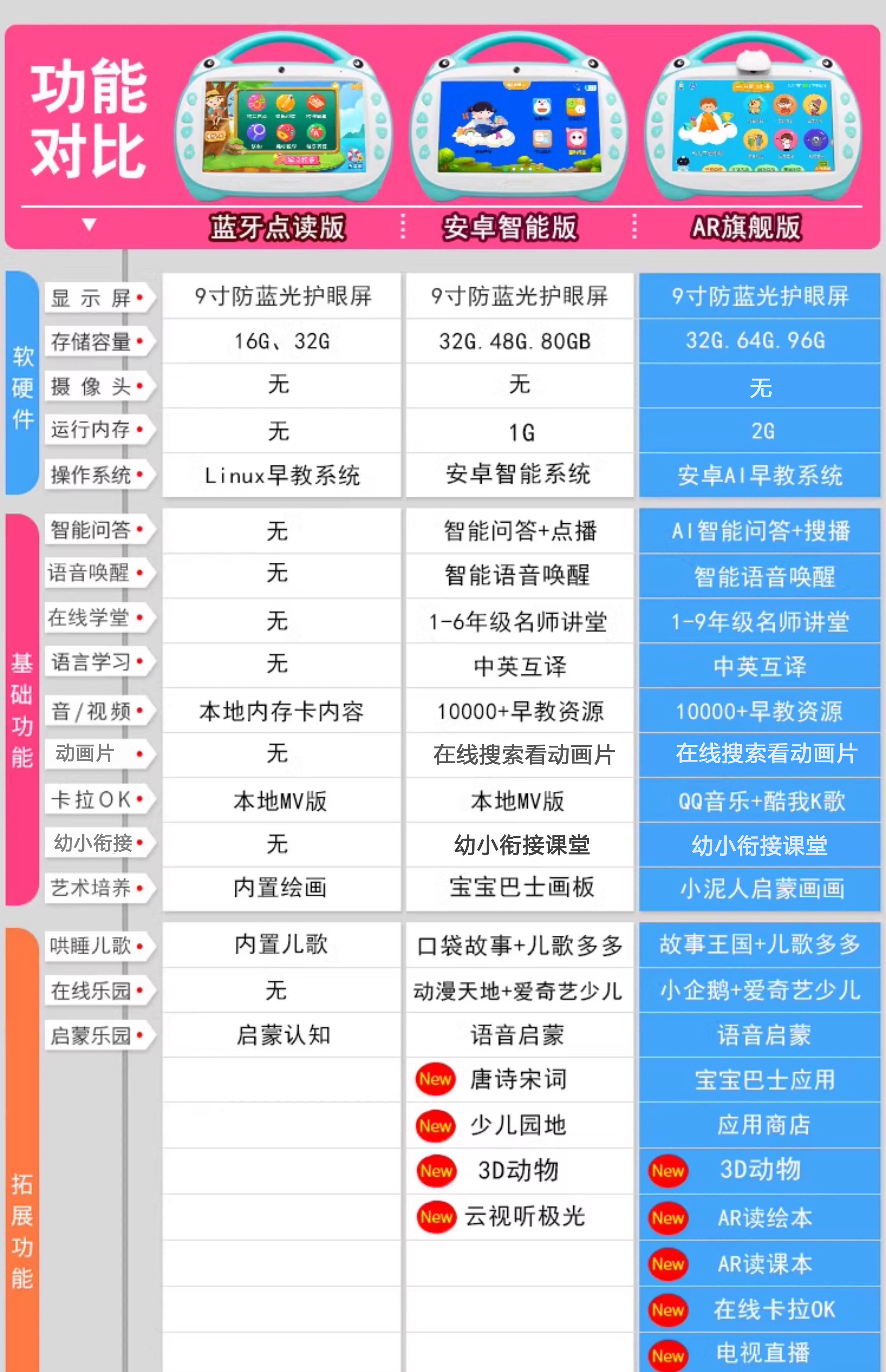 Color Classification 9inch Large Screen 80g [Yellow] Wifi Android Smart Edition Free Microphone + Anti-Fall Bag [Online Animation] Preschool Early Education + Famous Teacher Classroom,9inch Large Screen 80g [Blue] Wifi Android Smart Edition Free Microphone + Anti-Fall Bag [Online Animation] Preschool Early Education + Famous Teacher Classroom,9inch Large Screen 80g [Pink] Wifi Android Smart Edition Free Microphone + Anti-Fall Bag [Online Animation] Preschool Early Education + Famous Teacher Classroom,9inch Large Screen 48g [Yellow] Wifi Android Smart Edition Free Microphone + Anti-Fall Bag [Online Animation] Preschool Early Education + Famous Teacher Classroom,9inch Large Screen 48g [Blue] Wifi Android Smart Edition Free Microphone + Anti-Fall Bag [Online Animation] Preschool Early Education + Famous Teacher Classroom,9inch Large Screen 48g [Pink] Wifi Android Smart Edition Free Microphone + Anti-Fall Bag [Online Animation] Preschool Early Education + Famous Teacher Classroom,9inch Large Screen 16g [Yellow] Wifi Android Smart Edition Free Microphone + Anti-Fall Bag [Online Animation] Preschool Early Education + Famous Teacher Classroom,7inch Screen 80g [Blue] Wifi Android Smart Edition Free Microphone [Online Animation] Preschool Early Education + Famous Teacher Classroom,7inch Screen 80g [Pink] Wifi Android Smart Edition Free Microphone [Online Animation] Preschool Early Education + Famous Teacher Classroom,7inch Screen 16g [Blue] Wifi Android Smart Version Single Microphone [Online Animation] Preschool Early Education + Famous Teacher Classroom,7inch Screen 16g [Pink] Wifi Android Smart Version Single Microphone [Online Animation] Preschool Early Education + Famous Teacher Classroom,7inch Talking Pen Edition, Blue, 32Gb [Includes 1 Microphone] - Pre-Loaded Content, No Wi-Fi or Internet Connection Required,7inch Talking Pen Version, Pink, 32Gb [Includes 1 Microphone] - Pre-Loaded Content, No Wi-Fi Required, Offline Use Only,9inch Large Screen 16g [Pink] Wifi Android Smart Edition Free Microphone + Anti-Fall Bag [Online Animation] Preschool Early Education + Famous Teacher Classroom,9inch Large Screen [Blue] Quad-Core Android Ar Version 96g Comes with Microphone + Anti-Fall Bag Video Call Iqiyi Search [Online School],9inch Large Screen [Pink] Quad-Core Android Ar Version 96g Comes with Microphone + Anti-Fall Bag Video Call Iqiyi Search [Online School]