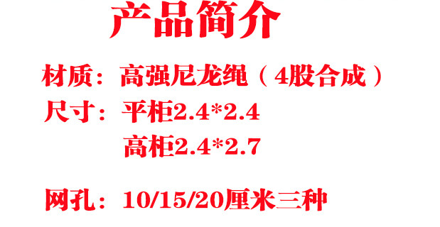| Color Classification | High Strength Rope Flat Cabinet 20cm Mesh,High Strength Rope Flat Cabinet 15cm Mesh,High Strength Rope Flat Cabinet 10cm Mesh,High Strength Rope High Cabinet 20cm Mesh,High-Strength Rope High Cabinet 15cm Mesh 2.4*2.6,High Strength Rope High Cabinet 10cm Mesh,High-Strength Rope Other Customized Sizes,Expanded 2.4*2.6 High Cabinet 20cm Holes,Expanded 2.4*2.4 Flat Cabinet 10cm Holes,Expanded 2.4*2.4 Flat Cabinet 15cm Holes,Expanded 2.4*2.6 High Cabinet 15cm Holes |