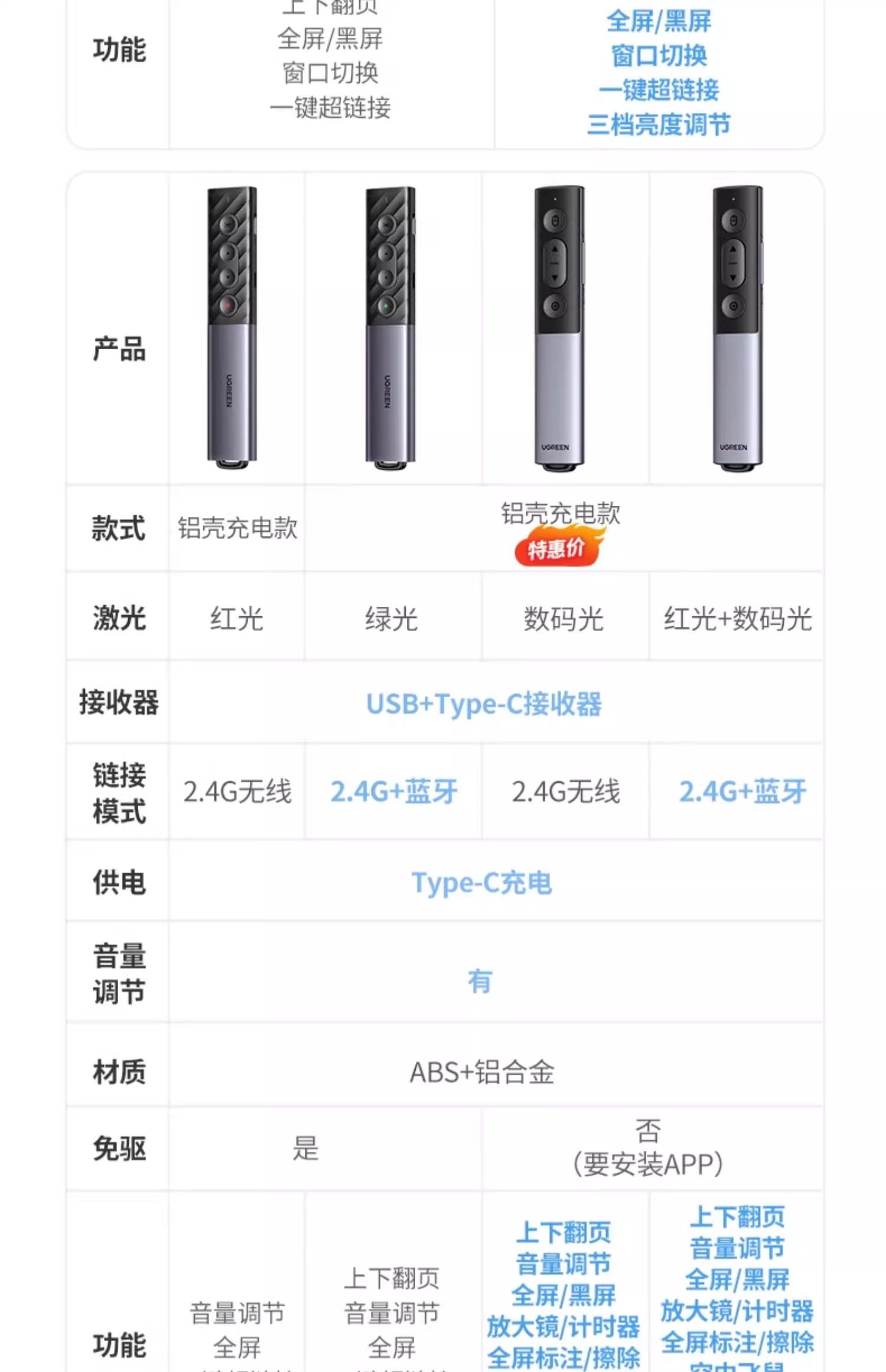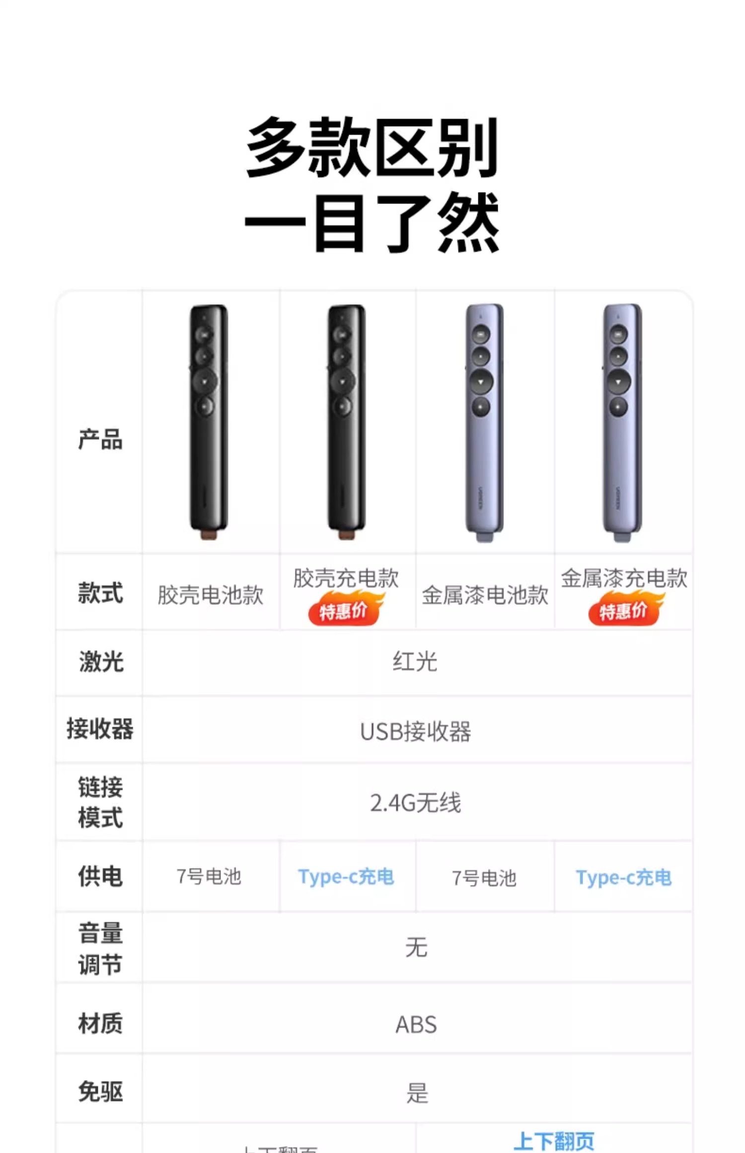 | Color Classification | 50654 [Red Light-Battery Model] 100m Remote Control★One-Click Hyperlink-Black,35514 [Red Light-Battery Model] 100m Remote Control★One-Click Hyperlink-White,90121 [Red Light-Rechargeable Model] 100m Remote Control★One-Click Hyperlink,15630 [Red Light-Battery Model] Metallic Paint★100m Remote Control★3 Levels of Brightness Adjustment,15153 [Red Light-Rechargeable Model] Metallic Paint★100m Remote Control★3 Levels of Brightness Adjustment,80136 [Red Light-Rechargeable Aluminum Shell Model] Usb+Type-C Dual Interface★Support Volume Adjustment★One-Click Hyperlink,20470 [Green Light - Rechargeable Aluminum Shell Model] Usb+Type-C Dual Interface★Support Volume Adjustment★One-Click Hyperlink,50333 [Digital Light-Charging Aluminum Shell Model] Information Sharing★Flying Squirrel★Button Customization,15066 [Digital Light + Red Light Rechargeable Aluminum Shell Model] Data Sharing★Flying Squirrel★Button Customization★2.4G+Bluetooth Connection,45489 [Green Light-Rechargeable Model] 100m Remote Control★One-Click Hyperlink - Plug & Play - Metallic Paint,45490 [Dual Laser] Green Light Dual Interface + Bluetooth Connection |