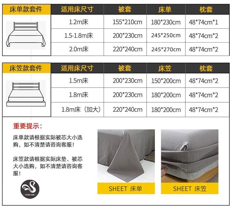 | Applicable Bed Size | 0.9m Bed Sheet Three-Piece Set [Suitable for 150*200 Quilt],1.2m Bed Sheet Three-Piece Set [Suitable for 150*200 Quilt],1.5m Bed Sheet Four-Piece Set [Suitable for 200*230 Quilt],1.8m Bed Sheet Four-Piece Set [Suitable for 200*230 Quilt],2.0m Bed Sheet Four-Piece Set [Suitable for 220*240 Quilt],1.5m Bed Fitted Sheet Set of Four [Suitable for 200*230 Quilt],1.8m Bed Fitted Sheet Set of Four [Suitable for 200*230 Quilt],1.8m Four-Piece Set of Fitted Sheets [Suitable for 220*240 Quilts] |