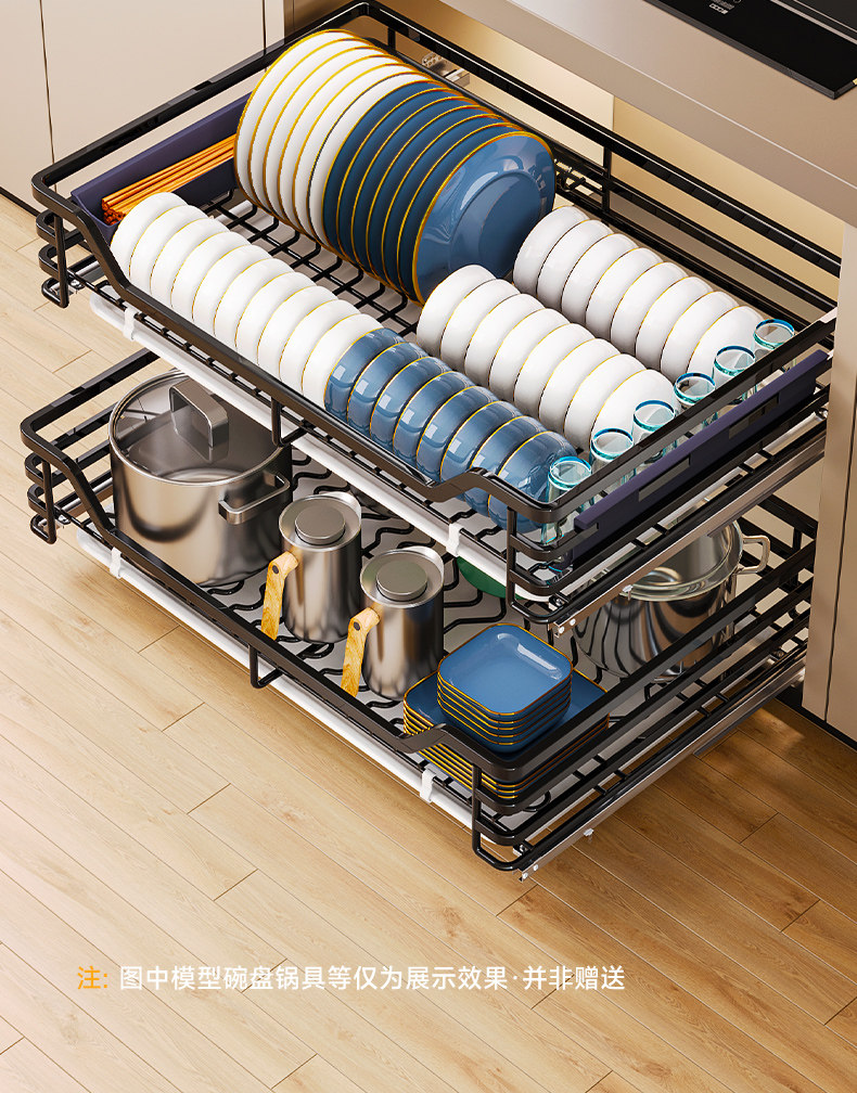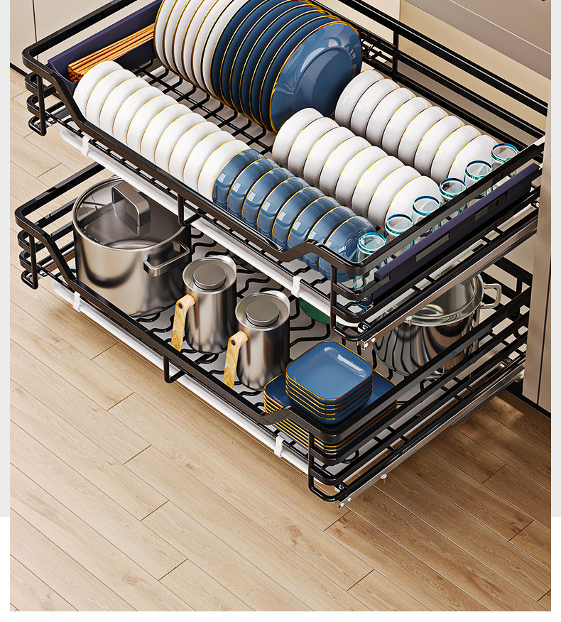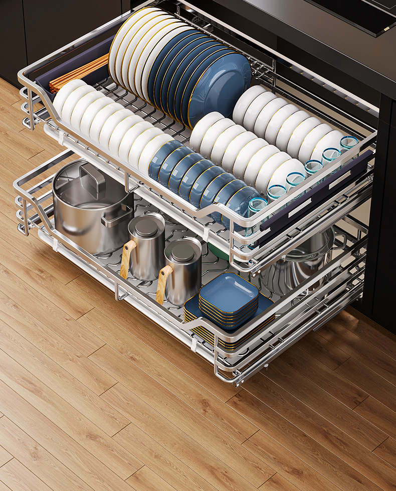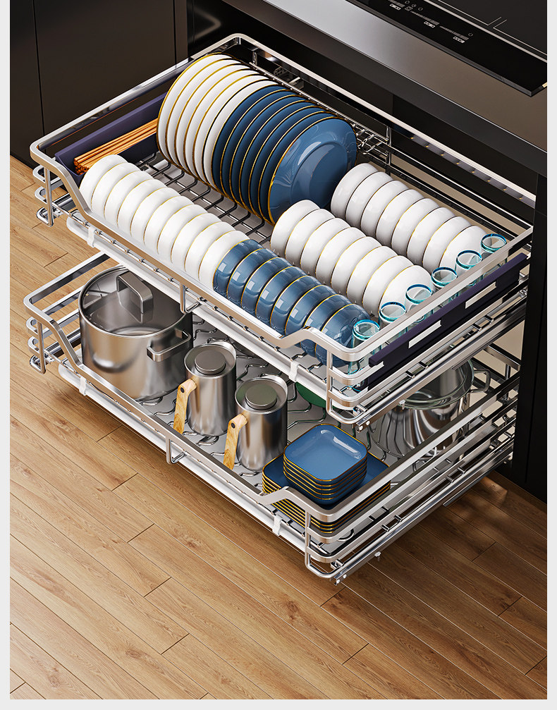Diminila Kitchen Cabinet Double-Layer Drawer-Type Bowl Rack 304 Stainless Steel Kitchen Cabinet Bowl Basket Storage Seasoning Basket