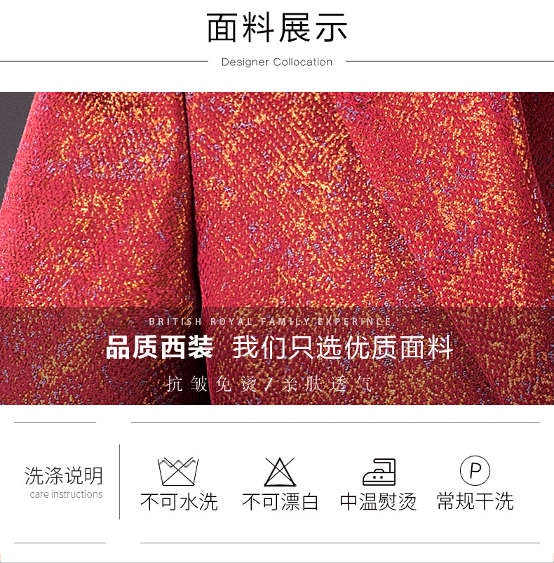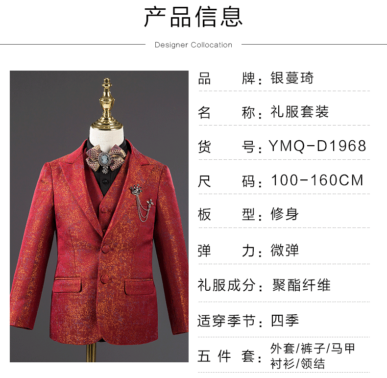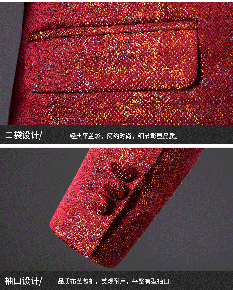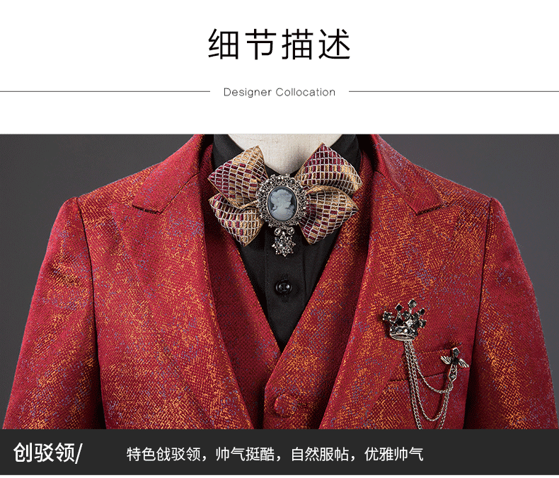 | Color Classification | Three-Piece Suit (Suit + Pants + Vest),Three-Piece Suit (Suit + Vest + Pants),Five-Piece Suit (Suit + Vest + Pants + Shirt + Bow Tie),Six-Piece Set (Suit + Vest + Pants + Shirt + Bow Tie + Brooch) |