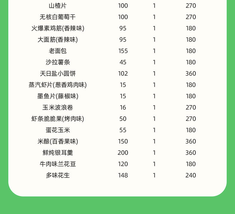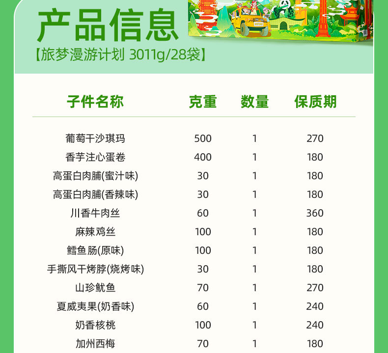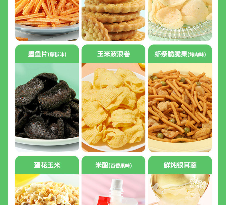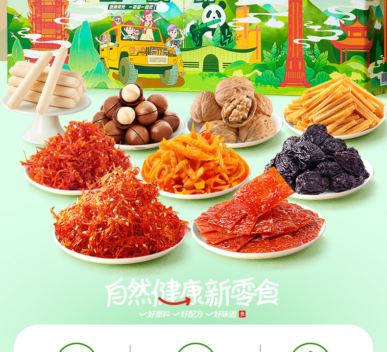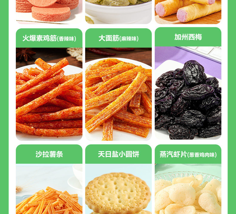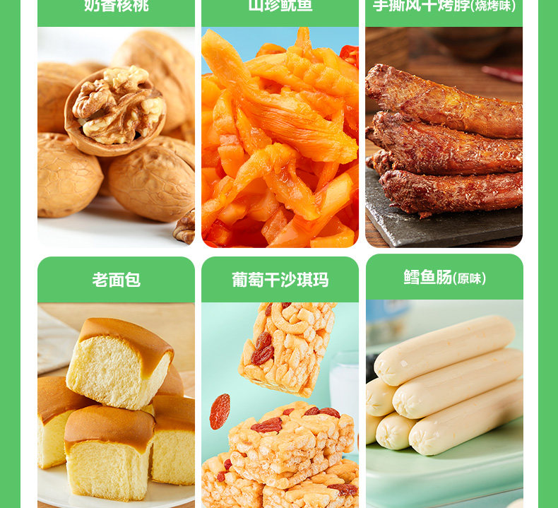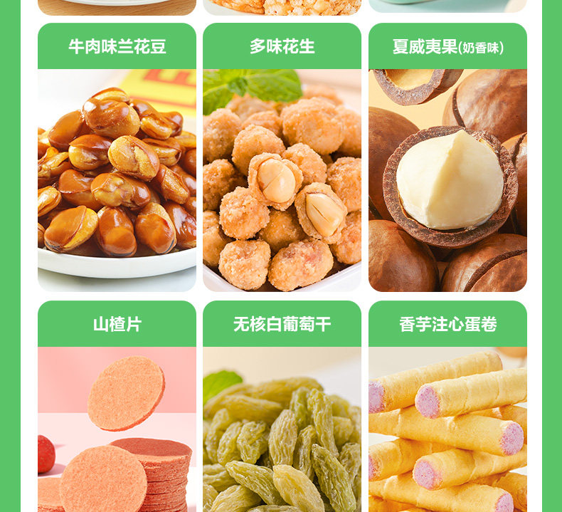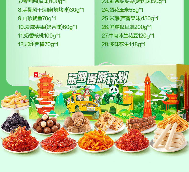 | Taste | ãSuper 3kgãTravel Dream Roaming Plan 3011g/28 Bags,ãSuper 3.5kgãFood Light Train 3527g/35 Bags,[a Large Bucket of Snacks] Snack Family Bucket 3114g,ãSuper 4kgãLet Your Mouth Travel 4077g/32 Packs,[Super 6 Near] Weekend Camping 3198g,For More Than 10 Pieces, Please Contact Customer Service for More Discounts,Great Wealth - More Than Enough Every Year,Great Joy,Jiafu Pure Fruit Gift 1640g,Food Train,Vitality Spring Bucket |