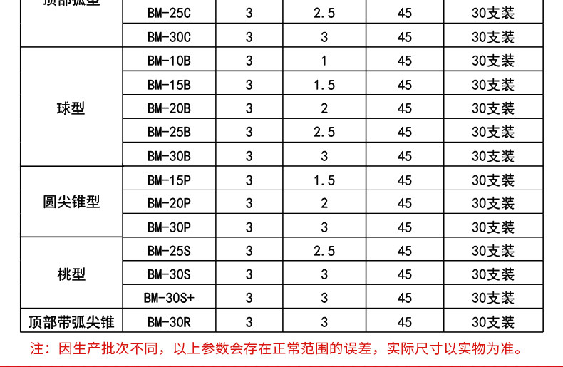 | Color Classification | 3mm Handle Set [30 Pieces],Cylindrical 3.0mm [30 Pieces],Cylindrical 2.5mm [30 Pieces],Cylindrical 2.0mm [30 Pieces],Cylindrical 1.5mm [30 Pieces],Cylindrical 1.0mm [30 Pieces],Pointed 3.0mm [30 Pieces],Pointed 2.0mm [30 Pieces],Long Peach Shape 3.0mm [30 Pieces],Peach Shape 3.0mm [30 Pieces],Peach Shape 2.5mm [30 Pieces],Spherical 3.0mm [30 Pieces],Spherical 2.5mm [30 Pieces],Spherical 2.0mm [30 Pieces],Spherical 1.5mm [30 Pieces],Spherical 1.0mm [30 Pieces],Conical Dome 3.0mm [30 Pieces],Cylindrical Round Head 1.0mm [30 Pieces],Cylindrical Round Head 1.5mm [30 Pieces],Cylindrical Round Head 2.0mm [30 Pieces],Cylindrical Round Head 2.5 [30 Pieces],Cylindrical Round Head 3.0mm [30 Pieces],Curved Round Head 3.0mm [30 Pieces],The Following Specifications Are for the Titanium-Coated Version.,Titanium Plated Bms-300 Mixed,Titanium Plated Bm-10A Cylinder,Titanium Plated Bm-15A Cylinder,Titanium Plated Bm-20A Cylinder,Titanium Plated Bm-25A Cylinder,Titanium Plated Bm-30A Cylinder,Titanium Plated Bm-35A Cylinder,Titanium Plated Bm-10B Spherical,Titanium Plated Bm-15B Spherical,Titanium Plated Bm-20B Spherical,Titanium Plated Bm-25B Spherical,Titanium Plated Bm-30B Spherical,Titanium Plated Bm-10C Cylindrical Round Head,Titanium Plated Bm-15C Cylindrical Round Head,Titanium Plated Bm-20C Cylindrical Round Head,Titanium Plated Bm-25C Cylindrical Round Head,Titanium Plated Bm-30C Cylindrical Round Head,Titanium Plated Bm-35C Cylindrical Round Head,Titanium Plated Bm-15P Tip,Titanium Plated Bm-20P Tip,Titanium Plated Bm-30P Tip,Titanium Plated Bm-15R Conical Dome,Titanium Plated Bm-20R Conical Dome,Titanium Plated Bm-30R Conical Dome,Titanium Plated Bm-20F Curved Round Head,Titanium Plated Bm-30F Curved Round Head,Titanium Plated Bm-33F Curved Round Head,Titanium Plated Bm-20T Conical Flat Head,Titanium Plated Bm-30T Conical Flat Head,Titanium Plated Bm-25S Peach Shape,Titanium Plated Bm-30S Peach Shape,Titanium Plated Bm-30S+ Long Oval Shape,Titanium-Plated Bm-30J Curved Tip,Titanium Plated Bm-30V Inverted Cone |