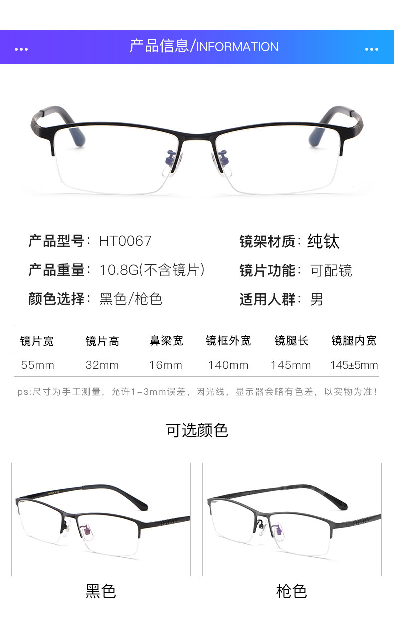 | Color Classification | Black Pure Titanium Frame + Aspherical Lens,Gunmetal Pure Titanium Frame + Aspherical Lens,Black Pure Titanium Frame + Anti-Blue Light Lenses,Gunmetal Pure Titanium Frame + Anti-Blue Light Lenses,[Wanxin Brand] Frame + Aspheric Lenses (Leave a Message for the Degree),[Wanxin Brand] Frame + Anti-Blue Light Lenses (Leave a Message for the Prescription),[Zis Brand] Frame + Special Non-Spherical Lenses (Leave a Message for the Degree),[Zis Brand] Eyeglass Frames + Stepan Anti-Blue Light Lenses (Specify Prescription in Order Notes) |