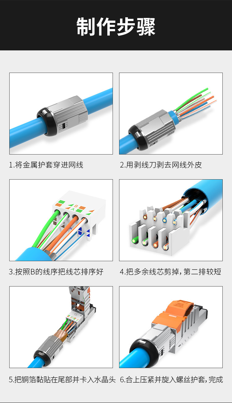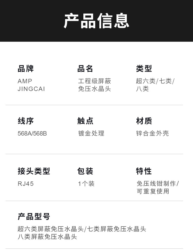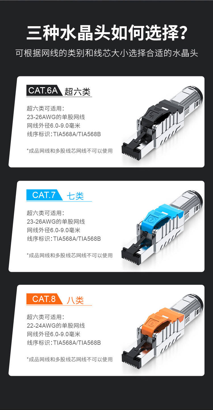 | Color Classification | Cat5E Unshielded Rj45 Connector (No Pressure Required),Category 6 Unshielded Pressure-Free Crystal Head,Cat6A Shielded Compression-Free Metal Rj45 Connector,Category 7 Shielded Pressure-Free Metal Crystal Head,Category 8 Shielded Pressure-Free Metal Crystal Head |