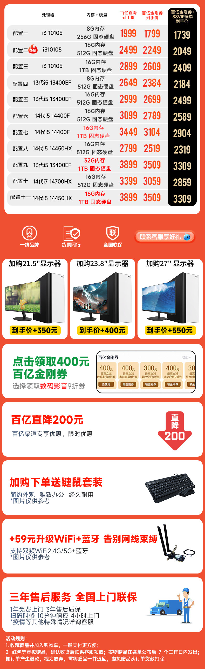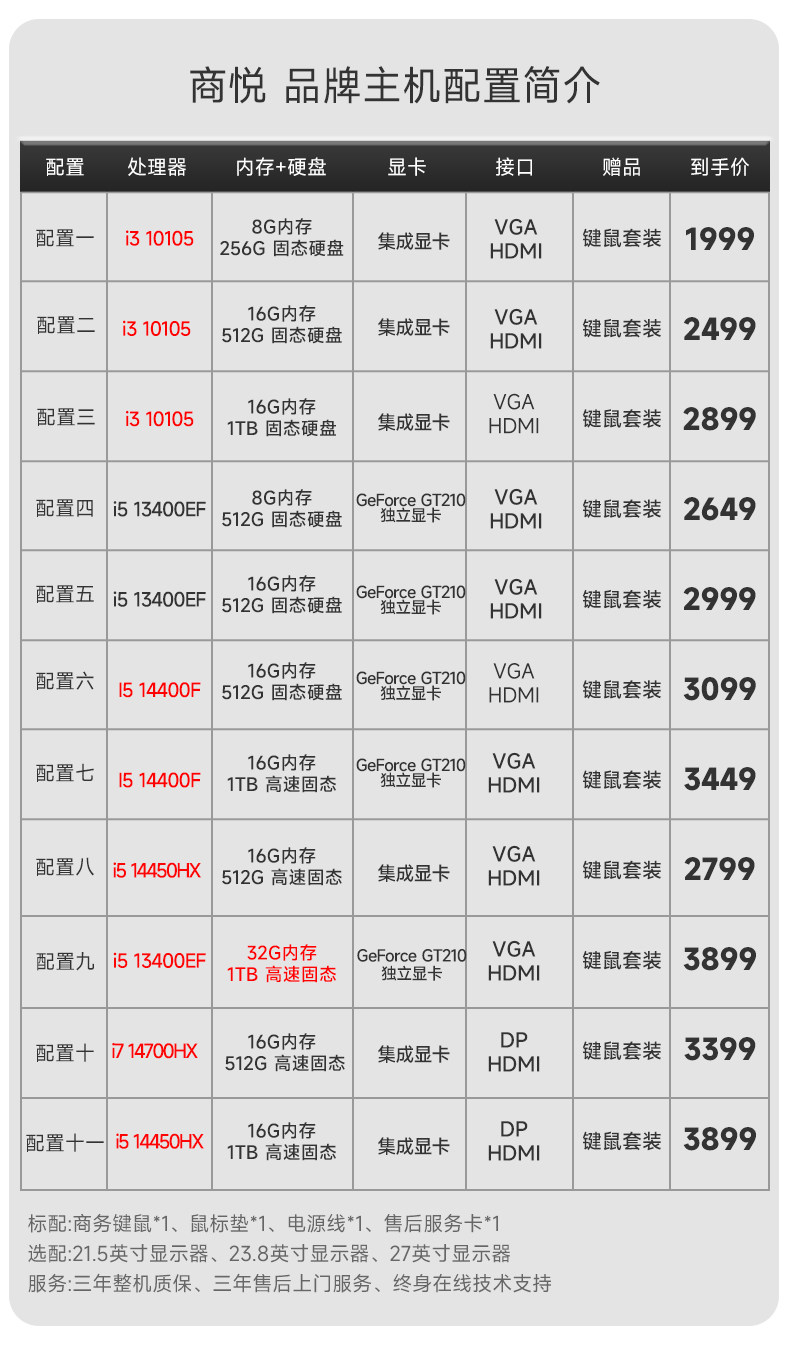 | Color Classification | Configuration 1 Finance | Customer Service I3 10105 | 8g Memory | 256g,Configuration 2 Finance | Customer Service I3 10105 | 16g Memory | 512g,Configuration 3 Enterprise Acquisition丨Education i3 10105丨16G Memory丨1TB,Configuration 4 Enterprise Collection | Office I5 13400Ef | 8Gb Ram | 512Gb Storage,Configuration 5 Enterprise Collection | Office I5 13400Ef | 16Gb Ram | 512Gb Storage,Configuration 6 Enterprise Selection | 14Th Gen Core I5-14490F | 16Gb Ram | 512Gb Storage,Configuration 7 Qicai丨14th generation Core i5 14490F丨16G memory丨1TB,Configuration 8 Education | Graphic Design I5 14450Hx | 16g Memory | 512g Storage,Configuration 9 Qicai丨14th generation Core i5 13400EF丨32G memory丨1TB,Configuration ten AI丨Graphic design i7 14700HX丨16G丨512G,Configuration Eleven AI丨Graphic Design i5 14450HX丨16G丨1TB,Configuration twelve AI丨13th generation Core i7 13790F丨16G memory丨1TB |
