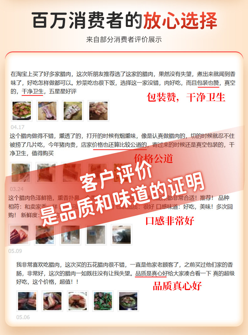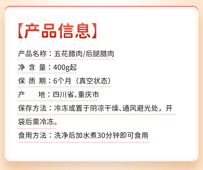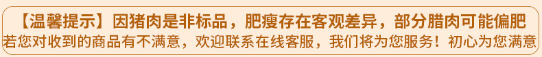 | Taste | Signature Bacon 400g (Hind Leg) [Buy 2 Portions for a Better Deal],Flavored Bacon 400g (Five Layers) [Buy 2 Portions for a Better Deal],500g Smoked Pork Hind Leg - Hot Seller❤Buy 2 Copies for a Better Deal],Five-Flower Bacon 500g [Hot Sale❤Buy 2 Copies for a Better Deal],Air-Dried Bacon 250g*2 Bags [Smoke-Free],Five-Flower Bacon 1.0kg + Hind Leg Bacon 1.0kg + Spicy Sausage 0.5kg,250g*3 of Dried Wax Beans + 250g*2 of Organic Glutinous Rice Bamboo Shoots [Can Be Stir-Fried with Bacon],500g of Bacon on the Back Leg + 500g of Bacon on the Pork Belly,Spicy Sausage 500g + Cured Pork Belly 500g,Five-Flower Bacon 500g*2 Bags,500g Smoked Pork Hind Leg + 250g Organic Bamboo Shoots in Sticky Rice,Five-Flower Bacon 500g*5 Bags,Bacon on the Back Leg 500g*5 Bags,Five-Flower Bacon 1.0kg + Hind Leg Bacon 0.5kg + Spicy Sausage 1.0kg,Bacon on the Back Leg 1.5kg + Spicy Sausage 1.0kg,Five-Flower Bacon 0.5kg + Hind Leg Bacon 1.0kg + Spicy Sausage 1.0kg,Front Leg 400g [New],5 Bags of Hind Leg Bacon [Old],Five-Flower Hind Leg Sausage, 5 Bags in Total [Old] |