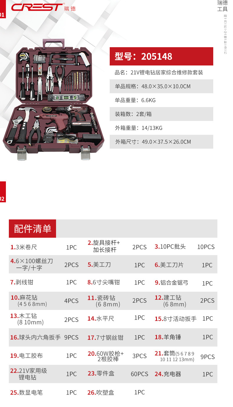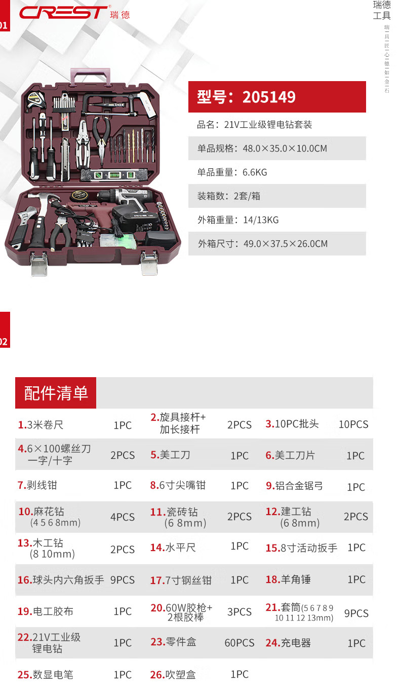 | Color Classification | Red 21V Lithium Electric Drill Set 205148,Red 21V Lithium Electric Drill Set Tool 205149,208022,208015,208042,208043,208116,105052,128009A,128022,128039,101045,101086,205068,028018,105100,208014,105095,105040,101075,208108,011016B,208013,011018,011017,128020,011011A,013107,013108,013223,013112,128009,208062,208010,105098,218018,105112,013015,013016,218067,1028,2022,011017C,81-Piece Household Tool Set 208081,011011,3028,RD001,128040,M011011,028021 |