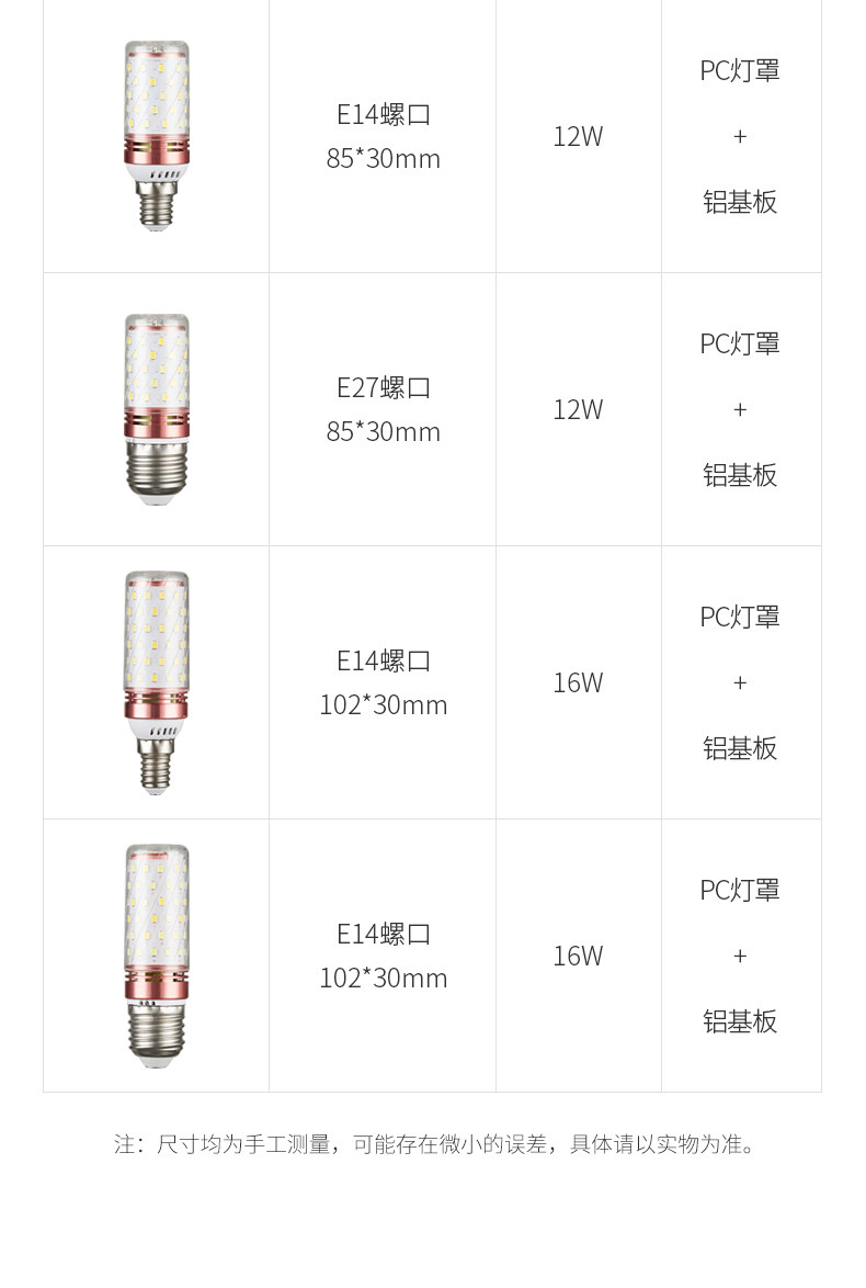 | Color Classification | Promotional Item: [Pack of 5] Flicker-Free E27 Base 12W Cool White,[Pack of 5] No Flicker, E27 Screw Port, 12W White Light,[Pack of 5] No Flicker, E27 Screw Socket, 12W Warm Light,[Pack of 5] No Flicker, E27 Screw Port, 12W Neutral Light,[Pack of 5] No Flicker, E27 Screw Socket, 12W Three-Color Dimming,[Pack of 5] No Flicker, E14 Screw Socket, 12W White Light,[Pack of 5] No Flicker, E14 Screw Socket, 12W Warm Light,[Pack of 5] No Flicker, E14 Screw Socket, 12W Neutral Light,[Pack of 5] No Flicker, E14 Screw Socket, 12 Three-Color Dimming,[Pack of 5] No Flicker, E27 Screw Port, 16W White Light,[Pack of 5] No Flicker, E27 Screw Socket, 16W Warm Light,[Pack of 5] No Flicker, E27 Screw Port, 16W Neutral Light,[Pack of 5] No Flicker, E27 Screw Socket, 16W Three-Color Dimming,[Pack of 5] No Flicker, E14 Screw Socket, 16W White Light,[Pack of 5] No Flicker, E14 Screw Socket, 16W Warm Light,[Pack of 5] No Flicker, E14 Screw Socket, 16W Neutral Light,[Pack of 5] No Flicker, E14 Screw Socket, 16W Three-Color Dimming,[Pack of 5] No Flicker, E27 Screw Port, 20W White Light,[Pack of 5] No Flicker, E27 Screw Port, 20W Warm Light,[Pack of 5] No Flicker, E27 Screw Port, 20W Neutral Light,[Pack of 5] No Flicker, E27 Screw Port, 20W Three-Color Dimming,[Pack of 5] No Flicker, E14 Screw Port, 20W White Light,[Pack of 5] No Flicker, E14 Screw Socket, 20W Warm Light,[Pack of 5] No Flicker, E14 Screw Socket, 20W Neutral Light,[Pack of 5] No Flicker, E14 Screw Socket, 20W Three-Color Dimming,[Pack of 5] No Flicker, E27 Screw Port, 24W White Light,[Pack of 5] No Flicker, E27 Screw Port, 24W Warm Light,[Pack of 5] No Flicker, E27 Screw Port, 24W Three-Color Dimming,[Pack of 5] No Flicker, E14 Screw Port, 24W White Light,[Pack of 5] No Flicker, E14 Screw Socket, 24W Warm Light,[Pack of 5] No Flicker, E14 Screw Socket, 24W Neutral Light,[Pack of 5] No Flicker, E14 Screw Socket, 24W Three-Color Dimming,[Pack of 5] No Flicker, E27 Screw Port, 30W White Light,[Pack of 5] No Flicker, E27 Screw Socket, 30W Warm Light,[Pack of 5] No Flicker, E27 Screw Port, 30W Neutral Light,[Pack of 5] No Flicker, E27 Screw Port, 30W Three-Color Dimming,[Pack of 5] No Flicker, E14 Screw Socket, 30W White Light,[Pack of 5] No Flicker, E14 Screw Socket, 30W Warm Light,[Pack of 5] No Flicker, E14 Screw Socket, 30W Neutral Light,[Pack of 5] No Flicker, E14 Screw Socket, 30W Three-Color Dimming,[Pack of 5] No Flicker, E27 Screw Port, 40W White Light,[Pack of 5] No Flicker, E27 Screw Port, 40W Warm Light,[Pack of 5] No Flicker, E27 Screw Port, 40W Neutral Light,[Pack of 5] No Flicker, E27 Screw Port, 40W Three-Color Dimming,[Pack of 5] No Flicker, E14 Screw Port, 40W White Light,[Pack of 5] No Flicker, E14 Screw Socket, 40W Warm Light,[Pack of 5] No Flicker, E14 Screw Socket, 40W Neutral Light,[Pack of 5] No Flicker, E14 Screw Socket, 40W Three-Color Dimming |