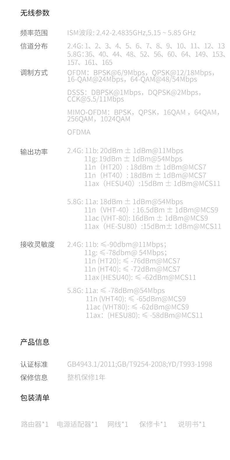 | Network Standards | 802.11a,802.11b,802.11g,wifi6,802.11ac,802.11n |