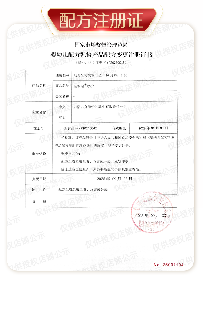 | Formula Registration Number | National Food Injection Word Yp20220038 |