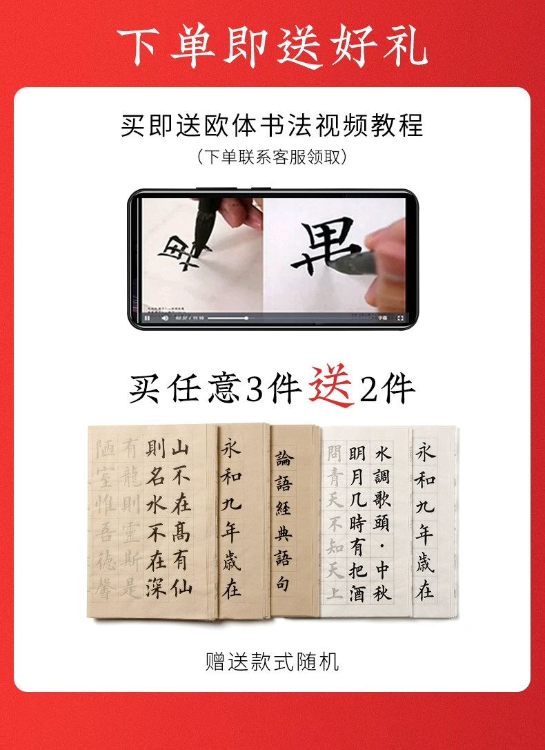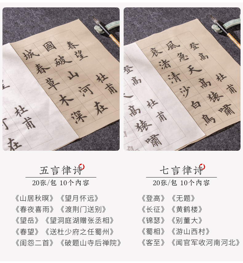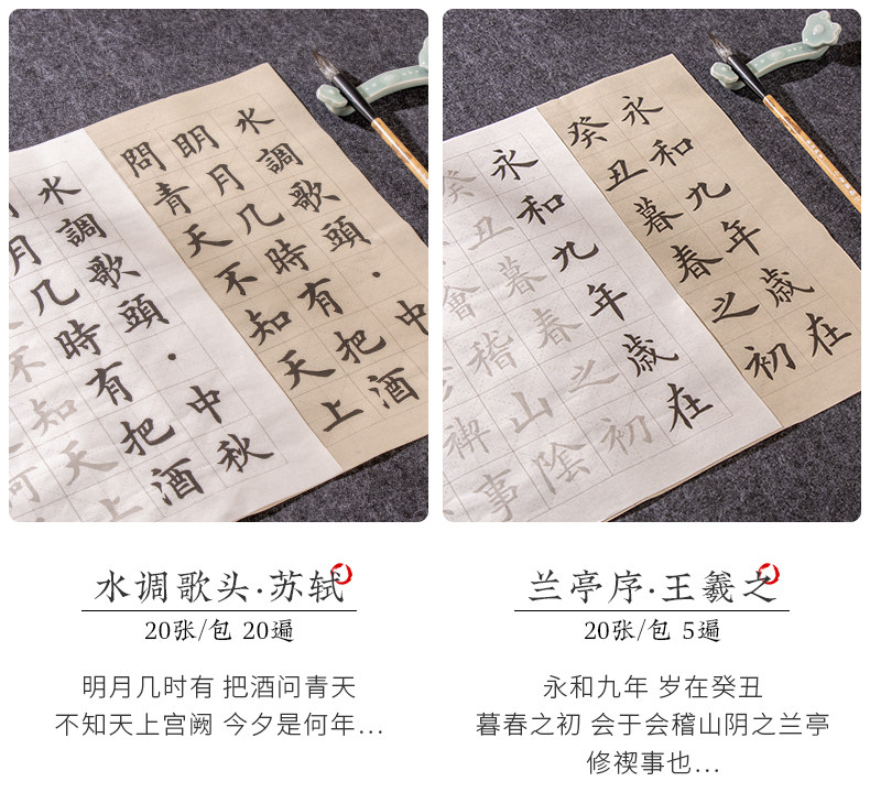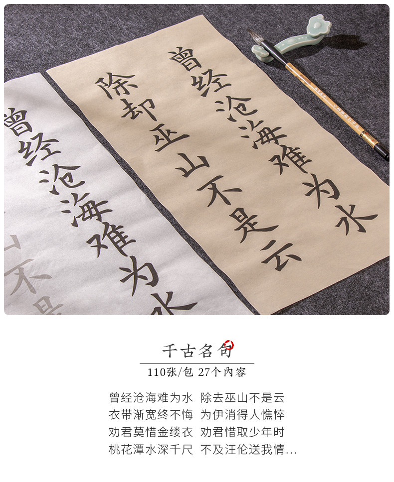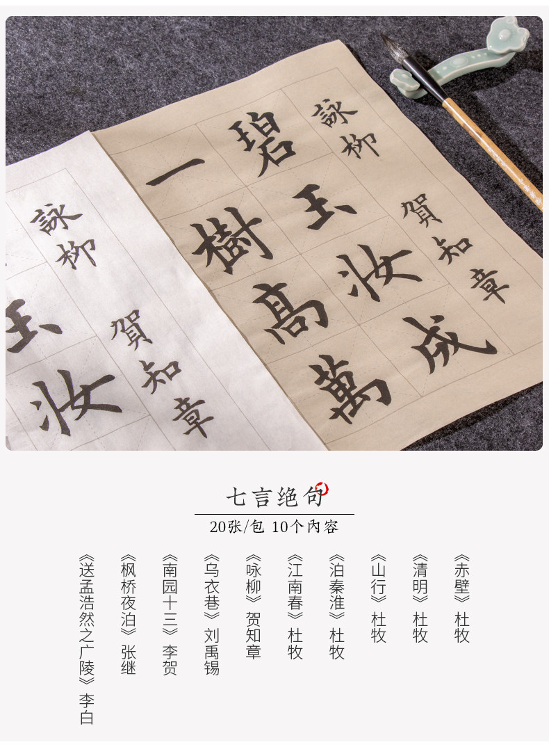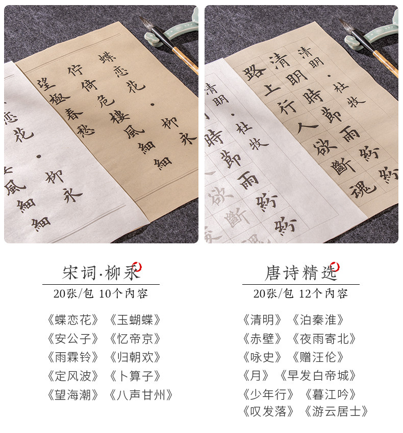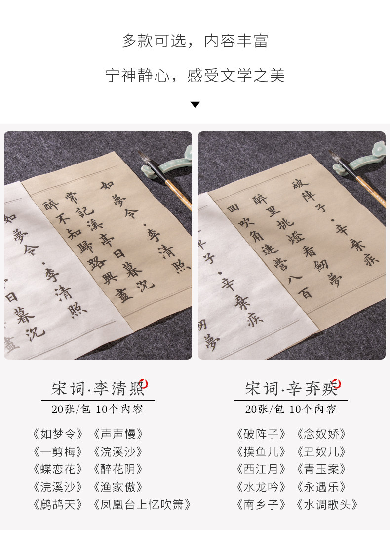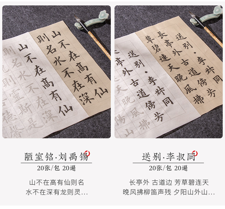 | Color Classification | "110 Famous Quotes","62 Classic Ancient Poems" 100 Sheets,[Selected Tang Poems + Preface to Lanting + Analects of Confucius 3 Pack],"Song of Everlasting Sorrow: Yue Fei" - 20 Sheets,"Selected Tang Poems" 20 Photos,"Quatrains" 20 Photos,"Shui Tiao Ge Tou·Su Shi" 20 Photos,"Song Ci·Li Qingzhao" 20 Photos,"Preface to Lanting·Wang Xizhi" 20 Photos,"Song Ci·Liu Yong" 20 Photos,"Seven-Character Poems" - 20 Sheets,"Liuli Ming·Liu Yuxi" 20 Photos,"Song Ci - Xin Qiji" - 20 Sheets,"The Analects of Confucius" 20 Photos,"Seven-Character Quatrains" - 20 Sheets,"Instructions to the Son" by Zhuge Liang - 20 Sheets,"Five-Character Rhyming Poems" - 20 Sheets,"Parting with Uncle Li Tong" - 20 Sheets,"Jiucheng Palace Liquan Inscription" 60 Photos,"A Dream of Red Mansions: Selections" - 60 Sheets,"Danba Monument (Zhao Ti)" 60 Photos,"Mysterious Pagoda Stele (Liuyu)" 66 Photos,"Duobao Pagoda Stele (Yan Ti)" 68 Photos,"Official Script Calligraphy of Cao Quan's Stele - 52 Sheets" |
