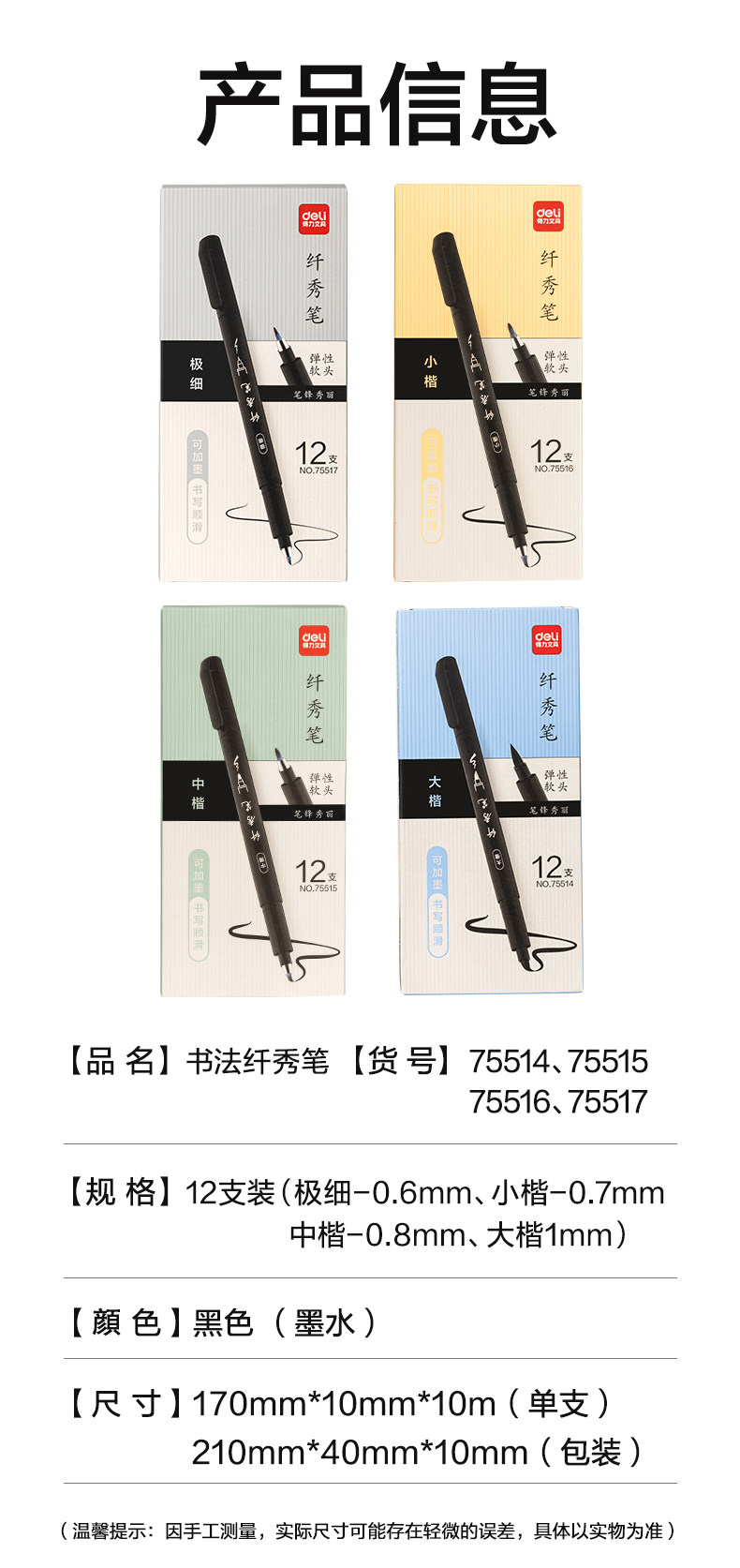 | Color Classification | 1 Each of Extra Fine + Small Regular Script + Medium Regular Script + Large Regular Script + 1 Ink Refill,1 Each of Extra Fine, Small Regular Script, Medium Regular Script, and Large Regular Script,2 Small Regular Script Pens + 1 Ink Refill,Small Regular Script Calligraphy Brush (1 Piece) + Refill Ink,Extra Fine Point Pen (Single) + Ink Refill,Large Regular Script 1 Pack + Refill Ink,Medium Regular Script 1 Pack + Refill Ink,Small Regular Script 2 Pack,1 Each of Extra Fine + Small Regular Script + Medium Regular Script + Large Regular Script + Refill Ink,Small Regular Script 1 Pack,Medium Regular Script 1 Pack,Large Regular Script 1 Pack,Extremely Fine 1 Pack,Extremely Fine 2 Pack,Medium Regular Script 2 Pack,Large Regular Script 2 Pack,1 Each of Extra Fine and Small Regular Script,1 Each of Extra Fine and Medium Regular Script,1 Each of Extra Fine and Large Regular Script,1 Each of Extra Fine + Small Regular Script + Medium Regular Script,1 Each of Extra Fine, Medium Regular Script, and Large Regular Script,1 Each of Small Regular Script and Medium Regular Script,1 Each of Small Regular Script and Large Regular Script,1 Medium Regular Script + 1 Large Regular Script,1 Small Regular Script + 1 Medium Regular Script + 1 Large Regular Script,Extremely Fine 3-Pack,Small Regular Script 3 Pack,Medium Regular Script 3 Pack,Large Regular Script 3 Pack,4 Pieces Each of Small Regular Script, Medium Regular Script and Large Regular Script,3 Each of Extra Fine, Small Regular Script, Medium Regular Script, and Large Regular Script,Extremely Fine 12-Pack,Small Regular Script 12 Pack,Medium Regular Script 12 Pack,Large Regular Script 12 Pack,1 Each of Extra Fine + Small Regular Script + Medium Regular Script + Large Regular Script (Boxed),1 Box of Ink Refills (6 Pieces in Total),3 Boxes of Ink Refills |