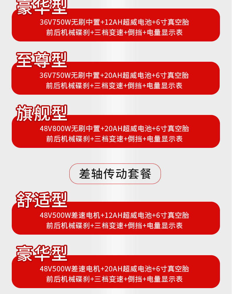 | Color Classification | Chain Drive Comfort Type,Chain Drive Luxury Type,Chain Drive Supreme Type,Chain Drive Flagship Model,Comfort Type with Differential Axle Transmission,Differential Axle Drive Luxury Type,Differential Axle Transmission Supreme Type,Flagship Differential Axle Transmission |