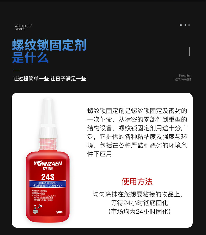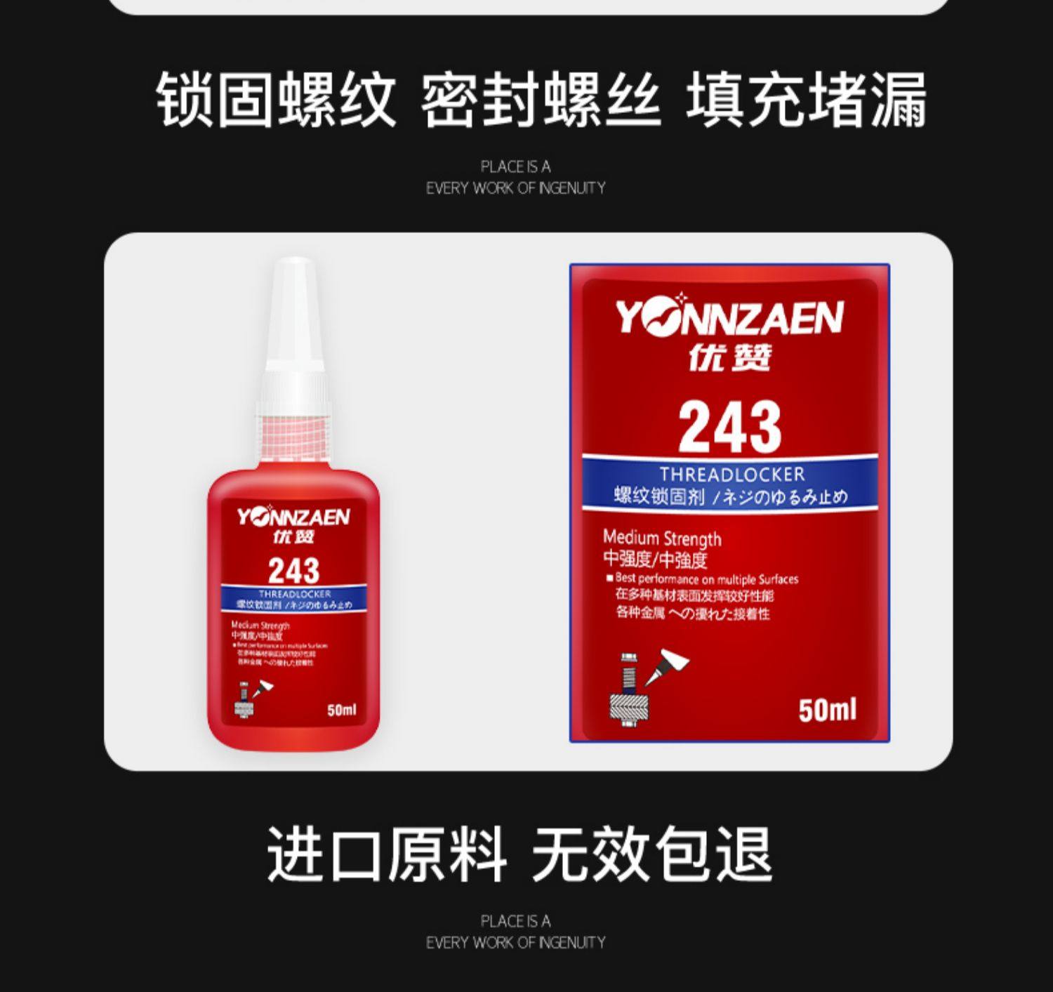 | Color Classification | 243 Screw Glue 50ml Medium Strength Removable,243 Screw Glue 250ml Medium Strength Removable,263 Screw Glue 50ml High Strength and Non-Detachable,263 Screw Glue 250ml High Strength Non-Detachable,222 Screw Glue 50ml for Small Screws,222 Screw Glue 250ml Special for Small Screws,242 Screw 50ml Medium Strength Removable,242 Screws 250ml Medium Strength Removable,270 Screws 50ml High Strength Non-Detachable,270 Screws 250ml High Strength Non-Detachable,271 Screw 50ml High Strength Non-Detachable,271 Screw 250ml High Strength Non-Detachable,272 Screw 50ml High Temperature Resistant and Non-Detachable,272 Screw 250ml High Temperature Resistant and Non-Detachable,277 Screw 50ml Large Screw Special,277 Screws 250ml Large Screws Only,290 Screw 250ml Penetrating Type,290 Screw 50ml Penetrating Type,680 Solid Adhesive 50Ml-Cylindrical Kit,680 Solid Adhesive 250Ml-Cylindrical Kit,Liquid Raw Material Belt 50ml Quick-Drying Type,Liquid Raw Material Belt 250ml Quick-Drying Type,243 Screw Glue 10ml Medium Strength Removable |