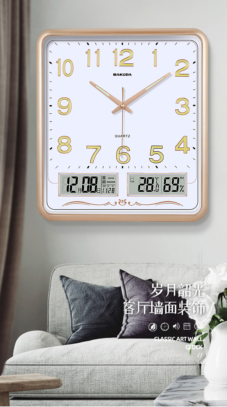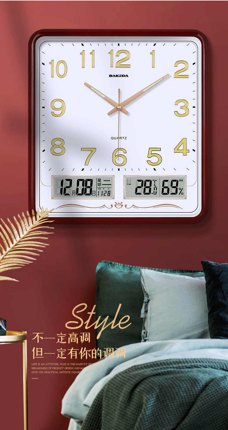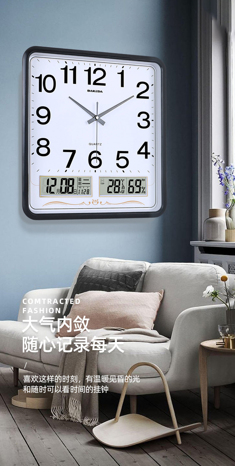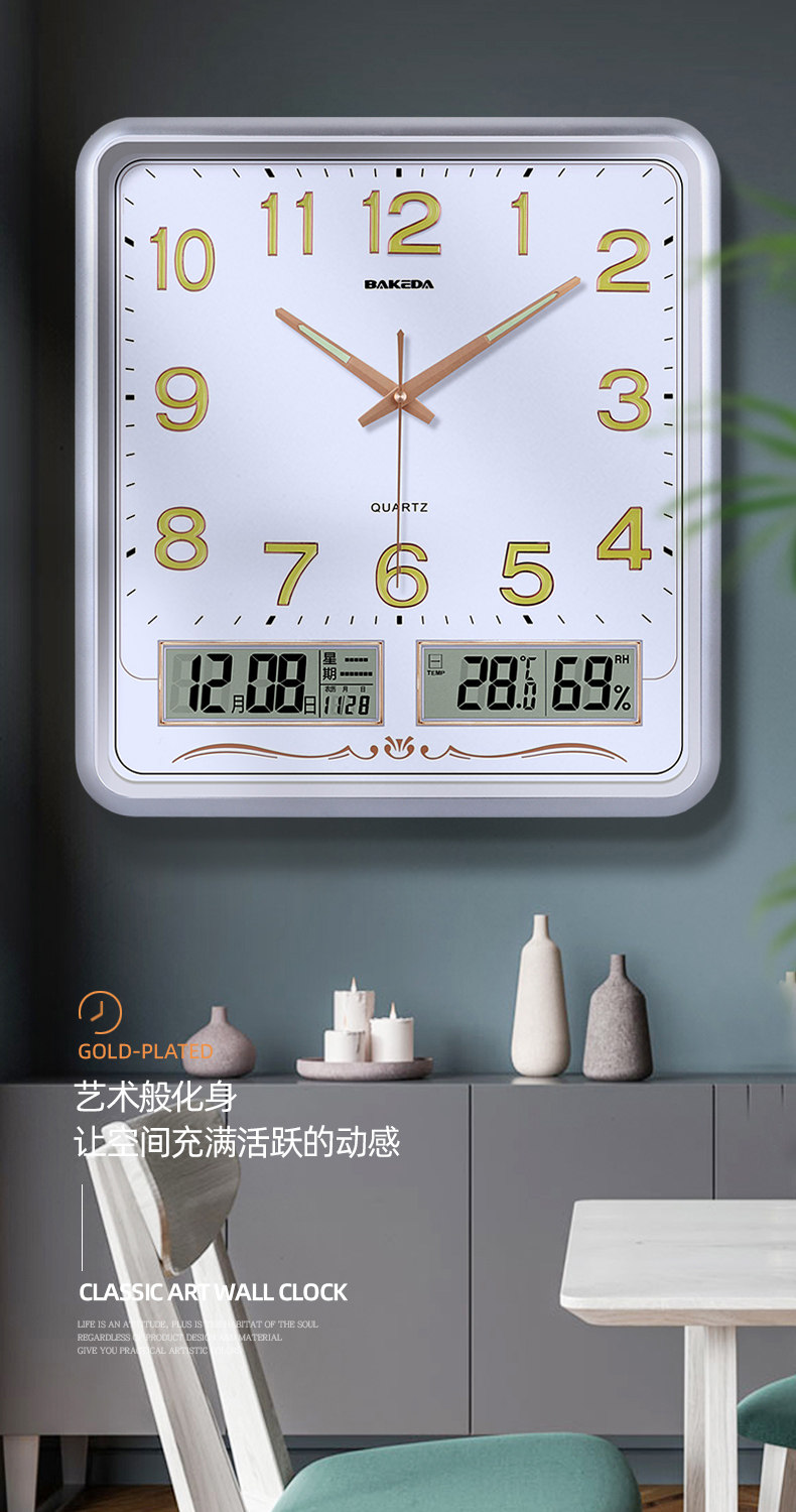 Household Square Wall Clock, Living Room Clock, Modern Clock, Wall-Mounted, Simple and Stylish, Electronic Calendar Wall Clock, Quartz Clock