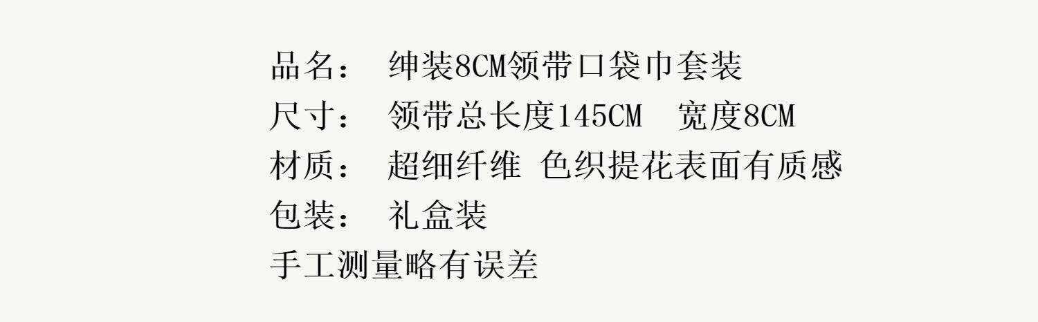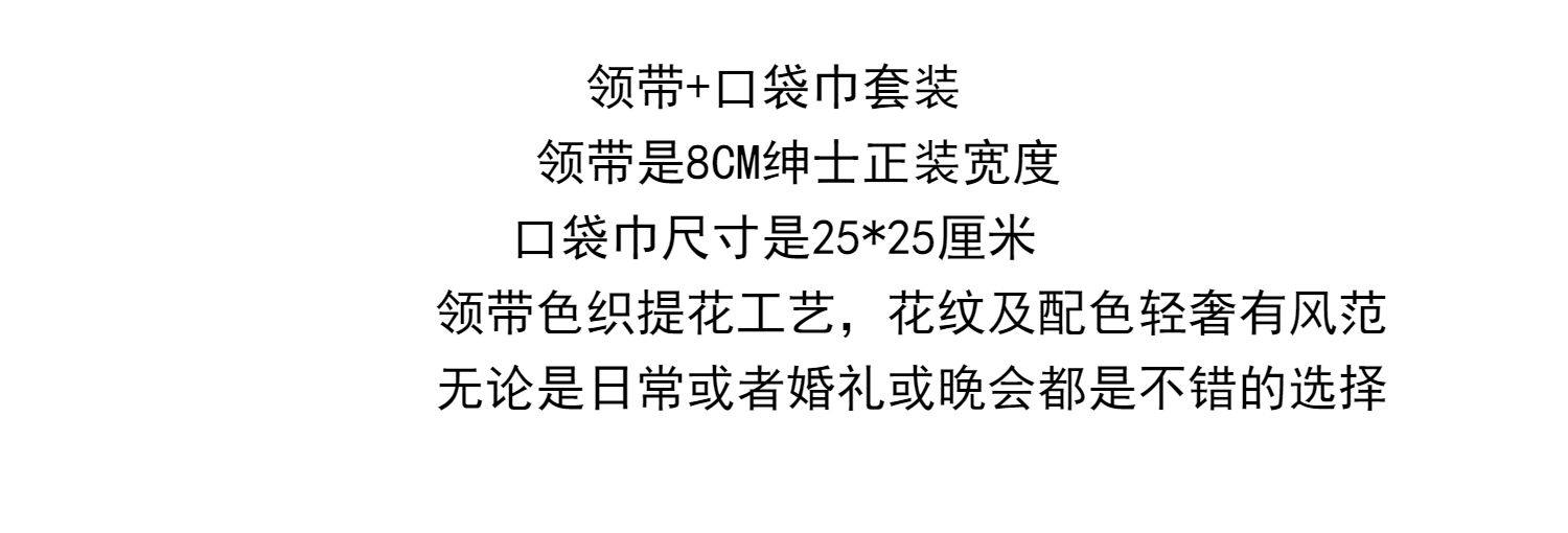 | Color Classification | Burgundy Cashew 8cm Tie + Pocket Square,Green Cashew 8cm Tie + Pocket Square,Burgundy Pattern 8cm Tie + Pocket Square,Dark Red Striped 8cm Tie + Pocket Square,Burgundy Blue and White Dot 8cm Tie + Pocket Square,Blue and Gray Striped 8cm Tie + Pocket Square,Coffee Striped 8cm Tie + Pocket Square,Gray Red Dot 8cm Tie + Pocket Square,Burgundy Blue Dot 8cm Tie + Pocket Square,Dark Green Paisley 8cm Tie + Pocket Square,Dark Green 8cm Tie + Pocket Square,Yellow 8cm Tie + Pocket Square,Blue Floral 8cm Tie + Pocket Square,Blue Dragonfly 8cm Tie + Pocket Square,Red Dragonfly 8cm Tie + Pocket Square,Red Striped 8cm Tie + Pocket Square,Gray Blue Cashew 8cm Tie + Pocket Square,Red Leaf 8cm Tie + Pocket Square |