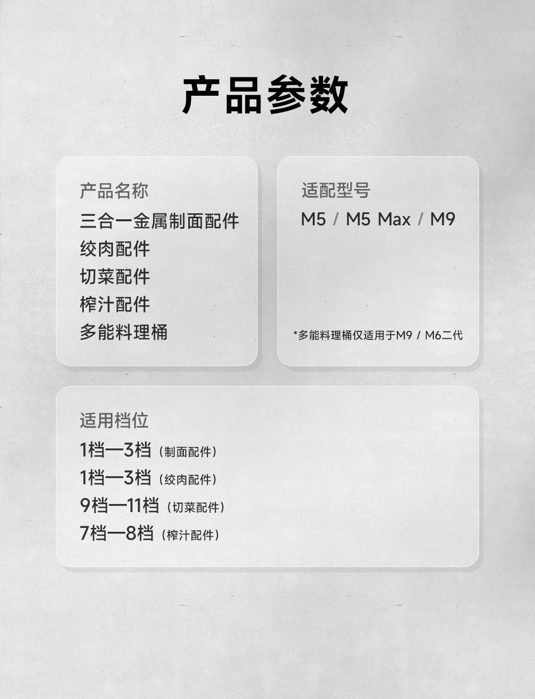 | Color Classification | Metal Three-In-One,Meat Grinder Accessories,Juicing Accessories,Vegetable Cutting Accessories,Special for Heated Cooking Bucket M9,M6 2Nd Generation Heated Food Bucket,Abs Plastic Gold Combination Model |