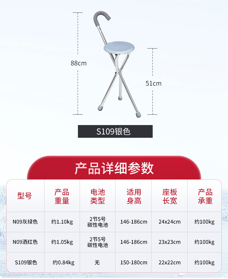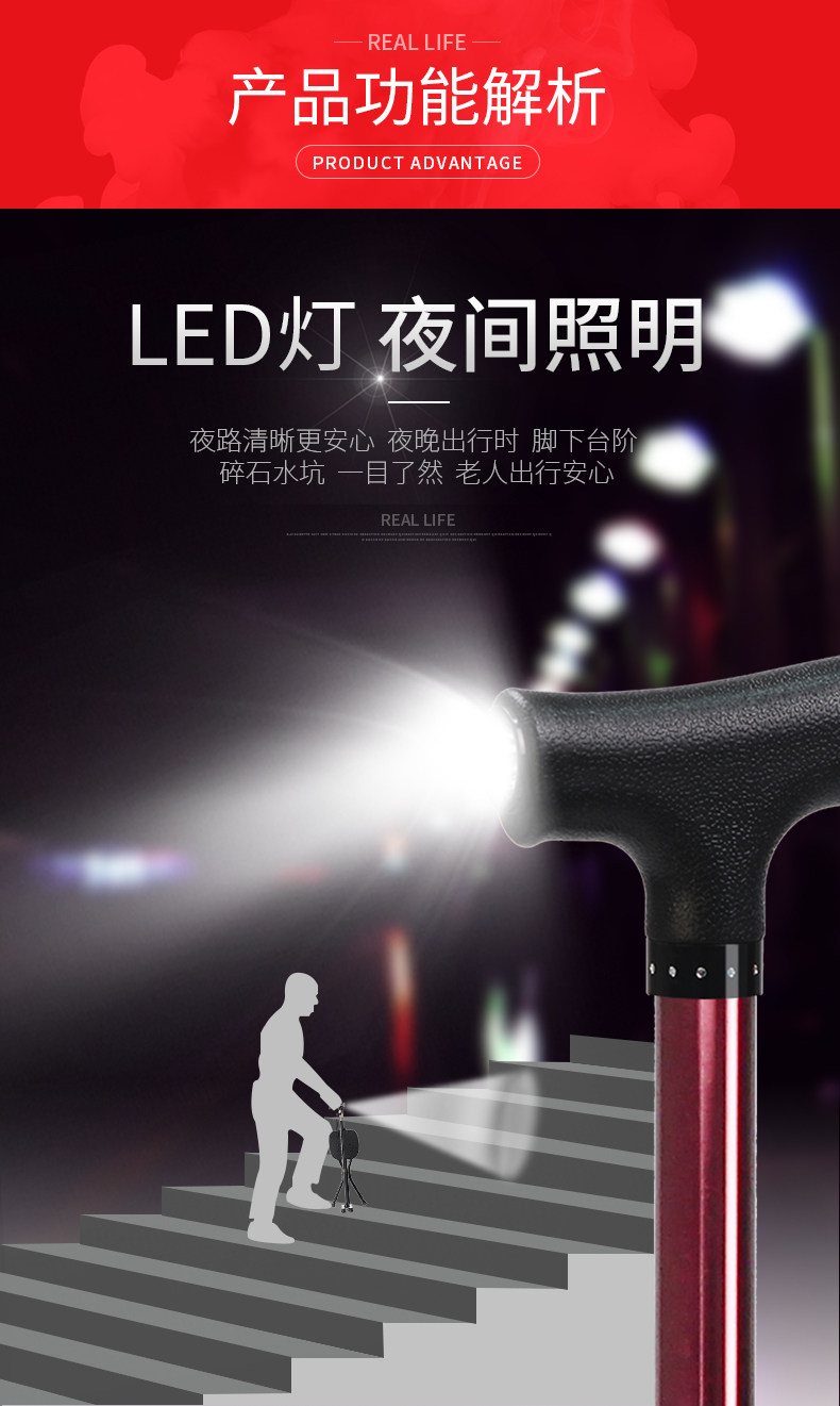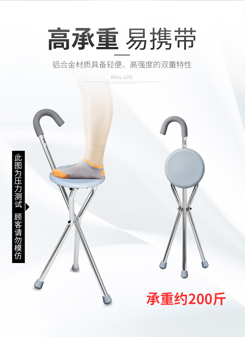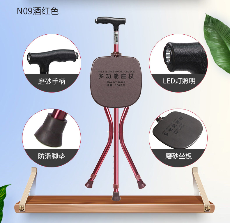 Le Laifu Folding Telescopic Crutch Stool with Light, Multifunctional Three-Legged Crutch Chair, Elderly Walking Stick, Non-Slip and Stable Walking Stick