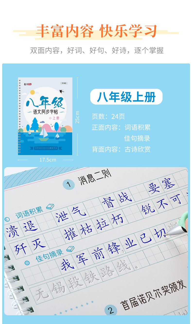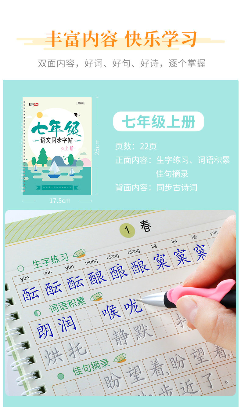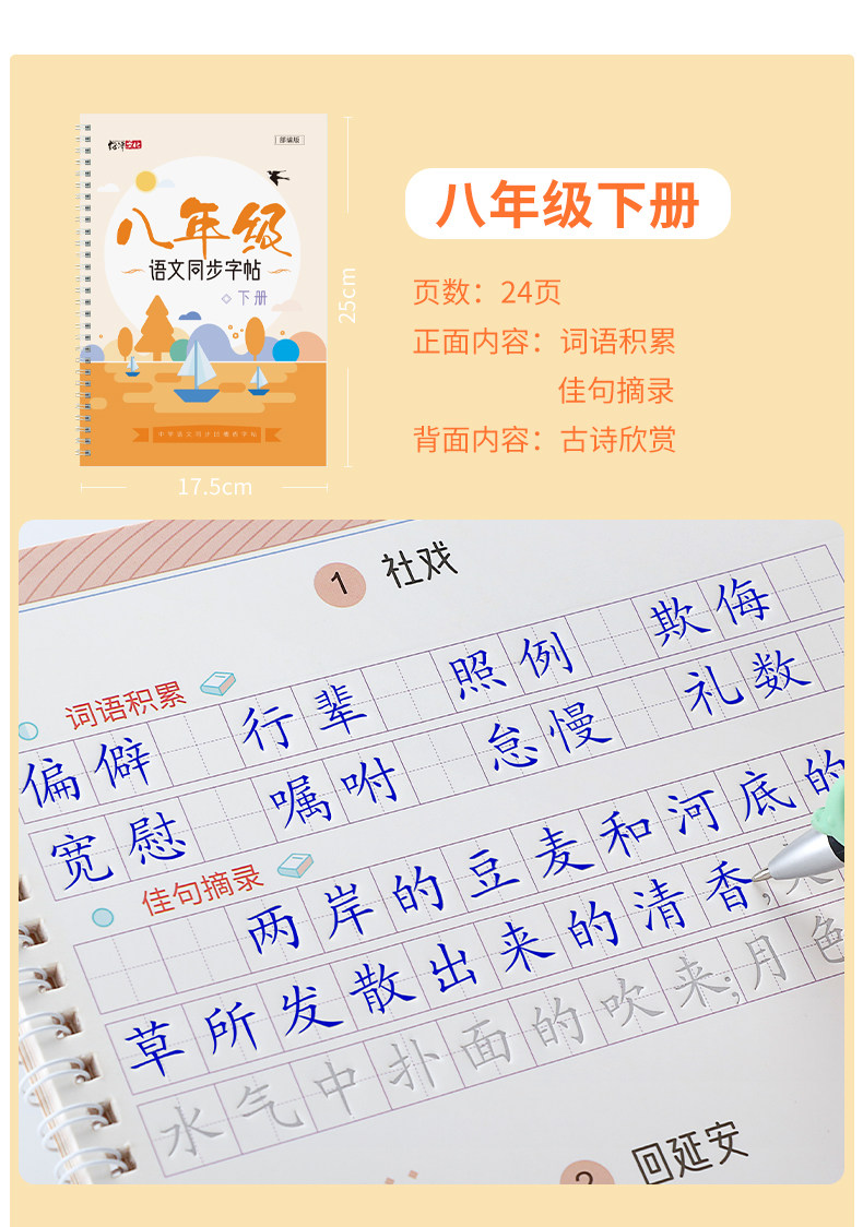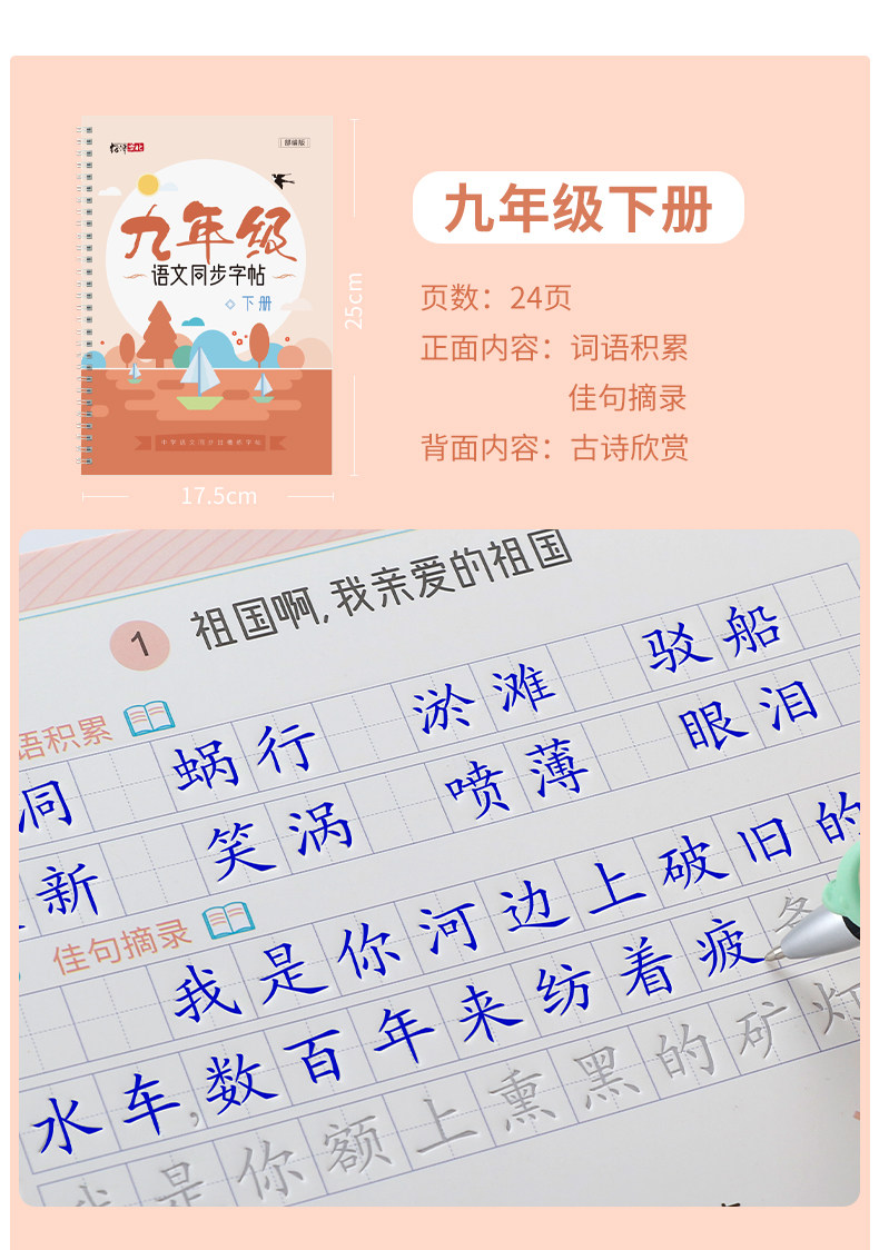 Light Luxury Mo Pin Groove Handwriting Practice Book for Junior High School Grades 7, 8, and 9, First and Second Semester, Synchronized with the People's Education Press Edition of the Chinese Textbook, Reusable Writing Practice Book, a Must-Have for Junior High School Students in Grades 7, 8, and 9