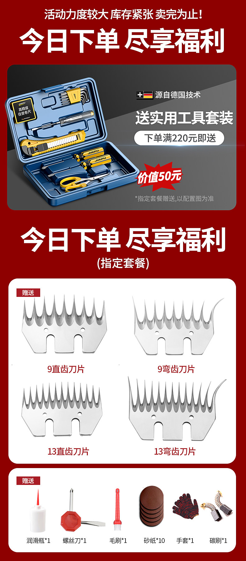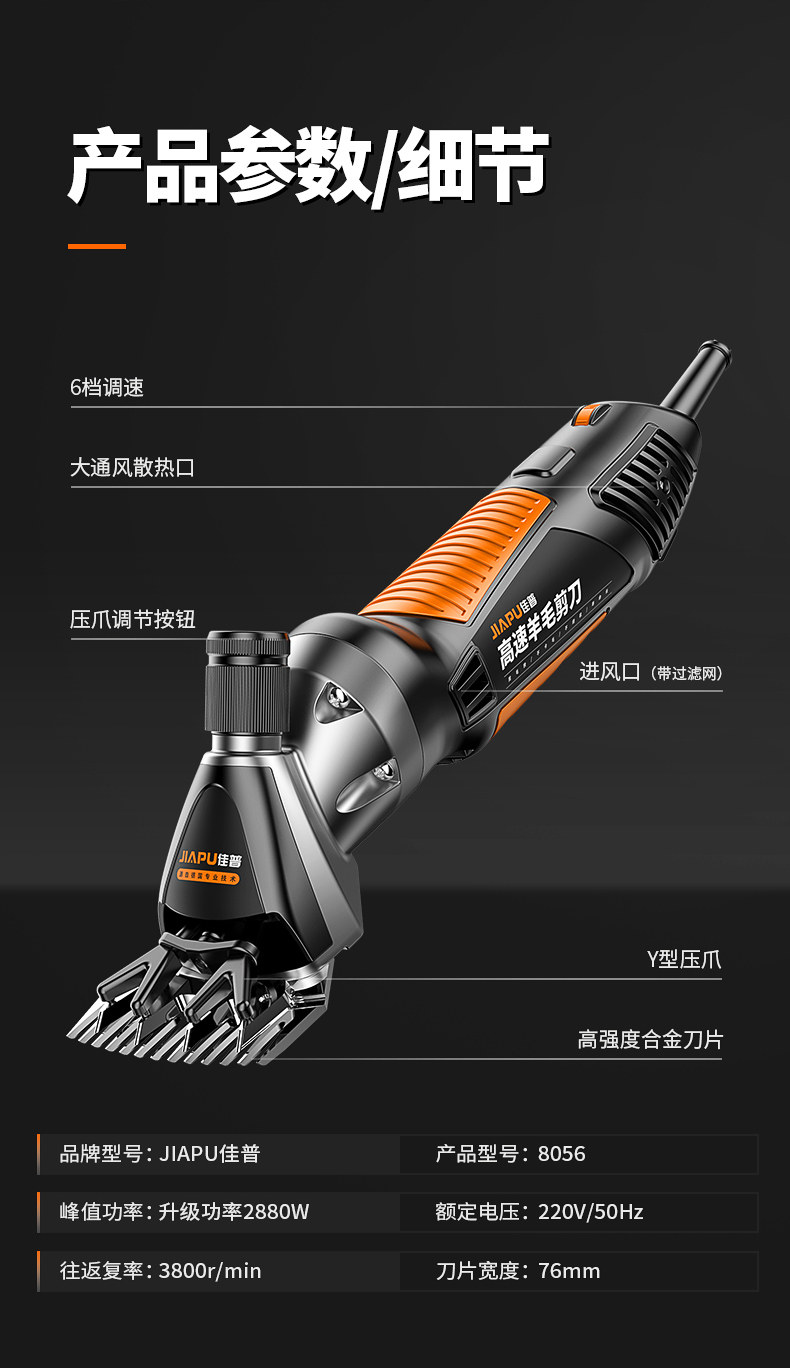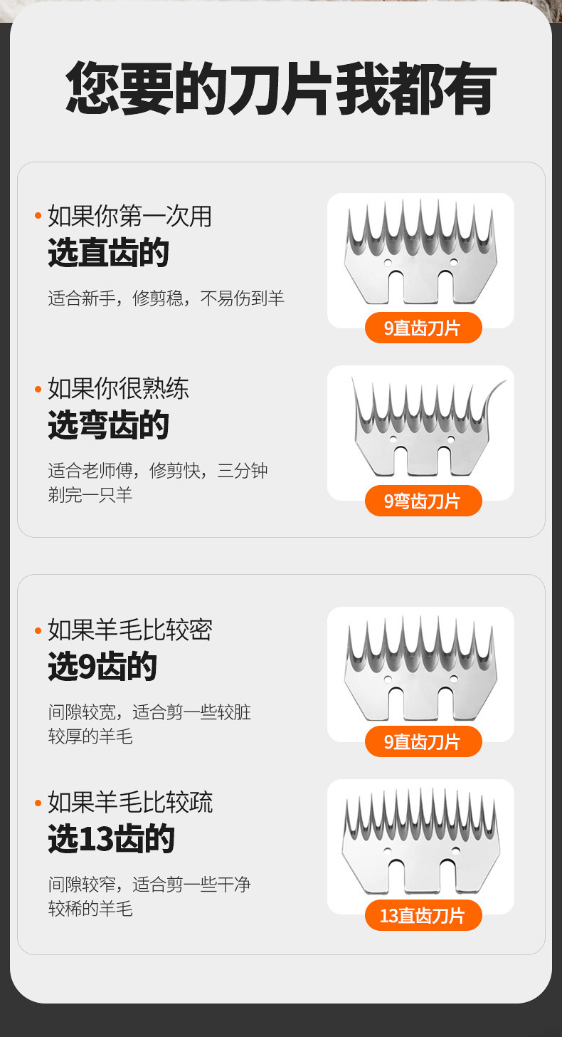 | Color Classification | Jiapu Wool Shears Are Suitable for All Sheep. All Wool Can Be Removed with One Push,Shearing Quickly Without Hurting the Sheep, Easily Shearing Thousands of Sheep,Silky Smooth, No Snagging, Instant Cutting. Razor Sharp Blades for a Clean, Effortless Cut,5m Extended Power Cord,Shave with Ease, No Matter the Distance!!!,The T18 Blade Can Be Used for Ten Years Without Replacement and Can Shear Thousands of Sheep a Day,Supreme Edition[6999W] 9 Straight Tooth Blades + 4 Tooth Adjustment Blades, Extended Power Cord about 5m,Supreme Edition[6999W] 13 Straight Tooth Blades + 4 Tooth Adjustment Blades, Extended Power Cord about 5m,Supreme Edition[6999W]9 Curved Tooth Blades + 4 Tooth Adjustment Blades, Extended Power Cord about 5m,Supreme Edition[6999W] 13 Curved Tooth Blades + 4 Tooth Adjustment Blades, Extended Power Cord about 5m,Supreme Edition[6999W] 9 Straight Tooth Blades + 9 Curved Tooth Blades + 4 Tooth Adjustment Blades, Extended Power Cord about 5m,Supreme Edition[6999W] 13 Straight Tooth Blades + 13 Curved Tooth Blades + 4 Tooth Adjustment Blades, Extended Power Cord about 5m,Supreme Edition[6999W] 4-Tooth Adjustable Blade + All-Purpose Blade Set,Exclusively for Sheep Farms[7999W] 9 Straight Tooth Blades + 4 Tooth Adjustment Blades, Extended Power Cord about 5m,Exclusively for Sheep Farms[7999W] 13 Straight Tooth Blades + 4 Tooth Adjustment Blades, Extended Power Cord about 5m,Exclusively for Sheep Farms[7999W] 9 Curved Tooth Blades + 4 Tooth Adjustment Blades, Extended Power Cord about 5m,Exclusively for Sheep Farms[7999W] 13 Curved Tooth Blades + 4 Tooth Adjustment Blades, Extended Power Cord about 5m,Exclusively for Sheep Farms[7999W] 9 Straight Tooth Blades + 9 Curved Tooth Blades + 4 Tooth Adjustment Blades, Extended Power Cord about 5m,Exclusively for Sheep Farms[7999W] 13 Straight Tooth Blades + 13 Curved Tooth Blades + 4 Tooth Adjustment Blades, Extended Power Cord about 5m,Exclusively for Sheep Farms[7999W] 4-Tooth Adjustable Blade + All-Purpose Blade Set,Celebrity Recommendation[8999W] 9 Straight Tooth Blades + 4 Tooth Adjustable Blades, Extended Power Cord about 5m,Celebrity Recommendation[8999W] 13 Straight Tooth Blades + 4 Tooth Adjustment Blades, Extended Power Cord about 5m,Celebrity Recommendation[8999W] 9 Curved Tooth Blades + 4 Tooth Adjustment Blades, Extended Power Cord about 5m,Celebrity Recommendation[8999W] 13 Curved Tooth Blades + 4 Tooth Adjustment Blades, Extended Power Cord about 5m,Celebrity Recommended 8999W 4-Tooth Adjustable Blade + 9 Straight Tooth Blades + 9 Curved Tooth Blades, Extended Power Cord Approximately 5m,Celebrity Recommended 8999W 4-Tooth Adjustable Blade + 13 Straight Tooth Blades + 13 Curved Tooth Blades, Extended Power Cord Approximately 5m,Celebrity Recommended 8999W 4-Tooth Adjustable Blade + All-Purpose Blade |