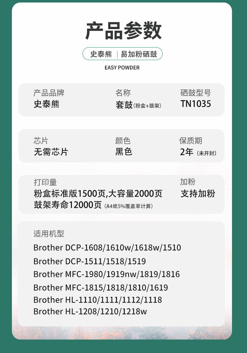 | Color | Standard Version Dcp-1518 Powder Box (Quality Assurance. Only Replacement, No Replacement,Large Capacity Dcp-1518 Powder Box (Upgraded Printing Capacity, Clear Printing, Buy 5 and Get 1 Free),Separate Dcp-1518 Drum Stand, Needs to Be Used with Matching Powder Box,Standard Version Dcp-1518 Set (Ready to Use. Clear Printing. Buy 5 and Get 1 Free),Large Capacity Version of Dcp-1518 Set (Ready to Use. Buy 5 and Get 1 Free),Standard Version Dcp-1518 Set (Sf Express Free Shipping) |