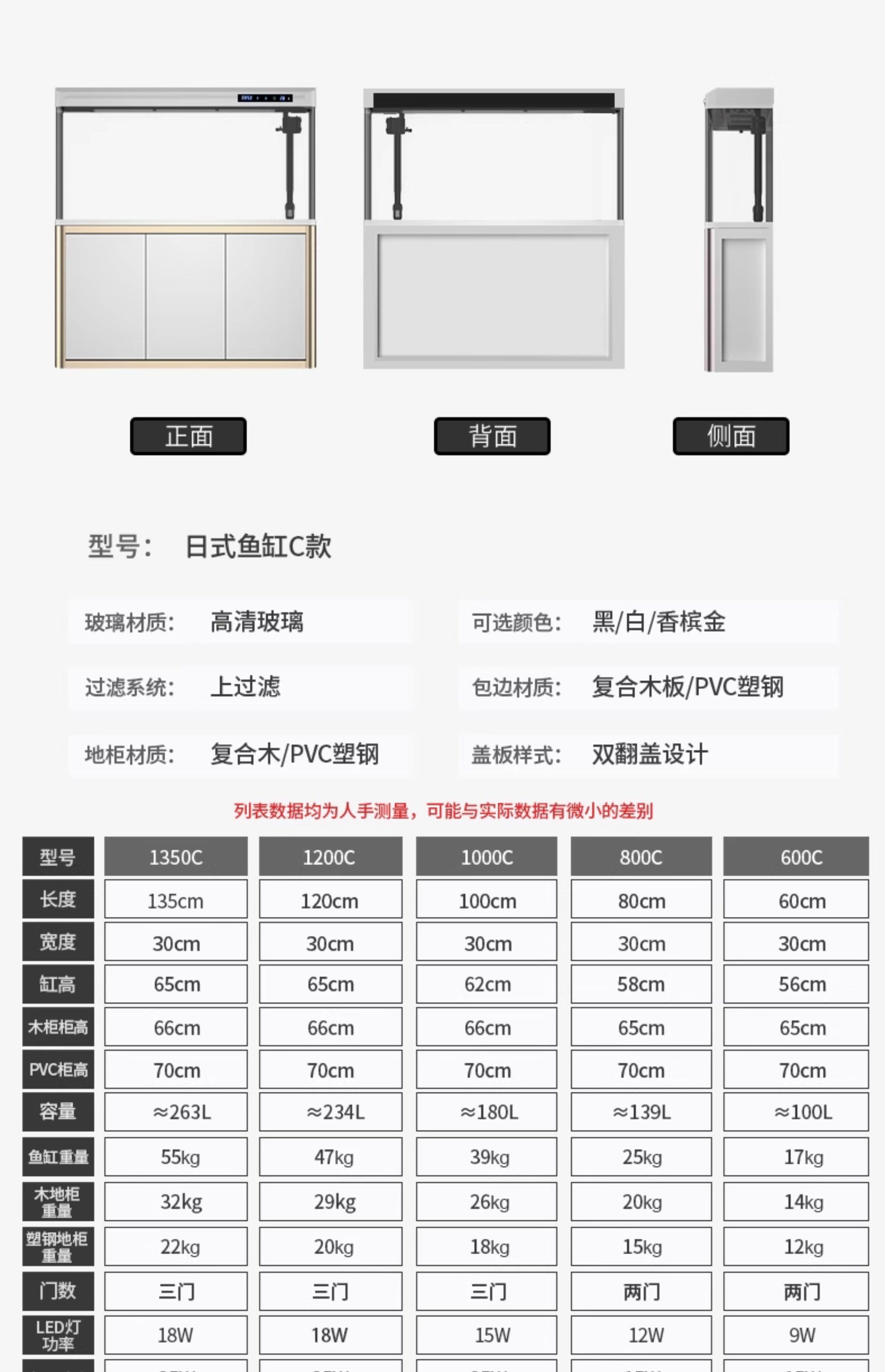 | Color Classification | 600C Fish Tank Official Configuration (Champagne Gold),600C Fish Tank + Landscaping (Champagne Gold),600C Fish Tank + Floor Cabinet (Champagne Gold),600C Fish Tank + Floor Cabinet + Landscaping (Champagne Gold),800C Fish Tank Official Configuration (Champagne Gold),800C Fish Tank + Landscaping (Champagne Gold),800C Fish Tank + Floor Cabinet (Champagne Gold),800C Fish Tank + Floor Cabinet + Landscaping (Champagne Gold),1000C Fish Tank Official Configuration (Champagne Gold),1000C Fish Tank + Landscaping (Champagne Gold),1000C Fish Tank + Floor Cabinet (Champagne Gold),1000C Fish Tank + Floor Cabinet + Landscaping (Champagne Gold),1200C Fish Tank Official Configuration (Champagne Gold),1200C Fish Tank + Landscaping (Champagne Gold),1200C Fish Tank + Floor Cabinet (Champagne Gold),1200C Fish Tank + Floor Cabinet + Landscaping (Champagne Gold),1350C Fish Tank Official Configuration (Champagne Gold),1350C Fish Tank + Landscaping (Champagne Gold),1350C Fish Tank + Floor Cabinet (Champagne Gold),1350C Fish Tank + Floor Cabinet + Landscaping (Champagne Gold) |