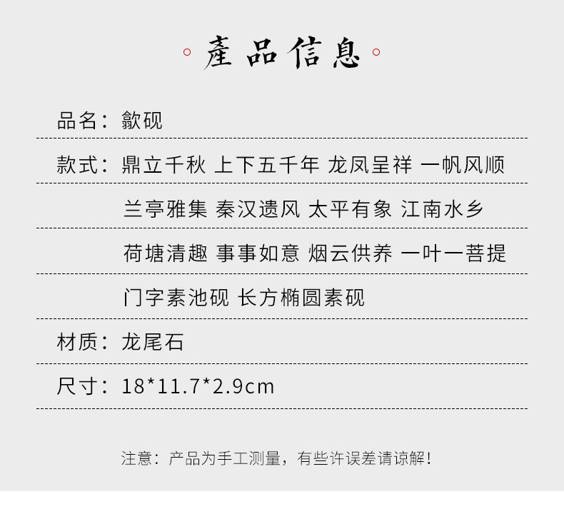 | Color Classification | Smooth Sailing,Lanting Yaji,Jiangnan Water Town,Standing Tall for Thousands of Years,Five Thousand Years up and down,Dragon and Phoenix,The Legacy of Qin and Han Dynasties,There Is an Elephant in Taiping,The Serenity of Lotus Pond,Everything Goes Well,Smoke Offering,One Leaf and One Bodhi,Door-Shaped Plain Pool Inkstone,Rectangular Oval Inkstone |