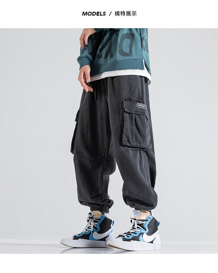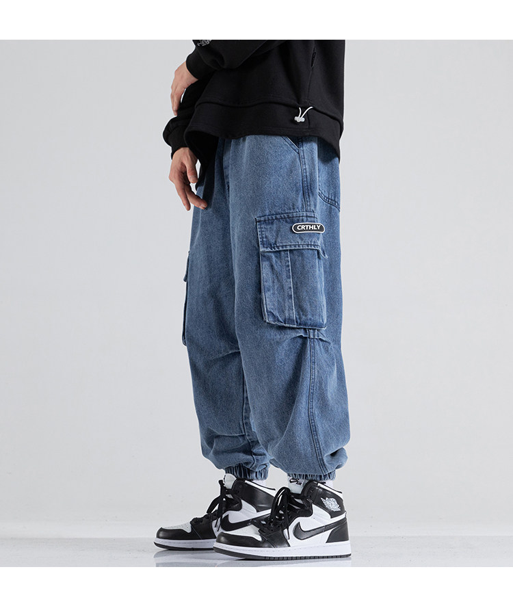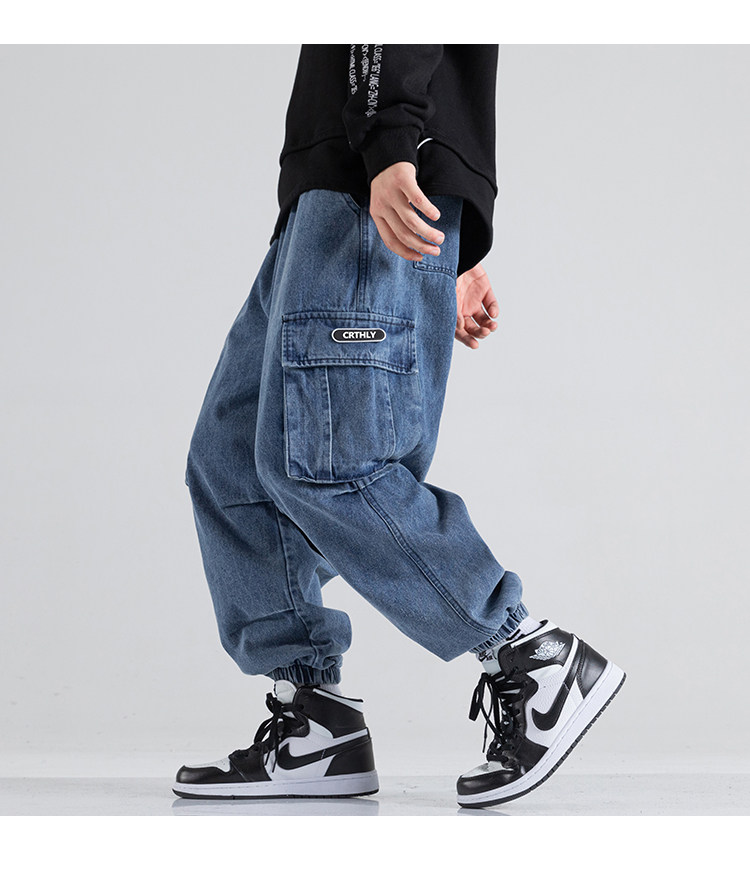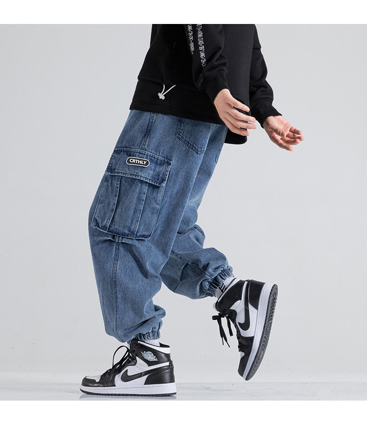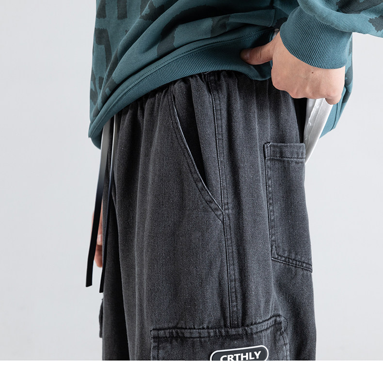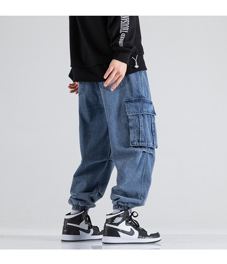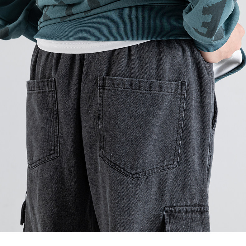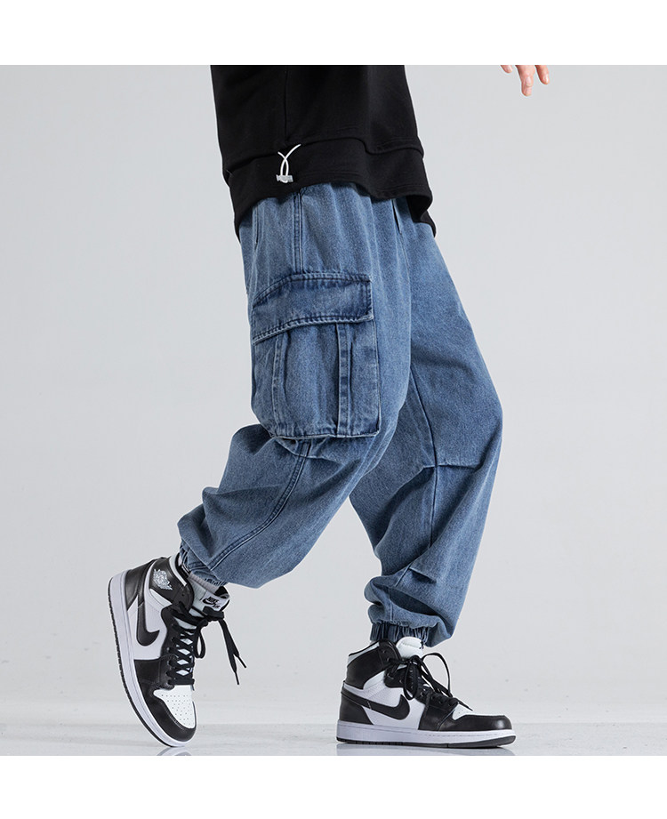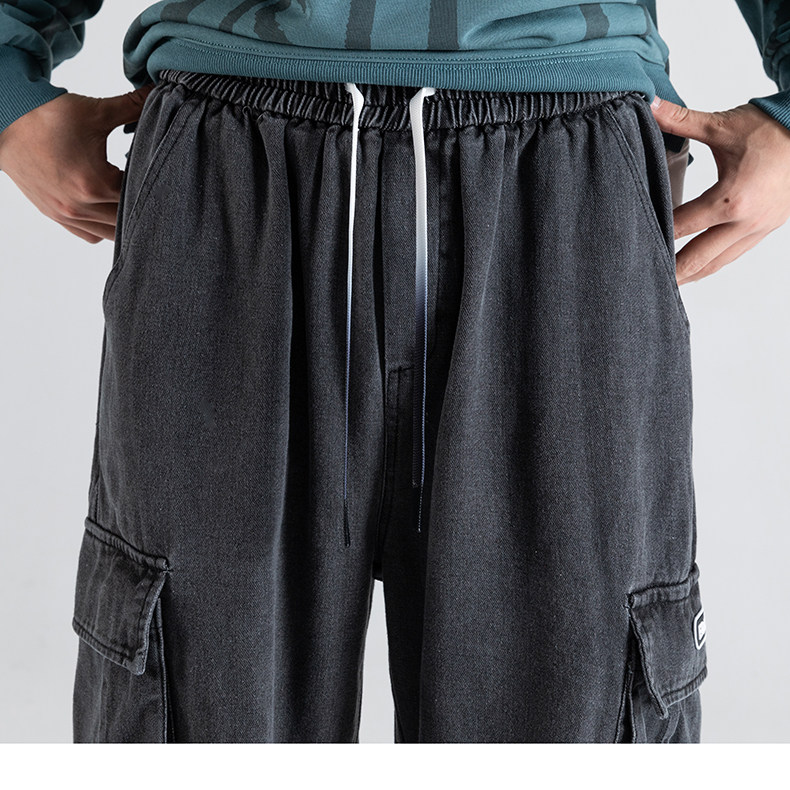 Men's Large Pocket Jeans for Autumn and Winter, Plus-Size, Loose Fit, Japanese Retro Style, Washed, Fleece-Lined, Thickened, Jogger Cargo Pants