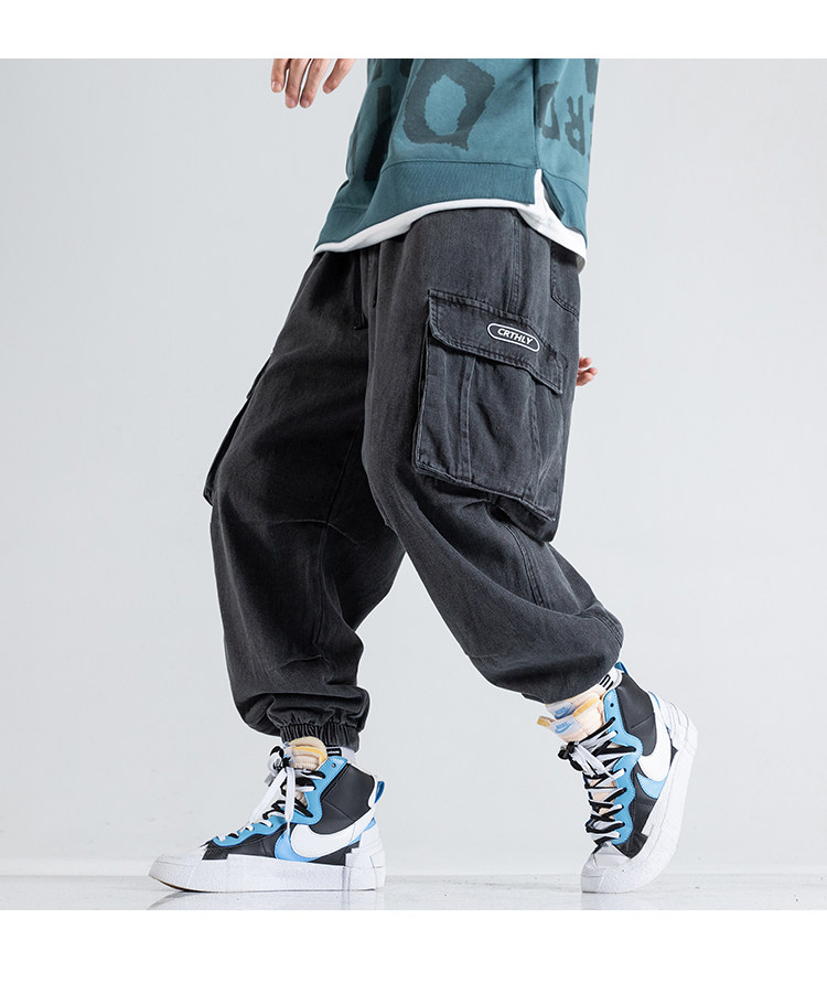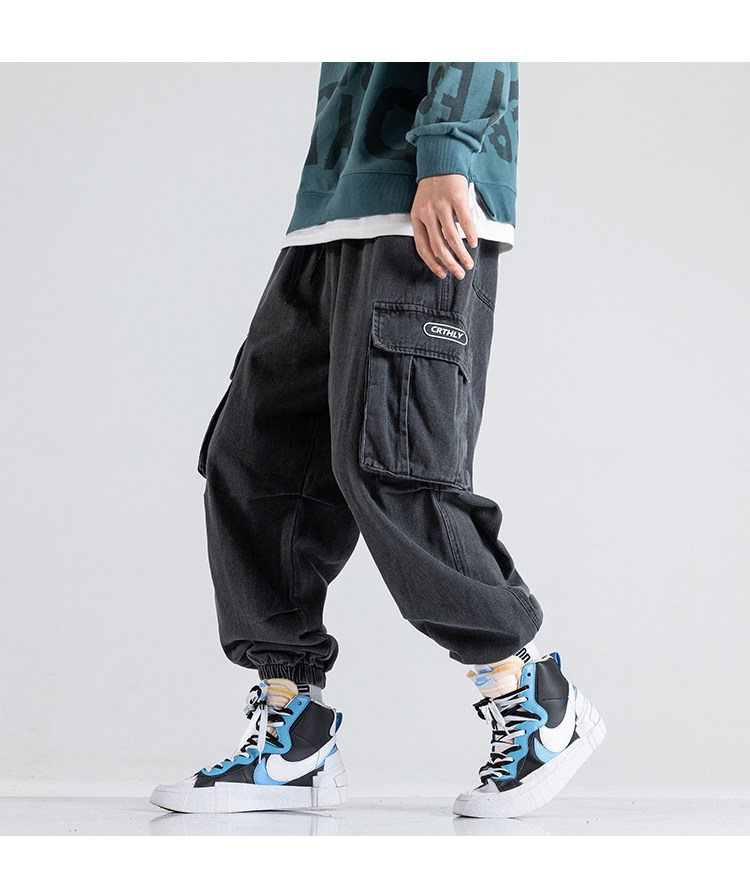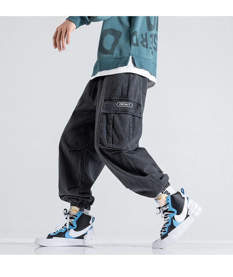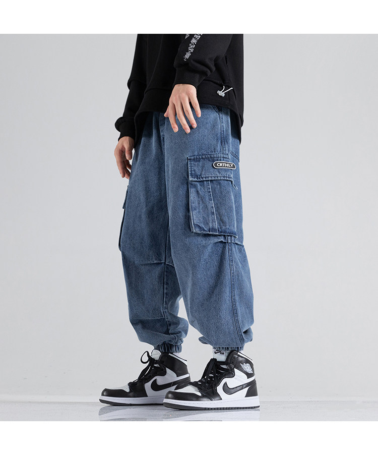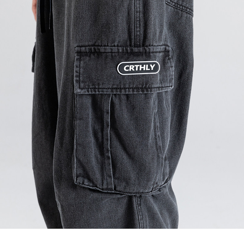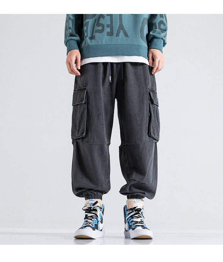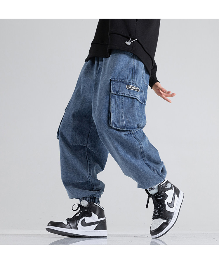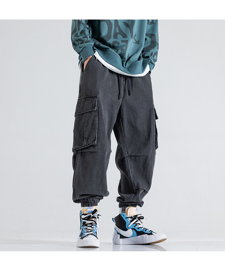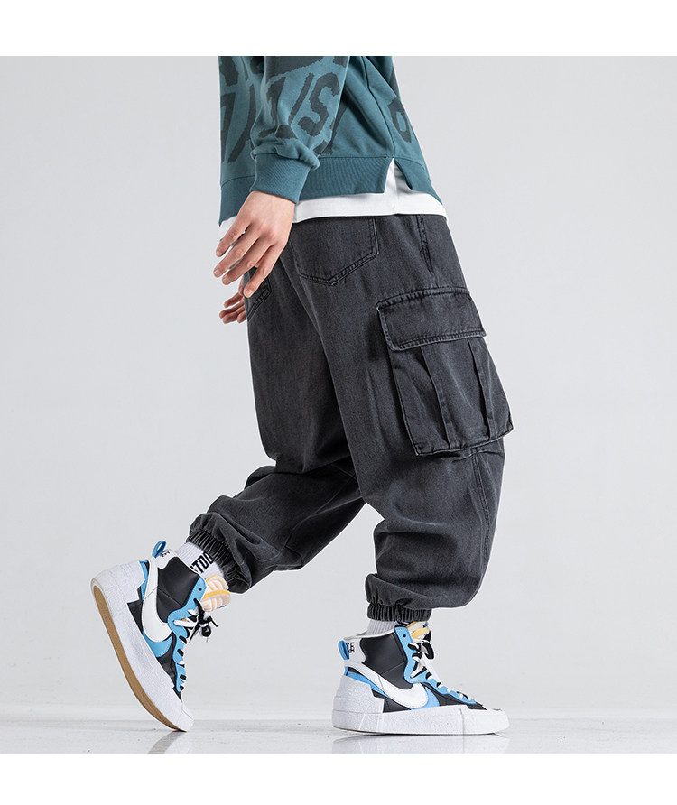 Men's Large Pocket Jeans for Autumn and Winter, Plus-Size, Loose Fit, Japanese Retro Style, Washed, Fleece-Lined, Thickened, Jogger Cargo Pants