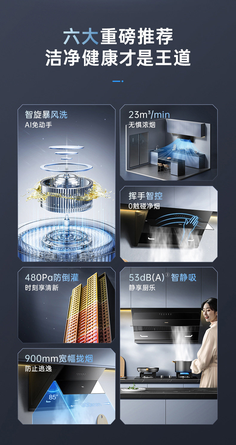 | Color Classification | [Set 1] 23m³ Automatic Cleaning/Wave Intelligent Control/4.2Kw Energy-Saving Fierce Fire (Aj4+Ka031B)-2628,[Set 2] 23m³ Automatic Cleaning/Wave Intelligent Control/5.0Kw Fierce Stir-Frying Fire (Aj4+Ay4C)-2738,[Set 3] 23m³ Automatic Cleaning/Wave Intelligent Control/5.1Kw Red Dot Anti-Scalding (Aj4+Tac5)-2838,[Set 4] 23m³ Automatic Cleaning/Wave Intelligent Control/5.2Kw Energy Gathering Fierce Fire (Aj4+Lay8)-2838,[Set 5] 24m³ Supercharged Smart Suction/Ai Intelligent Control 0 Hands/5.0Kw Fierce Stir-Fry Fire (Al5+Ay4C)-2838,[Set 6] 24m³ Supercharged Smart Suction/Ai Intelligent Control 0 Hands/5.0Kw Intelligent Connection Fierce Fire (Al5+Kv063B)-3138 |