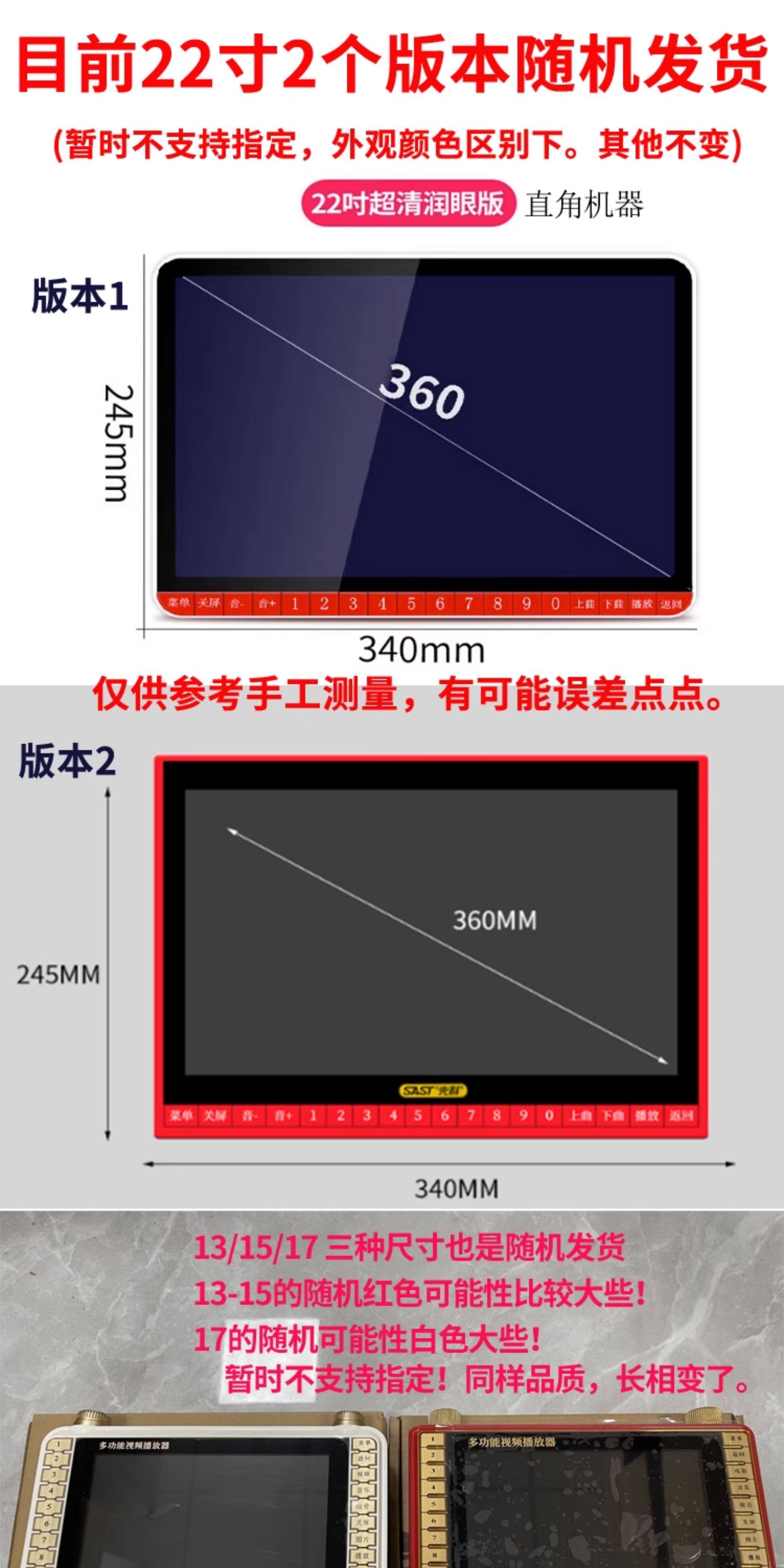 Color Classification 13inch Ultra-Clear Upgrade [Type-C Charging Port + Warranty] + You Need to Provide Your Own Card/U Disk,13inch Ultra-Clear Upgrade [Type-C Charging Port] + Free [16Gu Disk (Built-In 578 Files],13inch Ultra-Clear Upgrade [Type-C Charging Port] + Free [32Gu Disk (Built-In 977 Files],13inch Ultra-Clear Upgrade [Type-C Charging Port] + Free [64Gu Disk (Built-In 1395 Files],13inch Ultra-Clear Upgrade + [Type-C Charging Port + Free [128Gu Disk (Built-In 2103 Files)],13inch Ultra-Clear Upgrade [Type-C Charging Port] + Free [256Gu Disk (Built-In 2488 Files],13inch Ultra-Clear Upgrade [Type-C Charging Port] + Warranty + Free [500Gu Disk (Built-In 3544 Files),15inch Ultra-Clear Upgrade [Type-C Charging Port + Warranty + You Need to Provide Your Own Card / USB Flash Drive,15inch Ultra-Clear Upgrade [Type-C Charging Port] + Free [16Gu Disk (Built-In 578 Files],15inch Ultra-Clear Upgrade [Type-C Charging Port] + Free [32Gu Disk (Built-In 977 Files],15inch Ultra-Clear Upgrade [Type-C Charging Port] + Free [64Gu Disk (Built-In 1395 Files],15inch Ultra-Clear Upgrade [Type-C Charging Port] + Free [128Gu Disk (Built-In 2103 Files],15inch Ultra-Clear Upgrade [Type-C Charging Port] + Free [256Gu Disk (Built-In 2488 Files)],15inch Ultra-Clear Upgrade [Type-C Charging Port] + Free [500Gu Disk with 3544 Files Built-In],17inch Ultra-Clear Upgrade [Type-C Charging Port] + Warranty + You Need to Provide Your Own Card/U Disk,17inch Ultra-Clear Upgrade [Type-C Charging Port] + Free [16Gu Disk (Built-In 578 Files],17inch Ultra-Clear Upgrade [Type-C Charging Port] + Free [32Gu Disk (Built-In 977 Files],17inch Ultra-Clear Upgrade [Type-C Charging Port] + Free [64Gu Disk (Built-In 1395 Files],17inch Ultra-Clear Upgrade [Type-C Charging Port] + Free [128Gu Disk (Built-In 2103 Files],17inch Ultra-Clear Upgrade [Type-C Charging Port] + Free [256Gu Disk (Built-In 2488 Files],17inch Ultra-Clear Upgrade [Type-C Charging Port] + Free [500Gu Disk with 3544 Files Built-In],19inch Ultra-Clear Upgrade [Type-C Charging Port] + Warranty + You Need to Provide Your Own Card/U Disk,19inch Ultra-Clear Upgrade [Type-C Charging Port] + Free [16Gu Disk (Built-In 578 Files],19inch Ultra-Clear Upgrade [Type-C Charging Port] + Free [32Gu Disk (Built-In 977 Files],19inch Ultra-Clear Upgrade [Type-C Charging Port] + Free [64Gu Disk (Built-In 1395 Files],19inch Ultra-Clear Upgrade [Type-C Charging Port] + Free [128Gu Disk (Built-In 2103 Files],19inch Ultra-Clear Upgrade [Type-C Charging Port] + Free [256Gu Disk (Built-In 2488 Files],19inch Ultra-Clear Upgrade [Type-C Charging Port] + Free [500Gu Disk with 3544 Files Built-In],22inch Ultra-Clear Upgrade [Type-C Charging Port] + Warranty + Free Remote Control + You Need to Provide Your Own Card/U Disk,22inch Ultra-Clear Upgrade [Type-C Charging Port] + Free Remote Control + [16Gu Disk (Built-In 578 Files],22inch Ultra-Clear Upgrade [Type-C Charging Port] + Free Remote Control + [32Gu Disk (Built-In 977 Files],22inch Ultra-Clear Upgrade [Type-C Charging Port] + Free Remote Control [64Gu Disk (Built-In 1395 Files),22inch Ultra-Clear Upgrade [Type-C Charging Port] Comes with Remote Control + [128Gu Disk (Built-In 2103 Files],22inch Ultra-Clear Upgrade [Type-C Charging Port] Comes with Remote Control + [256Gu Disk (Built-In 2488 Files)],22inch Ultra-Clear Upgrade [Type-C Charging Port] Comes with Remote Control + [500Gu Disk Built-In 3544 Files],25inch Ultra-Clear Flagship [Type-C Charging Port] + Warranty + Free Remote Control + You Need to Provide Your Own Card/Usb Flash Drive,25inch Ultra-Clear Flagship [Type-C Charging Port] + Free Remote Control + [16Gu Disk (Built-In 578 Files],25inch Ultra-Clear Flagship [Type-C Charging Port] + Free Remote Control + [32Gu Disk (Built-In 977 Files],25inch Ultra-Clear Flagship [Type-C Charging Port] + Free Remote Control [64Gu Disk (Built-In 1395 Files),25inch Ultra-Clear Flagship [Type-C Charging Port] Comes with Remote Control + [128Gu Disk (Built-In 2103 Files],25inch Ultra-Clear Flagship [Type-C Charging Port] Comes with Remote Control + [256Gu Disk (Built-In 2488 Files)],25inch Ultra-Clear Dvd Player + Free Remote Control + You Need to Provide Your Own Card/U Disk,25inch Ultra-Clear Dvd Player + Free Remote Control [32Gu Disk (Built-In 977 Files)],25inch Ultra-Clear Dvd Player + Free Remote Control [16Gu Disk (Built-In 578 Files)],25inch Ultra-Clear Dvd Player + Free Remote Control [64Gu Disk (Built-In 1395 Files)],25inch Ultra-Clear Dvd Player + Free Remote Control [128Gu Disk (Built-In 2103 Files)],25inch Ultra-Clear Dvd Playback Version + Free Remote Control [256Gu Disk (Built-In 2488 Files)],25inch Ultra-Clear Dvd Playback Version + Free Remote Control [500Gu Disk Built-In 3544 Files],25inch Ultra-Clear Network Android (App Can Be Downloaded) [Type-C Charging Port] + Free Remote Control + Sea Resources,25inch Ultra-Clear Network Android (App Can Be Downloaded) [Type-C Charging Port] + Free Remote Control [16Gu Disk (Built-In 578 Files)],25inch Ultra-Clear Network Android (Can Download App) [Type-C Charging Port] Comes with Remote Control [32Gu Disk (Built-In 977 Files)],25inch Ultra-Clear Network Android Version (App Can Be Downloaded) [Type-C Charging Port] Comes with Remote Control [64Gu Disk (Built-In 1395 Files)],25inch Ultra-Clear Network Android (App Can Be Downloaded) [Type-C Charging Port] + Free Remote Control [128Gu Disk (Built-In 2103 Files)],25inch Ultra-Clear Network Android Version (App Can Be Downloaded) [Type-C Charging Port] + Free Remote Control [256Gu Disk (Built-In 2488 Files)],27inch Touch Ultra-Clear Network Android (Can Download App) [Type-C Charging Port] + Free Remote Control [500Gu Disk Built-In 3544 Files]