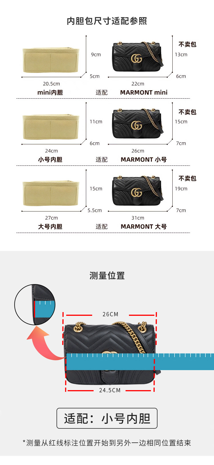 Suitable for Gucci Marmont Liner Bag Gucci 16.5/22/26/31 Bag Medium Bag Cosmetics Bag Zipper