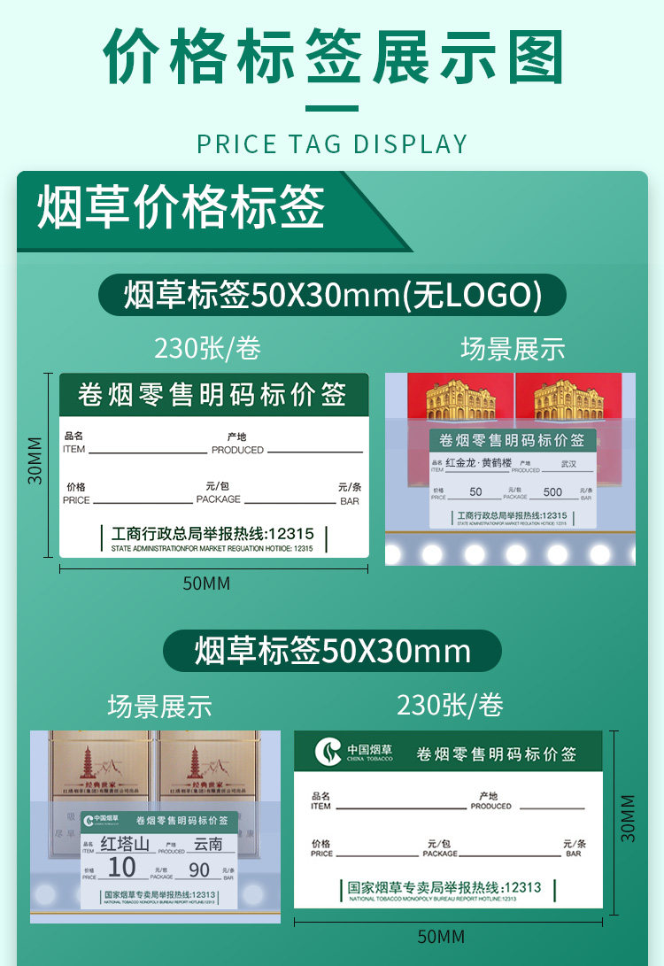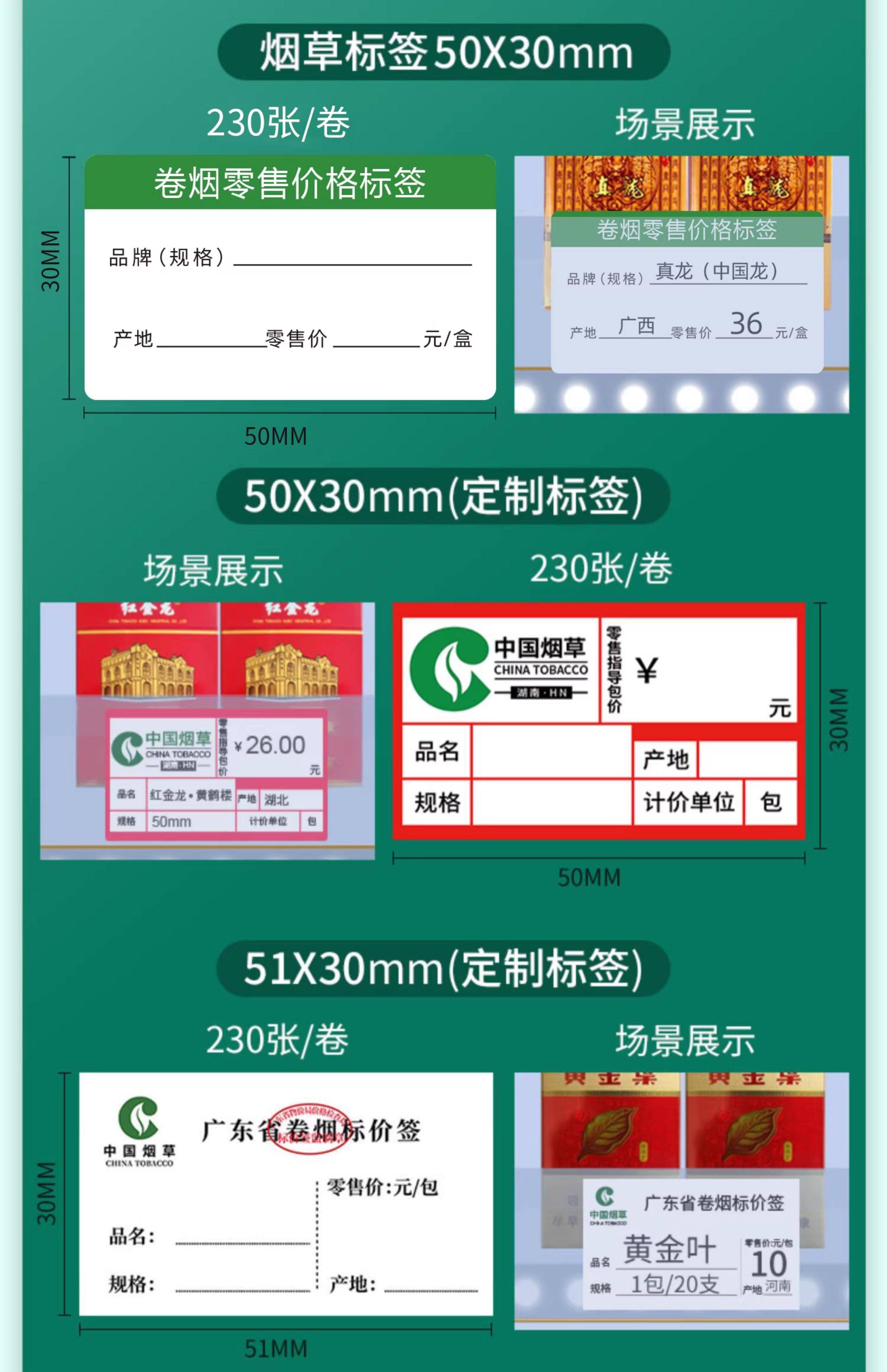 | Color Classification | [Tobacco 1] 50*30Mm-Dark Green Universal Style (Sticker) 230 Sheets/Roll,[Tobacco 2] 50*25Mm-Dark Green Universal Style (Sticker) 300 Sheets/Roll,[Tobacco 3] 50*30Mm-Light Color Same Style as Tobacco Bureau (Cardboard) 230 Sheets/Roll,[Tobacco 4] 50*30Mm-Tobacco Neutral C Style (Sticker) 230 Sheets/Roll,[Tobacco 5] 50X30Mm-Yellow Background Price Grid Style (Sticker) 230 Sheets/Roll,[Tobacco 6] 50*30Mm-Light Green Universal Style (Sticker) 230 Sheets/Roll,[Tobacco 7] 50*25Mm-Light Color Universal Style (Sticker) 300 Sheets,[Tobacco 8] 50*30Mm-Tobacco Bureau Hotline (Sticker) 230 Sheets/Roll,[Tobacco 9] 50*30Mm-Industrial and Commerce Bureau Hotline (Sticker) 230 Sheets/Roll,The Following Options Are (Regional Version) ------ Tobacco Label,Hunan Tobacco 50*30mm/200 Sheets,Hefei Tobacco 50*30mm/230 Sheets,Luan Tobacco 55*30mm/200 Sheets,Shaoyang Tobacco 50*25mm/250 Sheets,Guangxi Tobacco 50*30mm/200 Sheets,23*55mm Ningbo Tobacco Cardboard Vertical Version/130 Sheets,Chongqing Tobacco 49*35mm/200 Sheets,(Width) Chongqing Tobacco 53*31mm/200 Sheets,Liaoning Tobacco 50*30mm/200 Sheets,Wuhan Tobacco 50*30mm / 200 Sheets,Guangdong Tobacco Dark Color 50*30mm/200 Sheets,Texas Tobacco 50*30mm/200 Sheets,9mm Digital Printing + Ink Pad |