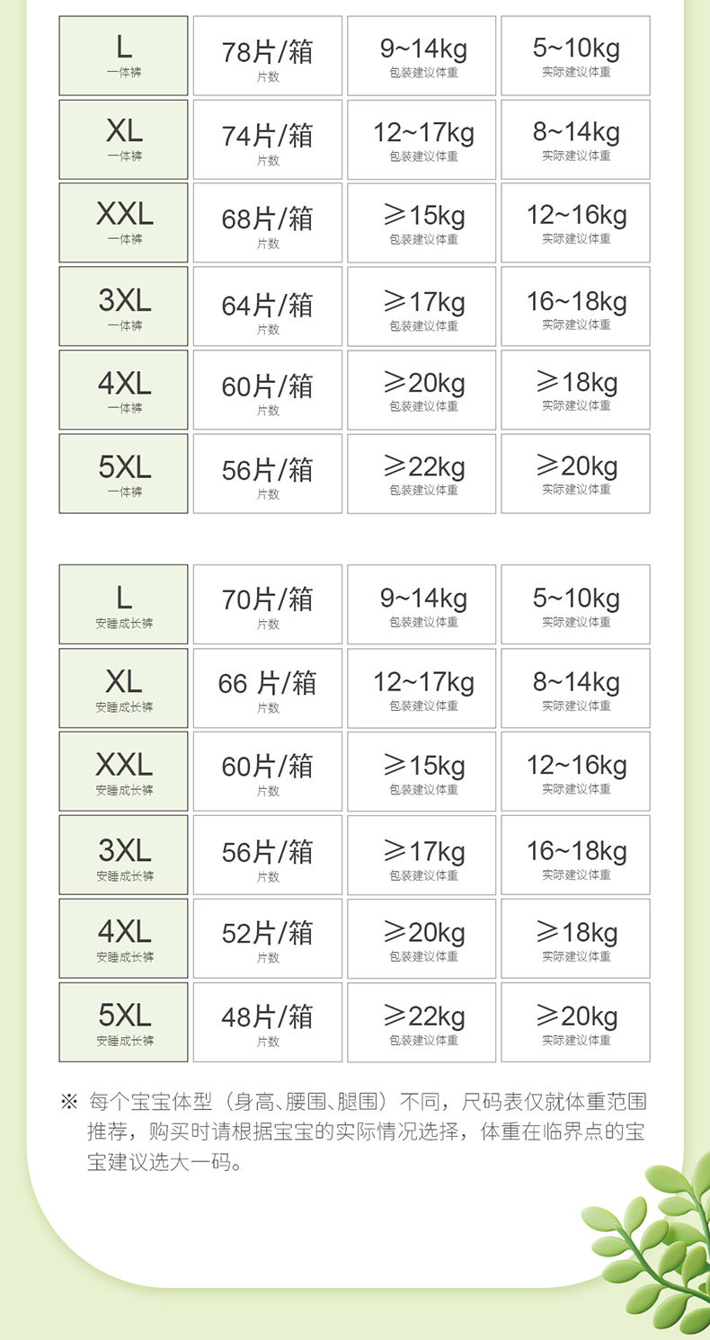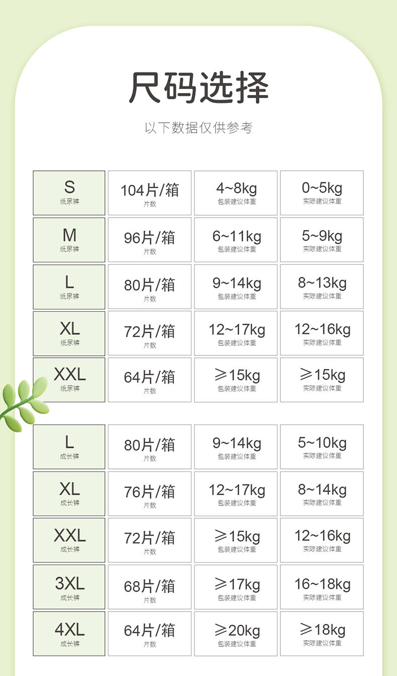 | Color Classification | All-Inclusive Pull-Up Pants L Size 78 Pieces (5-10kg,All-Inclusive Pull-Up Pants XL Size 74 Pieces (8-14kg),All-Inclusive Pull-Up Pants 2XL Size 68 Pieces (12-16kg),All-Inclusive Pull-Up Pants 3XL Size 64 Pieces (16-18kg),All-Inclusive Pull-Up Pants 4XL Size 60 Pieces (18kg +),All-Inclusive Pull-Up Pants 5XL Size 56 Pieces (20kg +),Diapers S Size 104 Pieces (0-5kg),Diapers m Size 96 Pieces (5-9kg),Diapers L Size 80 Pieces (8-13kg),Diapers XL Size 72 Pieces (12-16kg),Diapers XXL Size 64 Pieces (16kg +),Night-Use All-In-One Pants L Size 70 Pieces (5-10kg,Night-Use All-In-One Pants XL Size 66 Pieces (8-14kg),Night-Use All-In-One Pants 2XL Size 60 Pieces (12-16kg),Night-Use All-In-One Pants, Size 3XL, 56 Pieces (16-18kg),Night-Use All-In-One Pants 4XL Size 52 Pieces (18kg +),Night-Use All-In-One Pants 5XL Size 48 Pieces (20kg +),Half Pack of Pull-Up Pants, Size L, 80 Pieces (5-10kg),Half Pack of Pull-Up Pants XL Size 76 Pieces (8-14kg),Half Pack of Pull-Up Pants 2XL Size 72 Pieces (12-16kg),Half Pack of Pull-Up Pants, Size 3XL, 68 Pieces (16-18kg),Half Pack of Pull-Up Pants 4XL Size 64 Pieces (18kg +) |