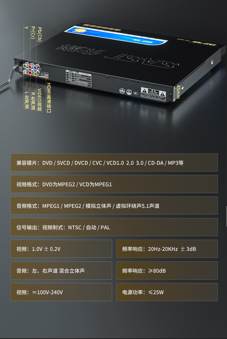 | Playback Format | MP3-CD,CD,RMVB,SVCD,MPEG4,VCD,DVD |