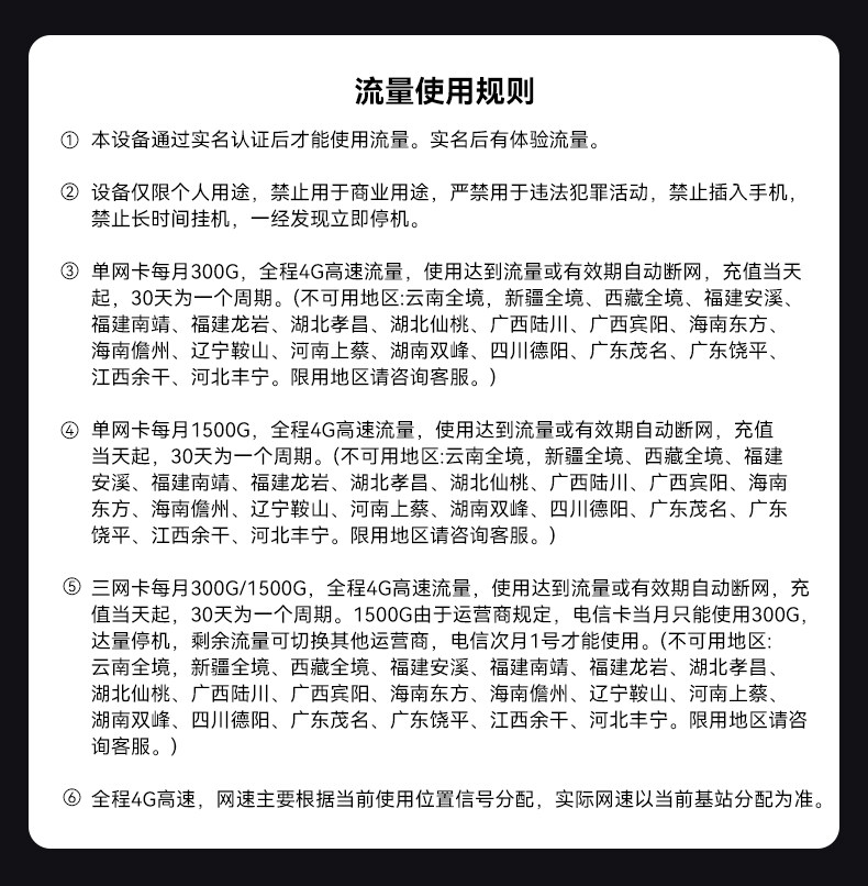 | Data Plan | 50G/Month*1 Month,1500G/Month*3 Months,1500G/Month*12 Months,1500G/Month*1 Month,300G/Month*1 Month,300G/Month*3 Months,300G/Month*6 Months,300G/Month*12 Months,1500G/Month*6 Months,100G/Month*1 Month |