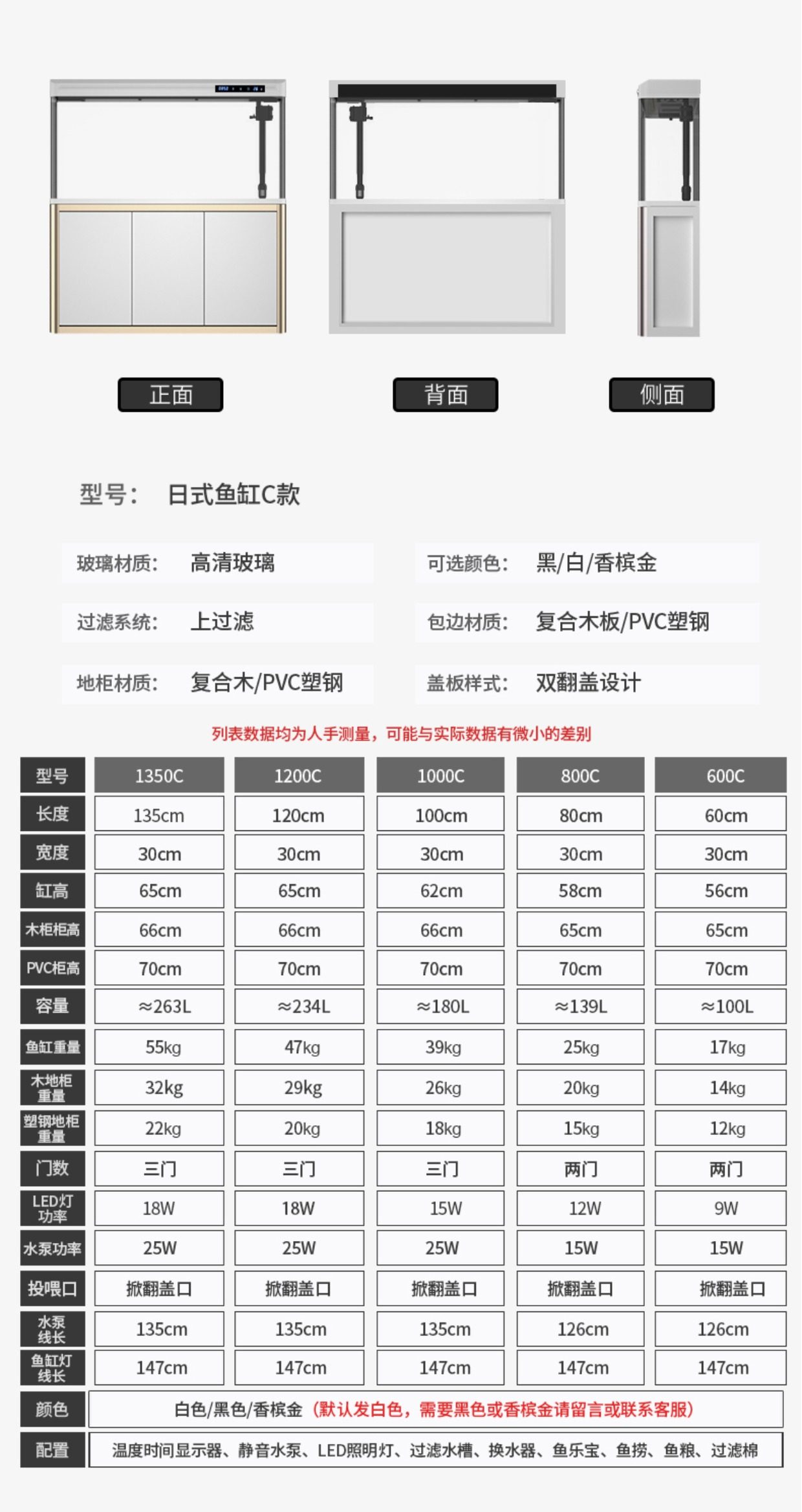 | Color Classification | 600C Official Version (with Display) White,600C Official Version (with Display) Black,600C Fish Tank + Landscaping (with Display) White,600C Fish Tank + Landscaping (with Display) Black,600C Fish Tank + Wooden Floor Cabinet (with Monitor) White,600 Fish Tank + Wooden Floor Cabinet (with Monitor) Black,600C Fish Tank + Wooden Floor Cabinet + Landscaping (with Monitor) White,600C Fish Tank + Wooden Floor Cabinet + Landscaping (with Monitor) Black,600C Fish Tank + Pvc Floor Cabinet (with Monitor) White,600C Fish Tank + Pvc Floor Cabinet (with Monitor) Black,600C Fish Tank + Pvc Floor Cabinet + Landscaping (with Monitor) White,600C Fish Tank + Pvc Floor Cabinet + Landscaping (with Monitor) Black,800C Official Version (with Display) White,800C Official Configuration (with Display) - Black,800C Fish Tank + Landscaping (with Display) White,800C Fish Tank + Landscaping (with Display) Black,800C Fish Tank + Wooden Floor Cabinet (with Monitor) White,800C Fish Tank + Wooden Floor Cabinet (with Monitor) Black,800C Fish Tank + Wooden Floor Cabinet + Landscaping (with Monitor) White,800C Fish Tank + Wooden Floor Cabinet + Landscaping (with Monitor) Black,800C Fish Tank + Pvc Floor Cabinet (with Monitor) White,800C Fish Tank + Pvc Floor Cabinet (with Monitor) Black,800C Fish Tank + Pvc Floor Cabinet + Landscaping (with Monitor) White,800C Fish Tank + Pvc Floor Cabinet + Landscaping (with Monitor) Black,1000C Official Version (with Display) White,1000C Official Version (with Display) Black,1000C Fish Tank + Landscaping (with Display) White,1000C Fish Tank + Landscaping (with Display) Black,1000C Fish Tank + Wooden Floor Cabinet (with Monitor) White,1000C Fish Tank + Wooden Floor Cabinet (with Monitor) Black,1000C Fish Tank + Wooden Floor Cabinet + Landscaping (with Monitor) White,1000C Fish Tank + Wooden Floor Cabinet + Landscaping (with Monitor) Black,1000C Fish Tank + Pvc Floor Cabinet (with Monitor) White,1000C Fish Tank + Pvc Floor Cabinet (with Monitor) Black,1000C Fish Tank + Pvc Floor Cabinet + Landscaping (with Monitor) White,1000C Fish Tank + Pvc Floor Cabinet + Landscaping (with Monitor) Black,1200C Official Version (with Display) White,1200C Official Version (with Display) Black,1200C Fish Tank + Landscaping (with Display) White,1200C Fish Tank + Landscaping (with Display) Black,1200C Fish Tank + Wooden Floor Cabinet (with Monitor) White,1200C Fish Tank + Wooden Floor Cabinet (with Monitor) Black,1200C Fish Tank + Wooden Floor Cabinet + Landscaping (with Monitor) White,1200C Fish Tank + Wooden Floor Cabinet + Landscaping (with Monitor) Black,1200C Fish Tank + Pvc Floor Cabinet (with Monitor) White,1200C Fish Tank + Pvc Floor Cabinet (with Monitor) Black,1200C Fish Tank + Pvc Floor Cabinet + Landscaping (with Monitor) White,1200C Fish Tank + Pvc Floor Cabinet + Landscaping (with Monitor) Black,1350C Official Version (with Display) White,1350C Official Version (with Display) Black,1350C Fish Tank + Landscaping (with Display) White,1350C Fish Tank + Landscaping (with Display) Black,1350C Fish Tank + Wooden Floor Cabinet (with Monitor) White,1350C Fish Tank + Wooden Floor Cabinet (with Monitor) Black,1350C Fish Tank + Wooden Floor Cabinet + Landscaping (with Monitor) White,1350C Fish Tank + Wooden Floor Cabinet + Landscaping (with Monitor) Black,1350C Fish Tank + Pvc Floor Cabinet (with Monitor) White,1350C Fish Tank + Pvc Floor Cabinet (with Monitor) Black,1350C Fish Tank + Pvc Floor Cabinet + Landscaping (with Monitor) White,1350C Fish Tank + Pvc Floor Cabinet + Landscaping (with Monitor) Black |