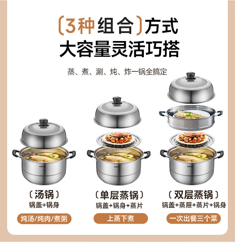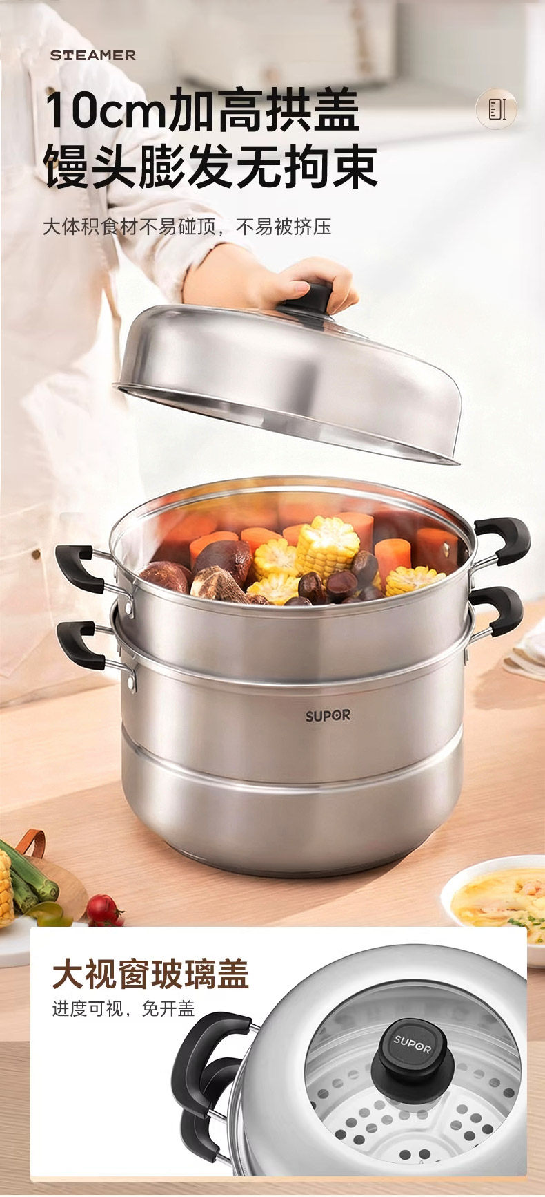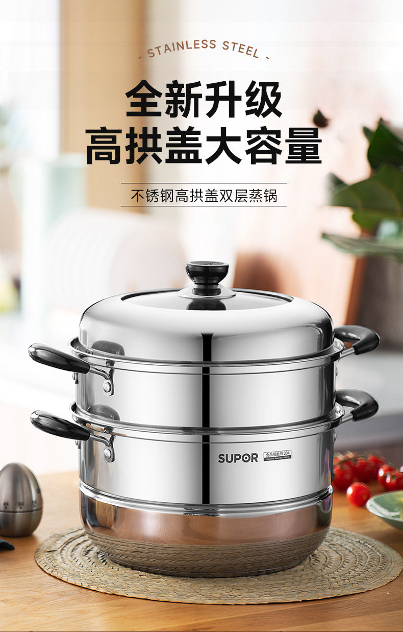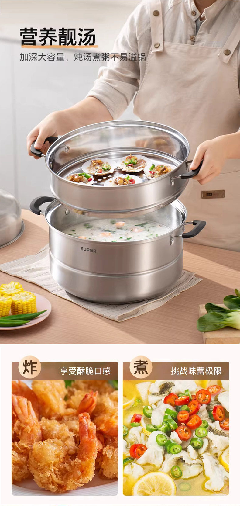 Supor Steamer Pot for Home Use, Stainless Steel Steamer for Steaming, Cooking, and Stewing, Thickened, Suitable for Induction Cookers and Gas Stoves, Soup Pot