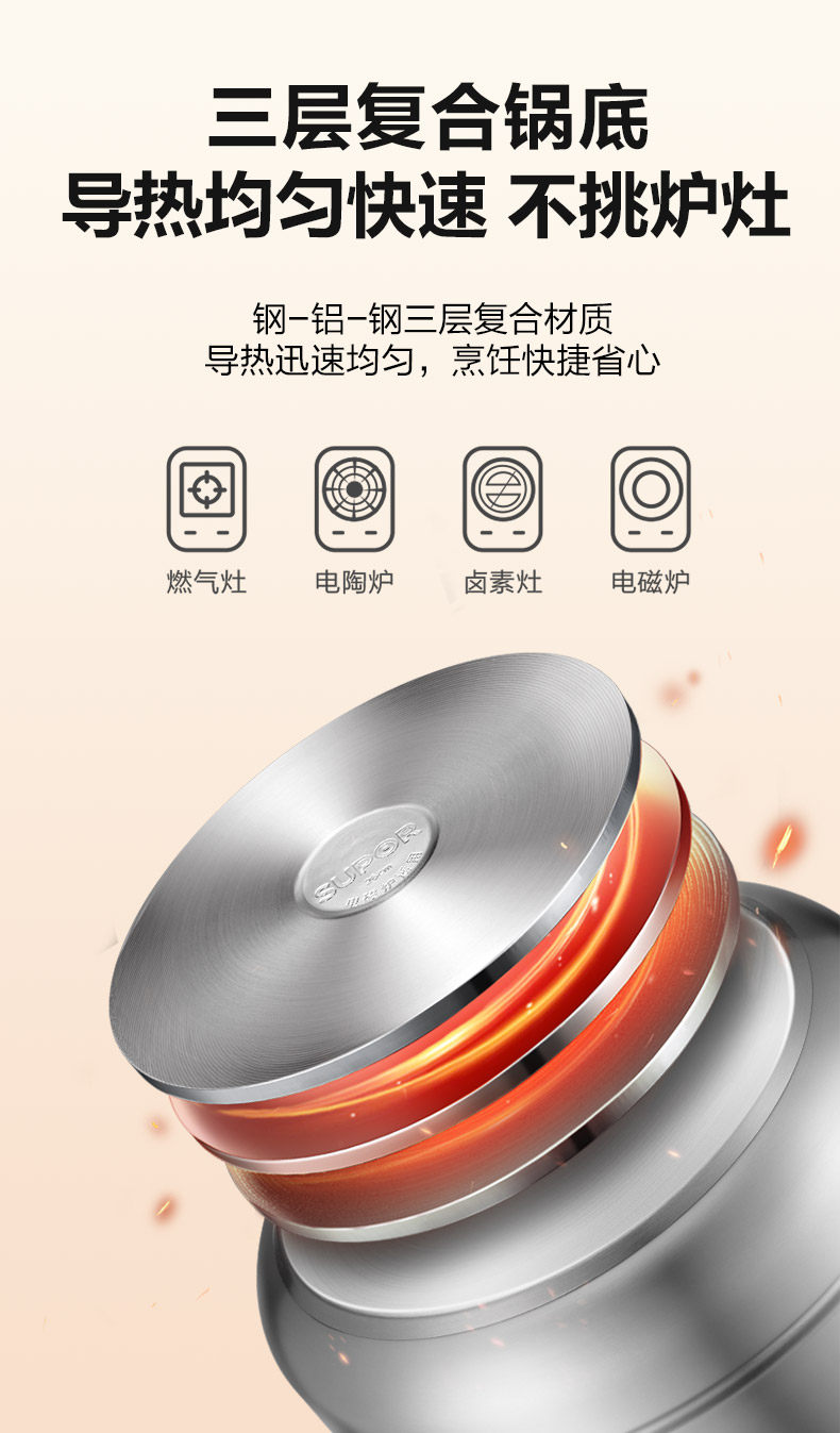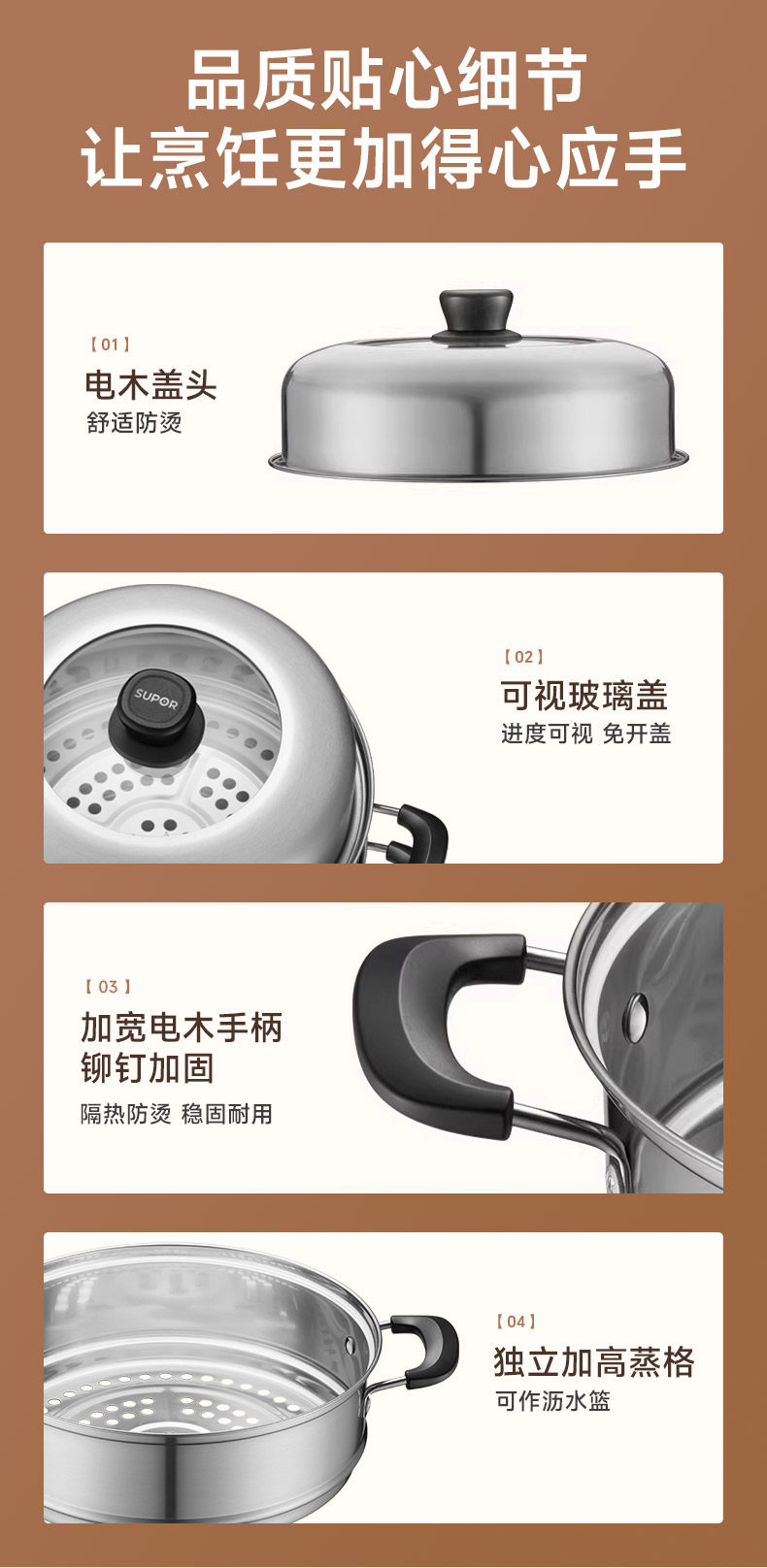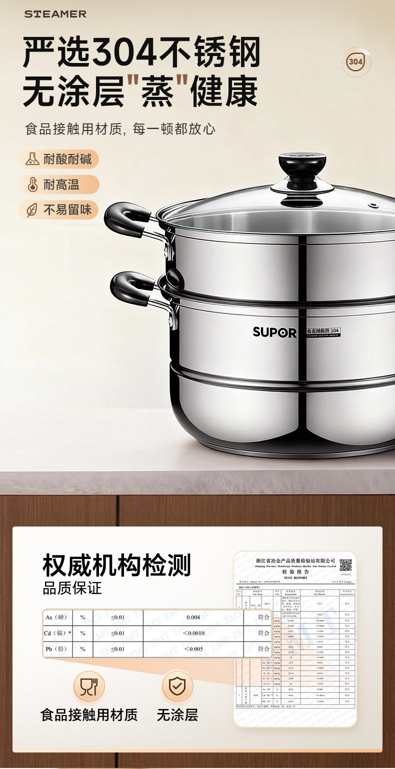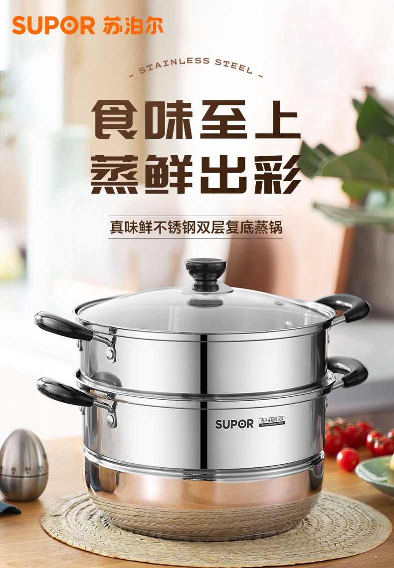 Supor Steamer Pot for Home Use, Stainless Steel Steamer for Steaming, Cooking, and Stewing, Thickened, Suitable for Induction Cookers and Gas Stoves, Soup Pot