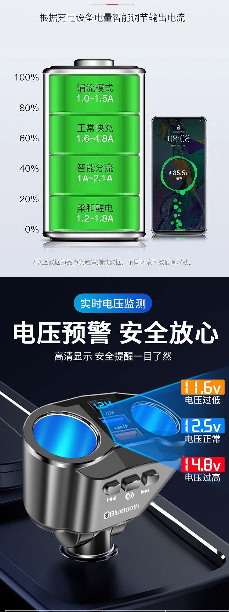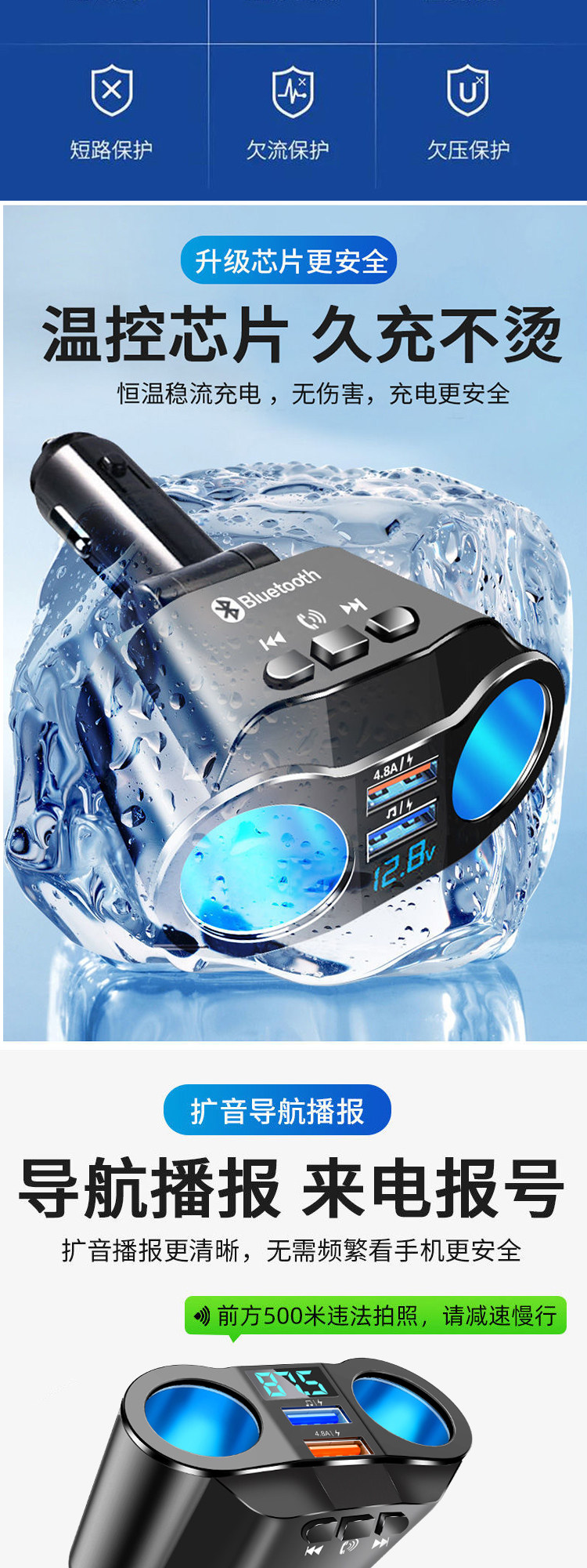 Car Charger with Bluetooth Receiver, Fast Charging, One-To-Three High-Power Car Cigarette Lighter Adapter, One-To-Two