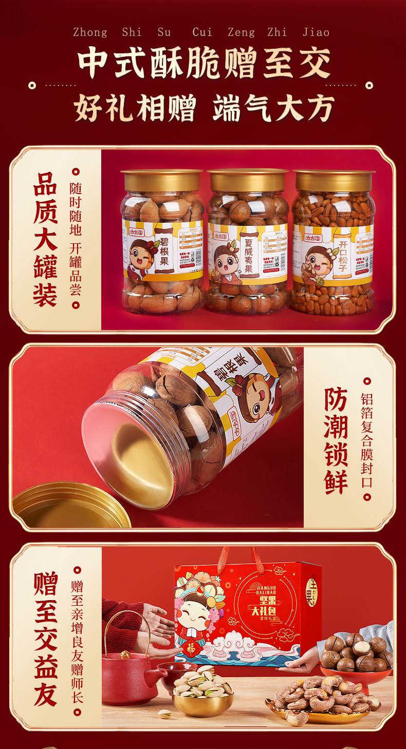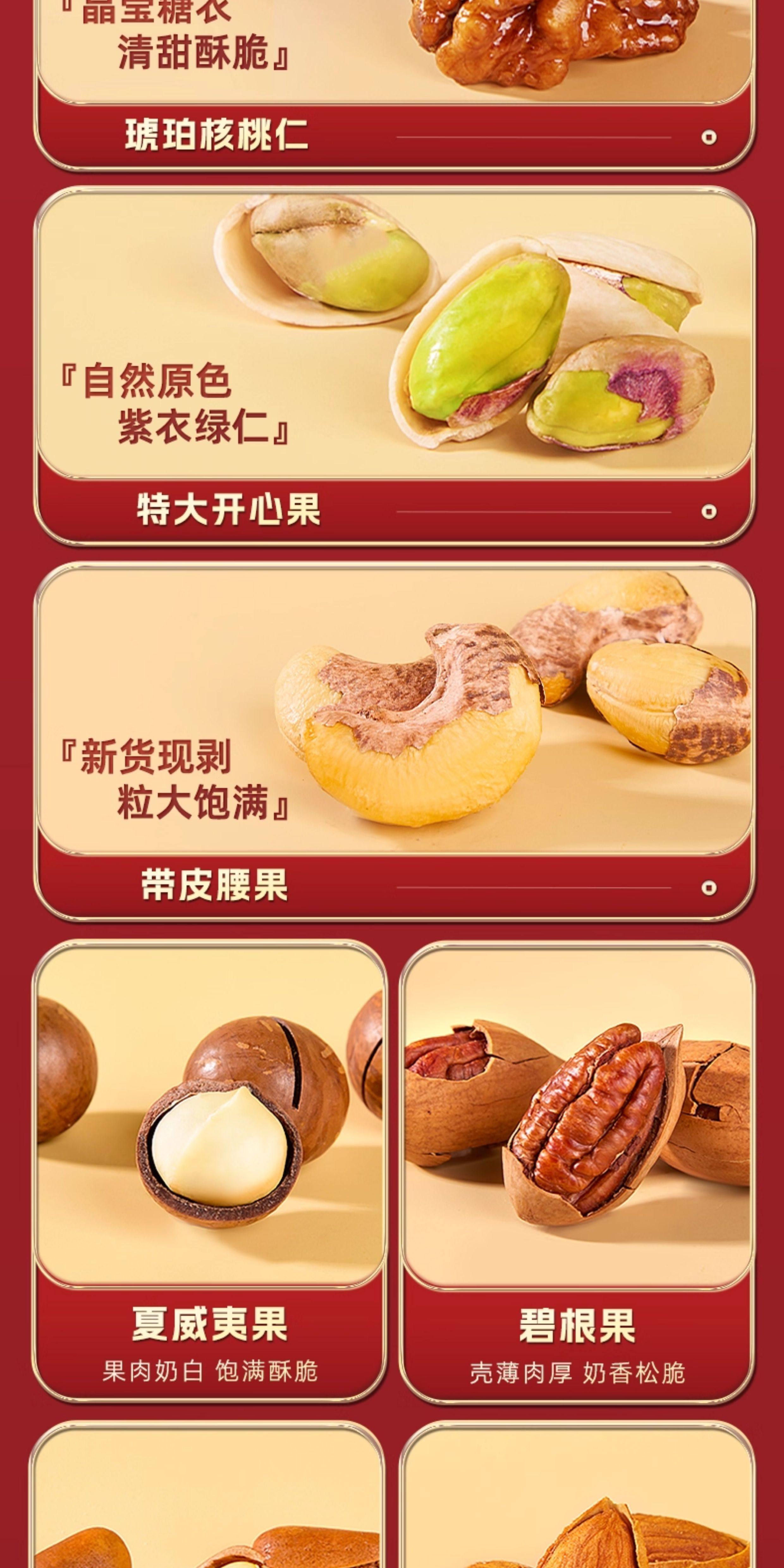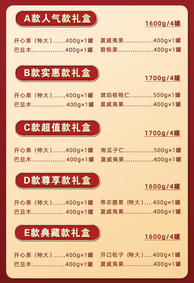 | Food Taste | [Type a Popular Style (Bulk Without Gift Box)] 2kg 500G/Can [Pistachios (Extra Large) + Macadamia Nuts + Almonds + Pecans],[Type B Affordable Model (Bulk Without Gift Box)] 2kg 500G/Can [Pistachios (Extra Large) + Macadamia Nuts + Almonds + Amber Walnut Kernels (Honey)],[Type C Value Pack (Bulk, No Gift Box)] 2kg 500G/Jar [Pistachios (Extra Large) + Macadamia Nuts + Almonds + Pumpkin Seeds],[Type D Exclusive Model (Bulk Without Gift Box)] 2kg 500G/Can [Pistachios (Extra Large) + Macadamia Nuts + Almonds + Cashew Nuts with Skin],[Type E Collection (Bulk Without Gift Box)] 2kg 500G/Can [Pistachios (Extra Large) + Macadamia Nuts + Almonds + Northeast Pine Nuts],[Type a Gift Box] 2kg 500G/Can [Pistachios (Extra Large) + Macadamia Nuts + Almonds + Pecans],[Type B Gift Box] 2kg 500G/Can [Pistachios (Extra Large) + Macadamia Nuts + Almonds + Amber Walnut Kernels (Honey)],[Type C Gift Box] 2kg 500G/Can [Pistachios (Extra Large) + Macadamia Nuts + Almonds + Pumpkin Seeds],[Type D Gift Box] 2kg 500G/Can [Pistachios (Extra Large) + Macadamia Nuts + Almonds + Cashew Nuts with Skin],[Type E Gift Box] 2kg 500G/Can [Pistachios (Extra Large) + Macadamia Nuts + Almonds + Northeastern Pine Nuts],[Popular Style a (Bulk Without Gift Box)] 4 Cans [Pistachios (Extra Large) + Macadamia Nuts + Almonds + Pecans],[Type B Affordable Model (Bulk Without Gift Box)] 4 Cans [Pistachios (Extra Large) + Macadamia Nuts + Almonds + Amber Walnut Kernels (Honey)],[Type C Value Pack (Bulk, No Gift Box)] 4 Jars [Pistachios (Extra Large) + Macadamia Nuts + Almonds + Pumpkin Seeds],[Type D Exclusive (Bulk Without Gift Box)] 4 Cans [Pistachios (Extra Large) + Macadamia Nuts + Almonds + Cashew Nuts with Skin],【E Collection (Bulk, No Gift Box)】4 Jars: [Extra Large Pistachios + Macadamia Nuts + Almonds + Northeast Pine Nuts],[Type a Gift Box] 4 Cans [Pistachios (Extra Large) + Macadamia Nuts + Almonds + Pecans],[Type B Gift Box] 4 Cans [Pistachios (Extra Large) + Macadamia Nuts + Almonds + Amber Walnut Kernels (Honey)],[Type C Gift Box] 4 Cans [Pistachios (Extra Large) + Macadamia Nuts + Almonds + Pumpkin Seeds],[Type D Gift Box] 4 Cans [Pistachios (Extra Large) + Macadamia Nuts + Almonds + Cashew Nuts with Skin],[Type E Gift Box] 4 Cans [Pistachios (Extra Large) + Macadamia Nuts + Almonds + Northeastern Pine Nuts] |